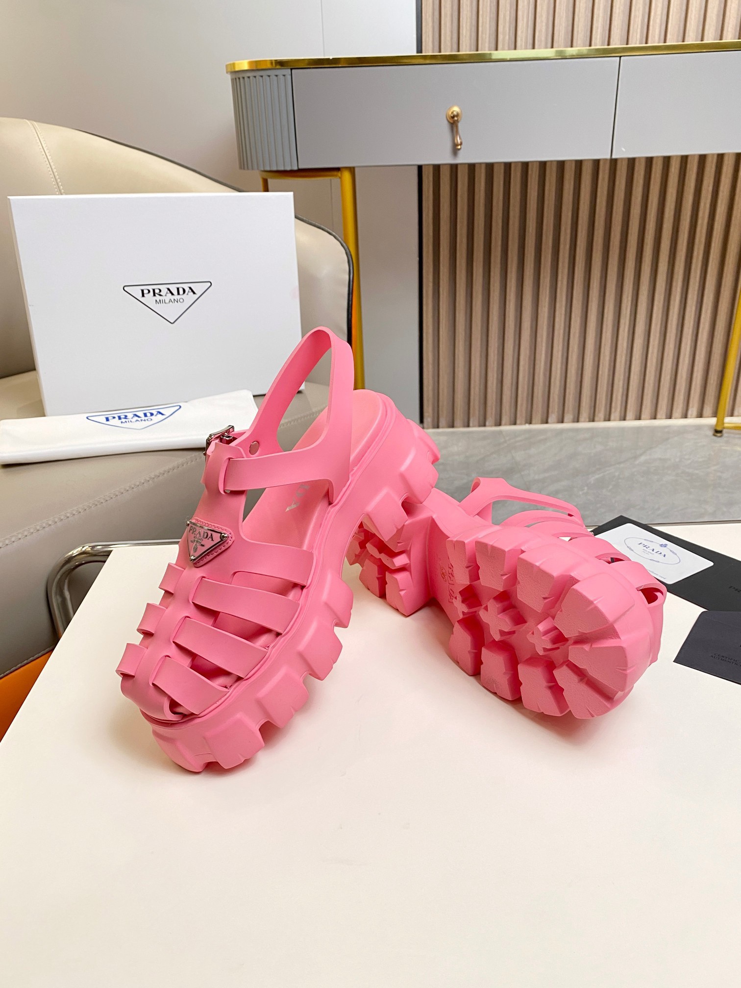 The chunky yet lightweight design of the iconic Monolith sole made of rubber is an expression of a timeless design, monolithic and unique, that reimagines Prada’s dual soul with a modernist twist. Made of rubber for a fun, contemporary look, the silhouette reinterprets retro beach footwear in a totally new way that reflect Prada’s hybrid soul.