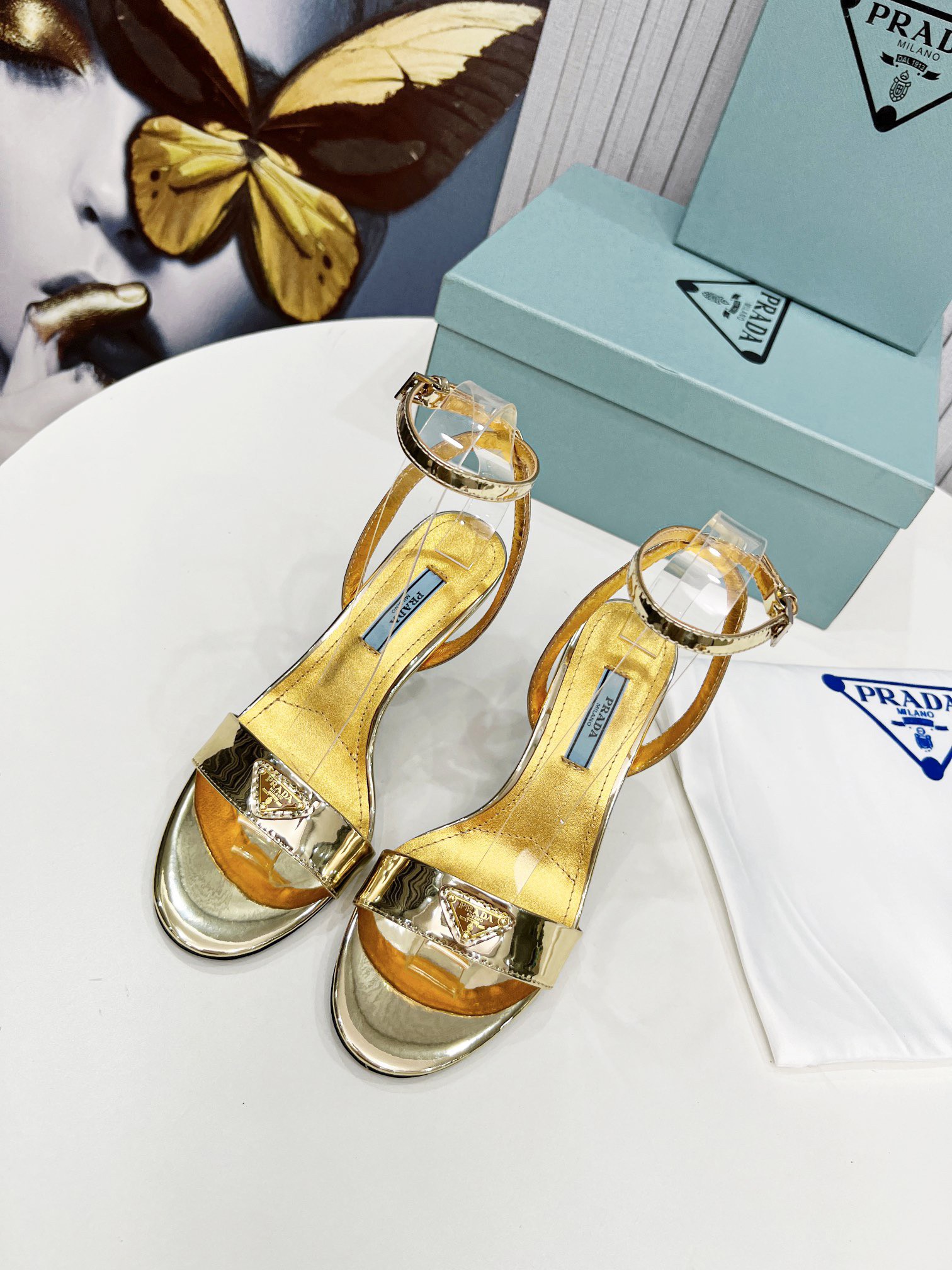 Prada’s iconic triangle logo decorates these elegant sandals. Metallic leather adds a luxurious and bold look to these leather sandals decorated with the iconic enameled metal triangle logo.