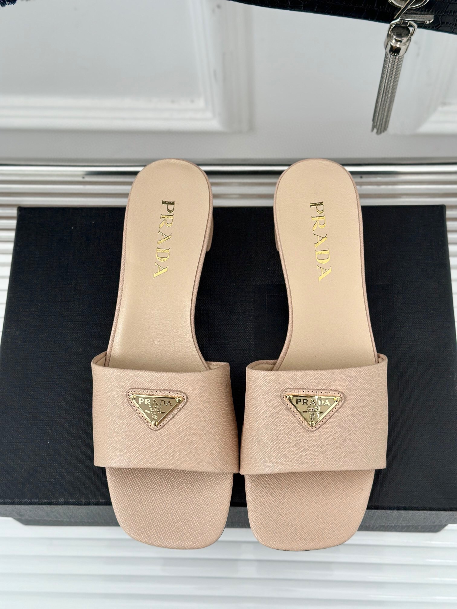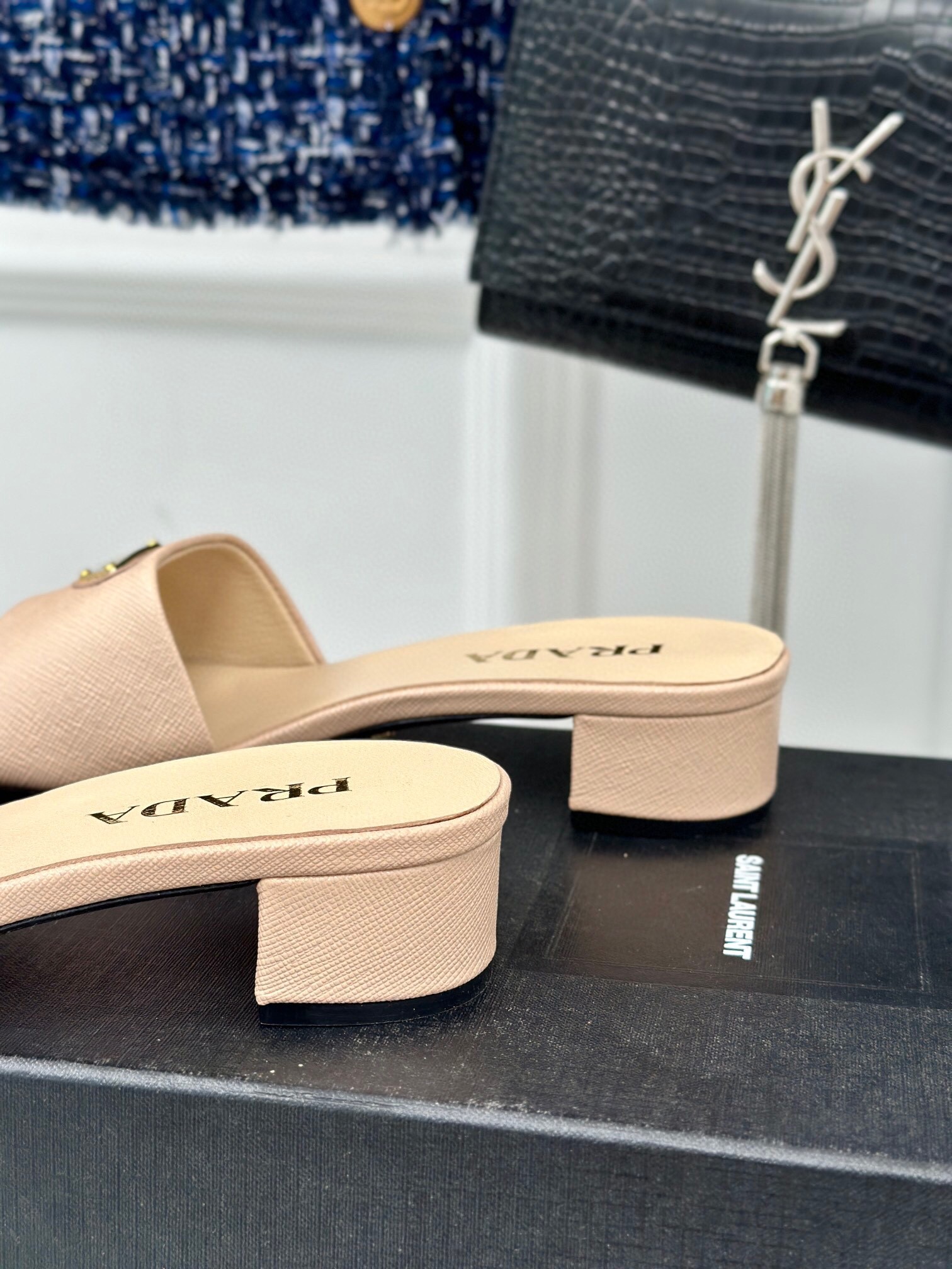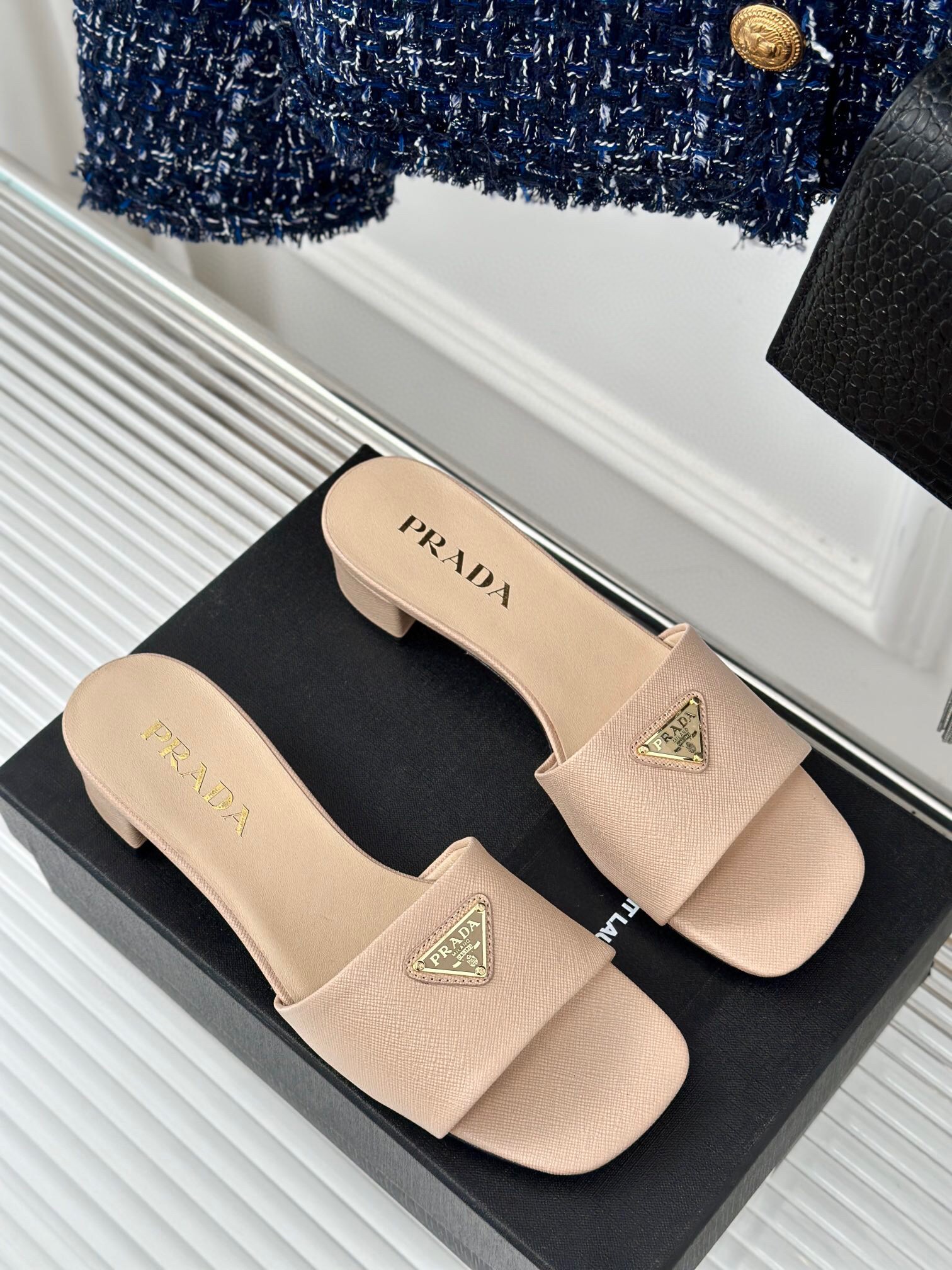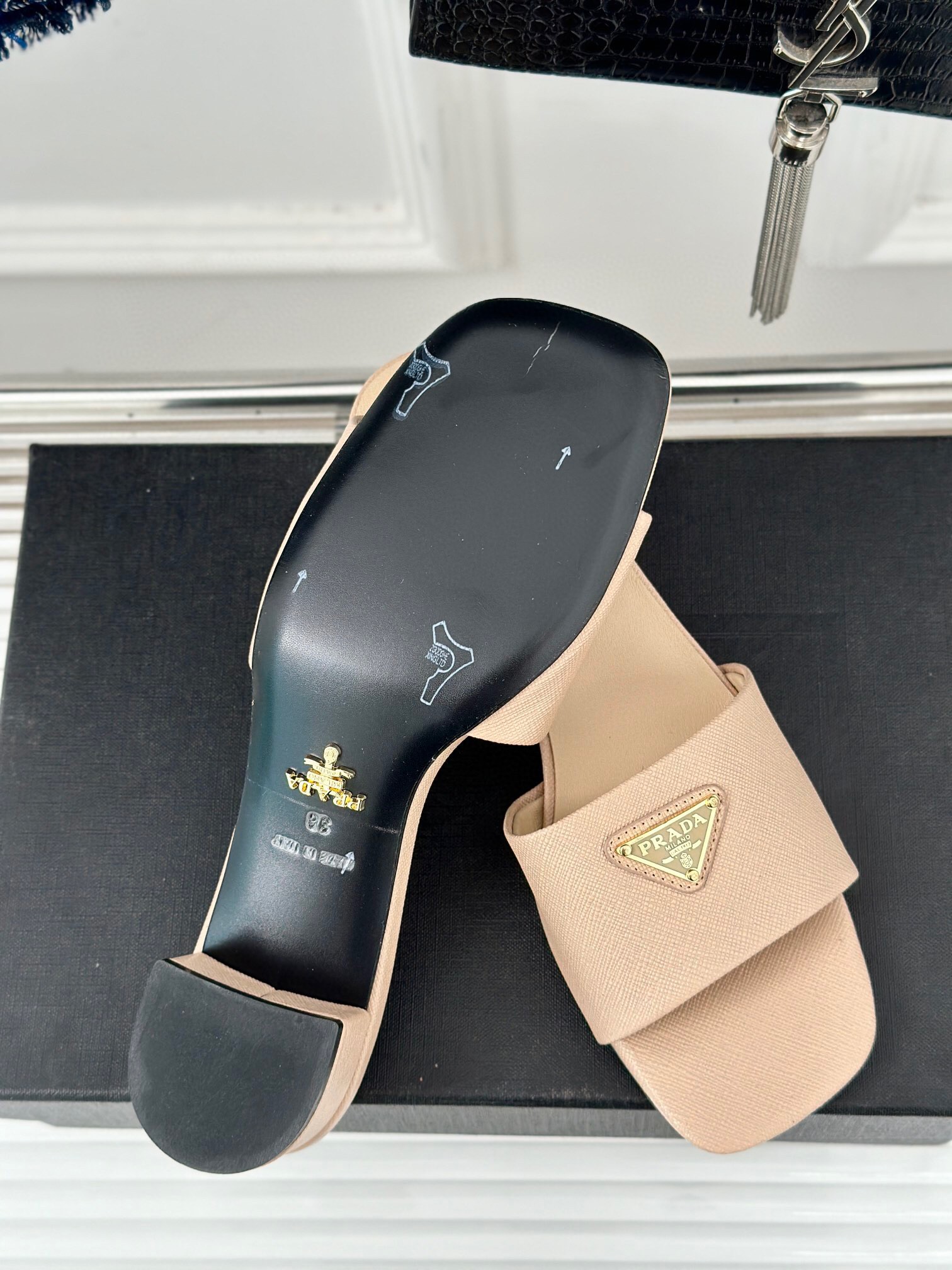 The distinctive crosshatch pattern of Saffiano leather, a signature material of Prada collections, meets the Saffiano leather in these sandals set on a 35mm leather-covered heel with a contemporary design. The sophisticated and versatile style defined by clean, sleek lines is enriched with the iconic enameled metal triangle logo.