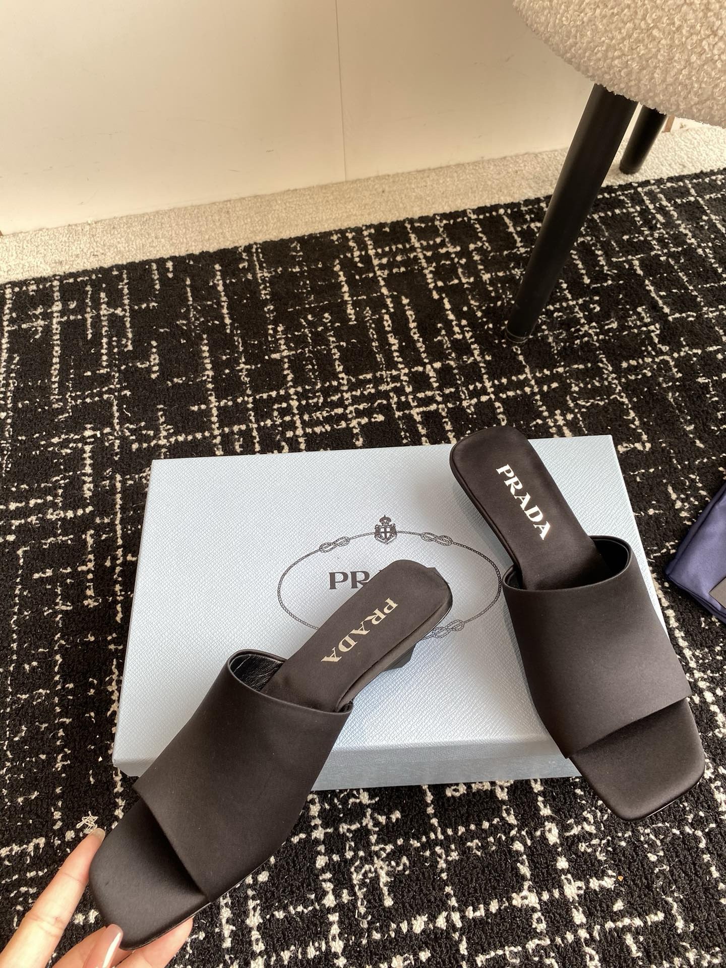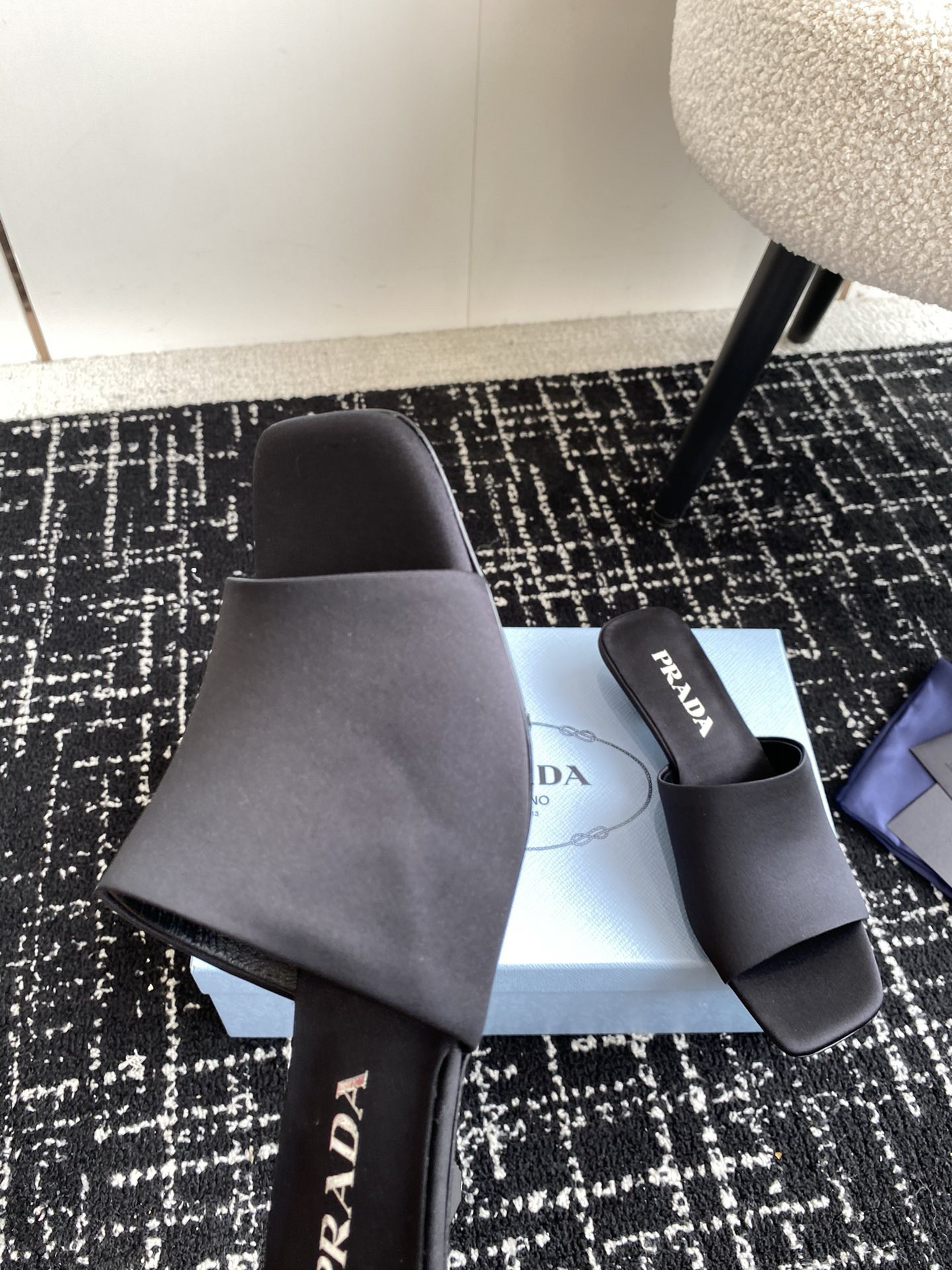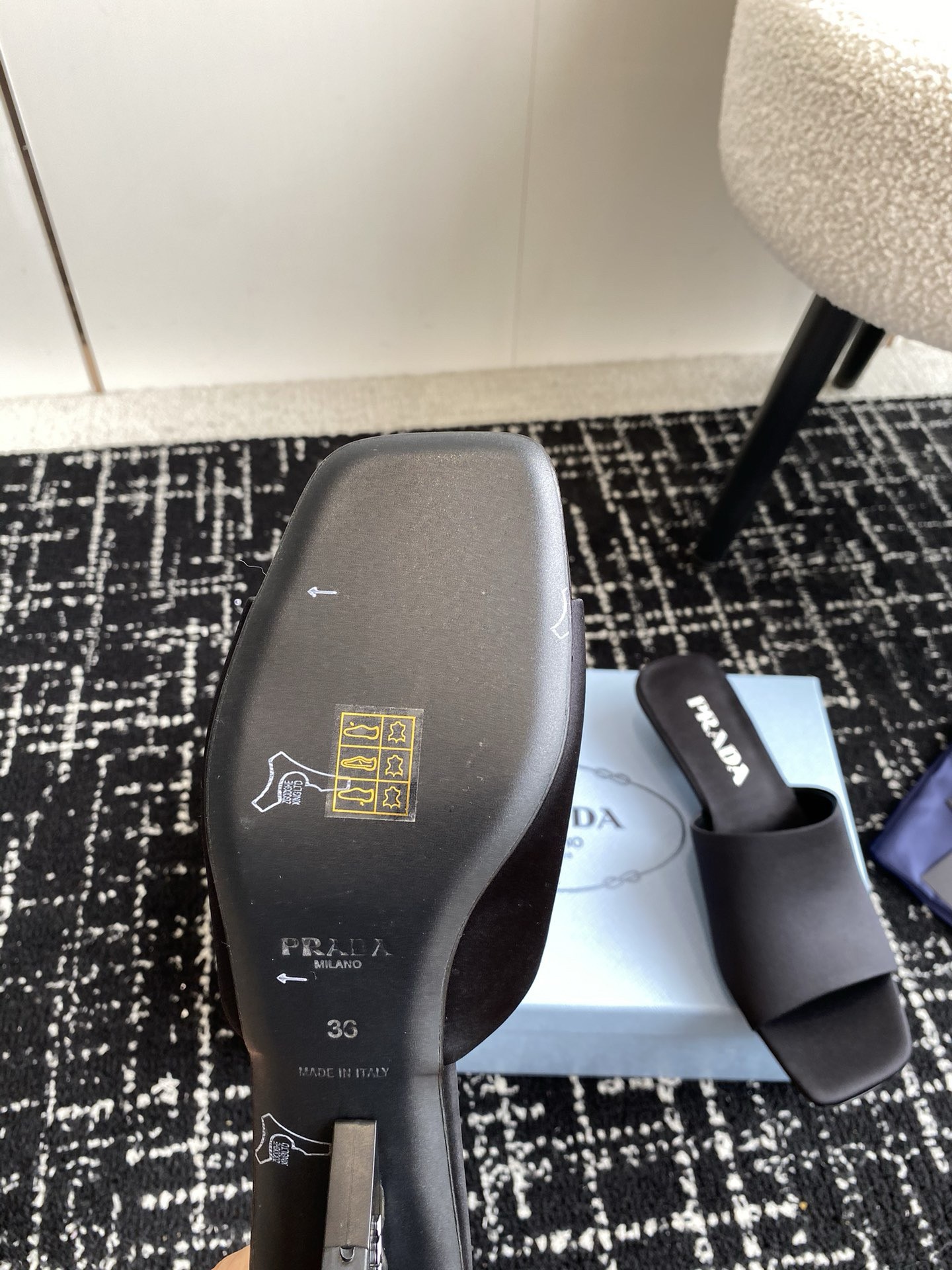Modernist lines and original architectural volumes define these satin slides with sophisticated allure. The iconic geometric shape of the Prada triangle inspires the design of the heel that enhances the tapered and feminine silhouette with a unique, contemporary touch.