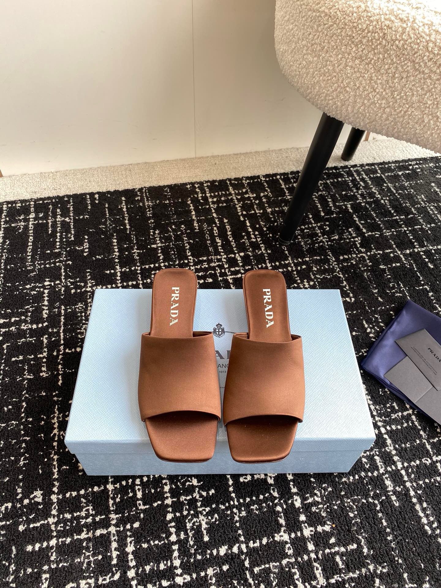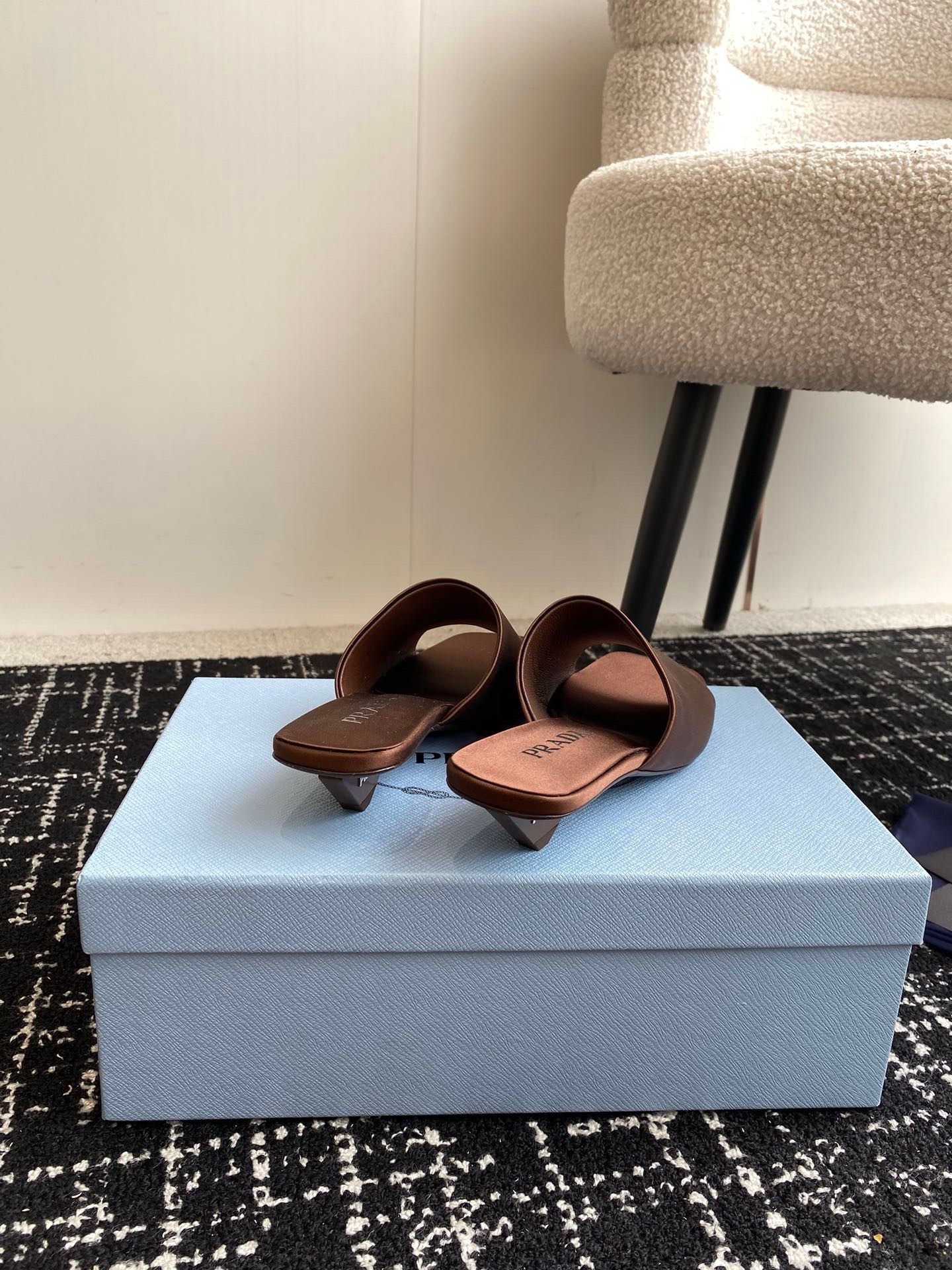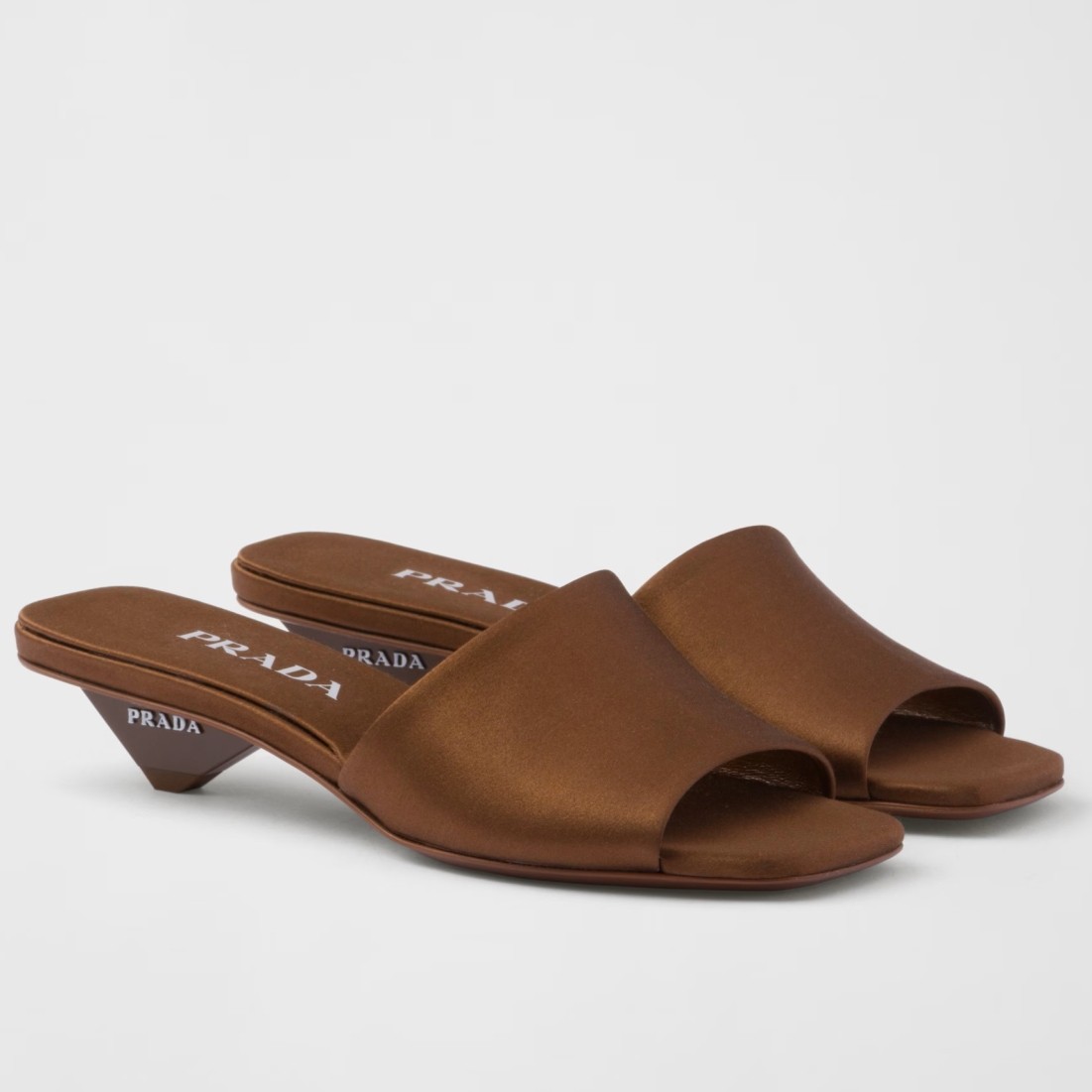 Modernist lines and original architectural volumes define these satin slides with sophisticated allure. The iconic geometric shape of the Prada triangle inspires the design of the heel that enhances the tapered and feminine silhouette with a unique, contemporary touch.