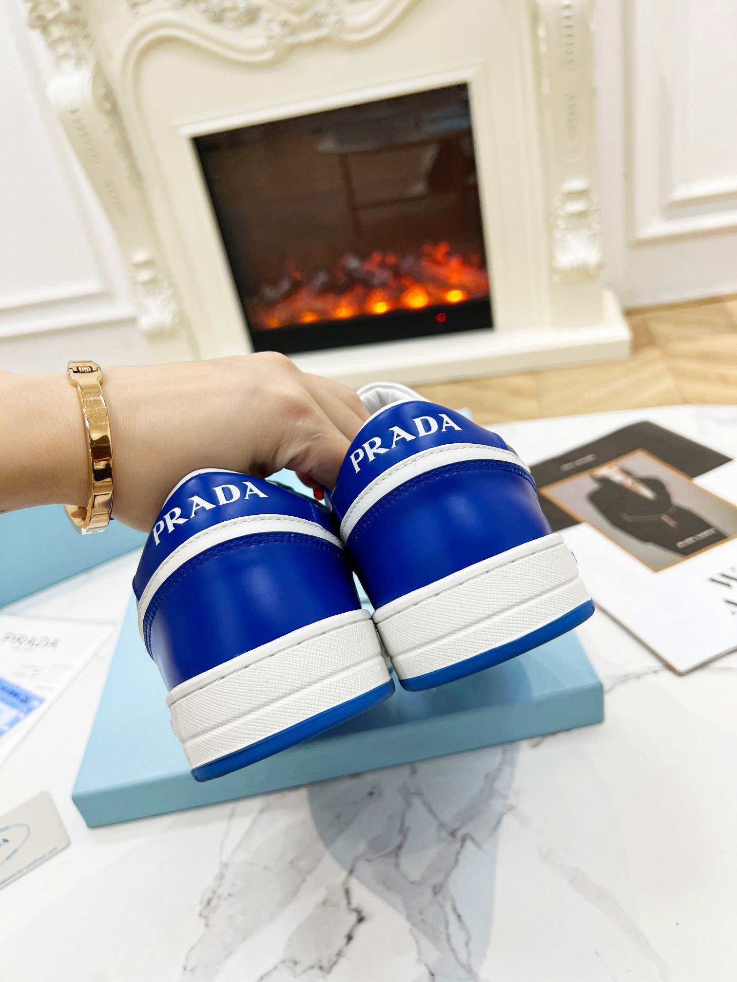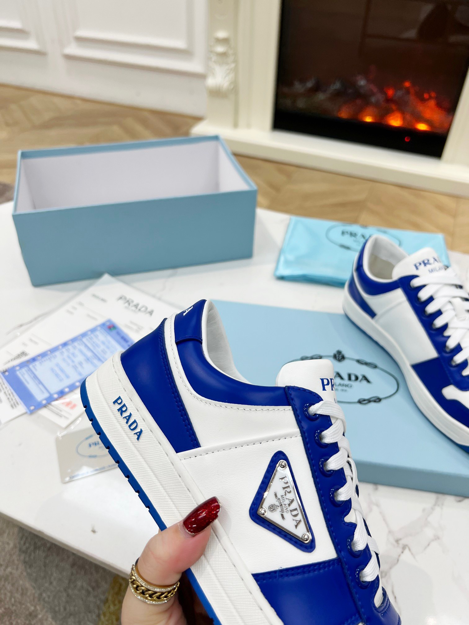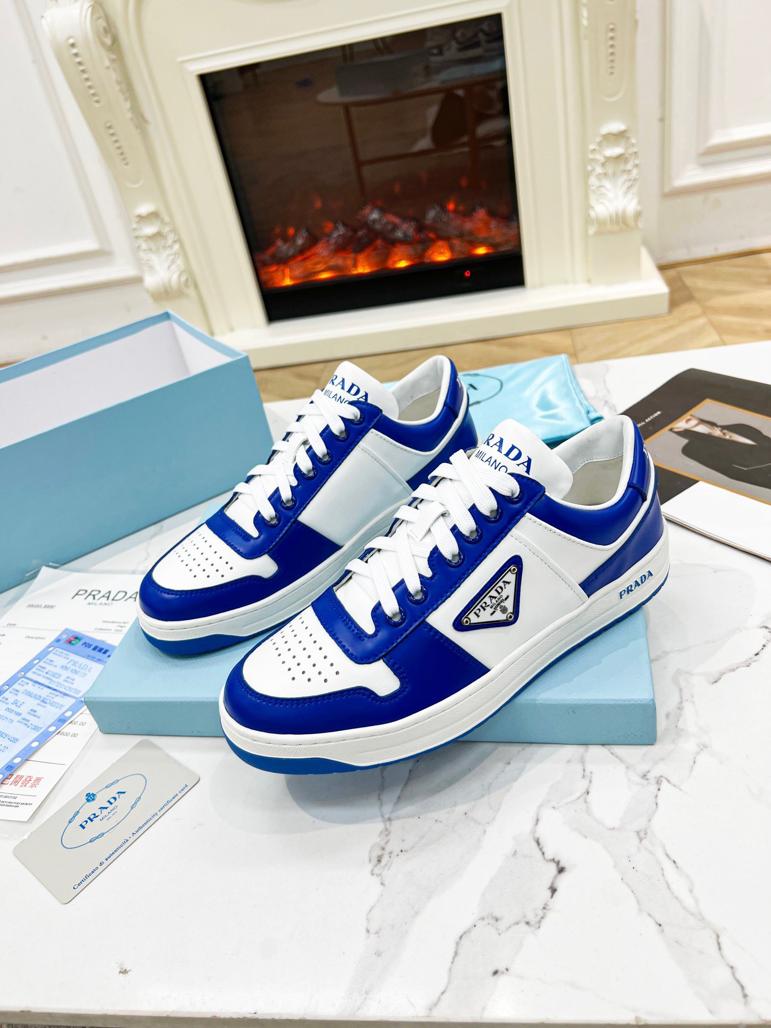 Prada Men’s Downtown Sneakers in White and Blue Leather