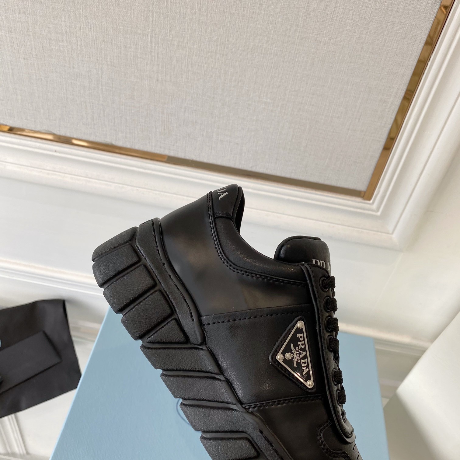 – Enameled-triangle appliqué on the upper and silk-screen Prada Milano logo on the tongue