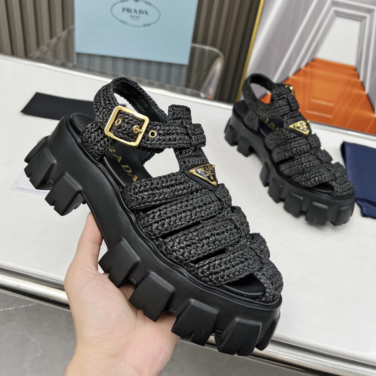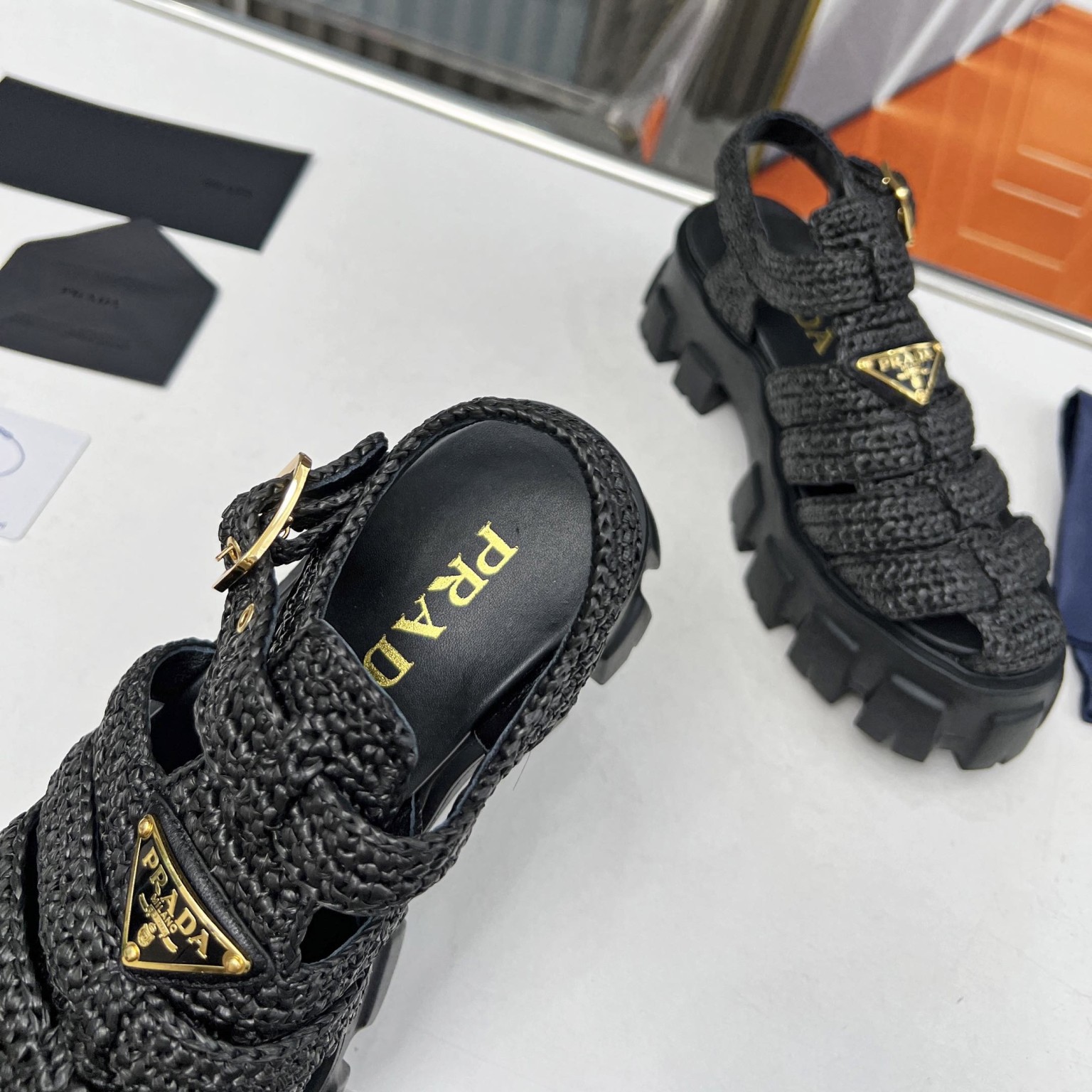 Prada Monolith Crochet Cage Sandals in Black Raffia Fabric