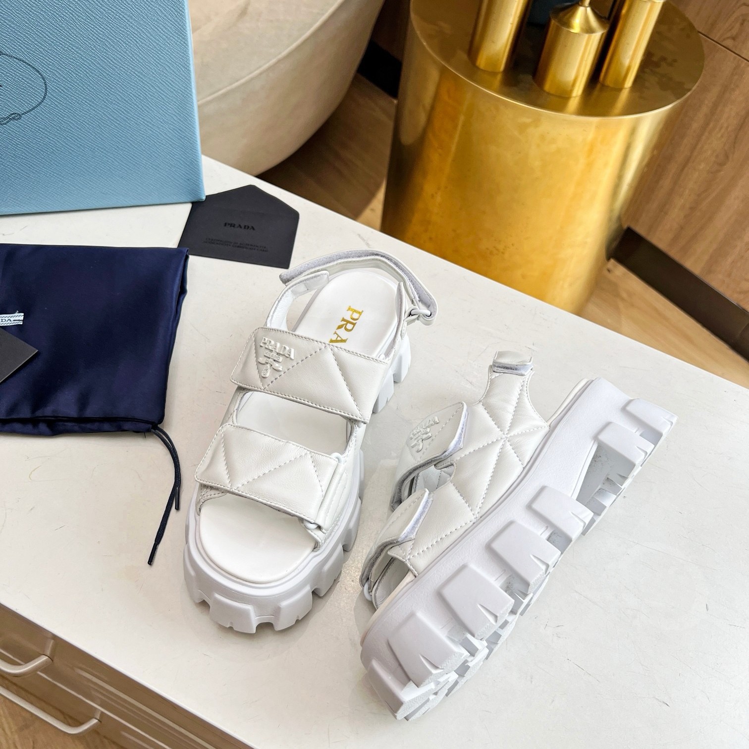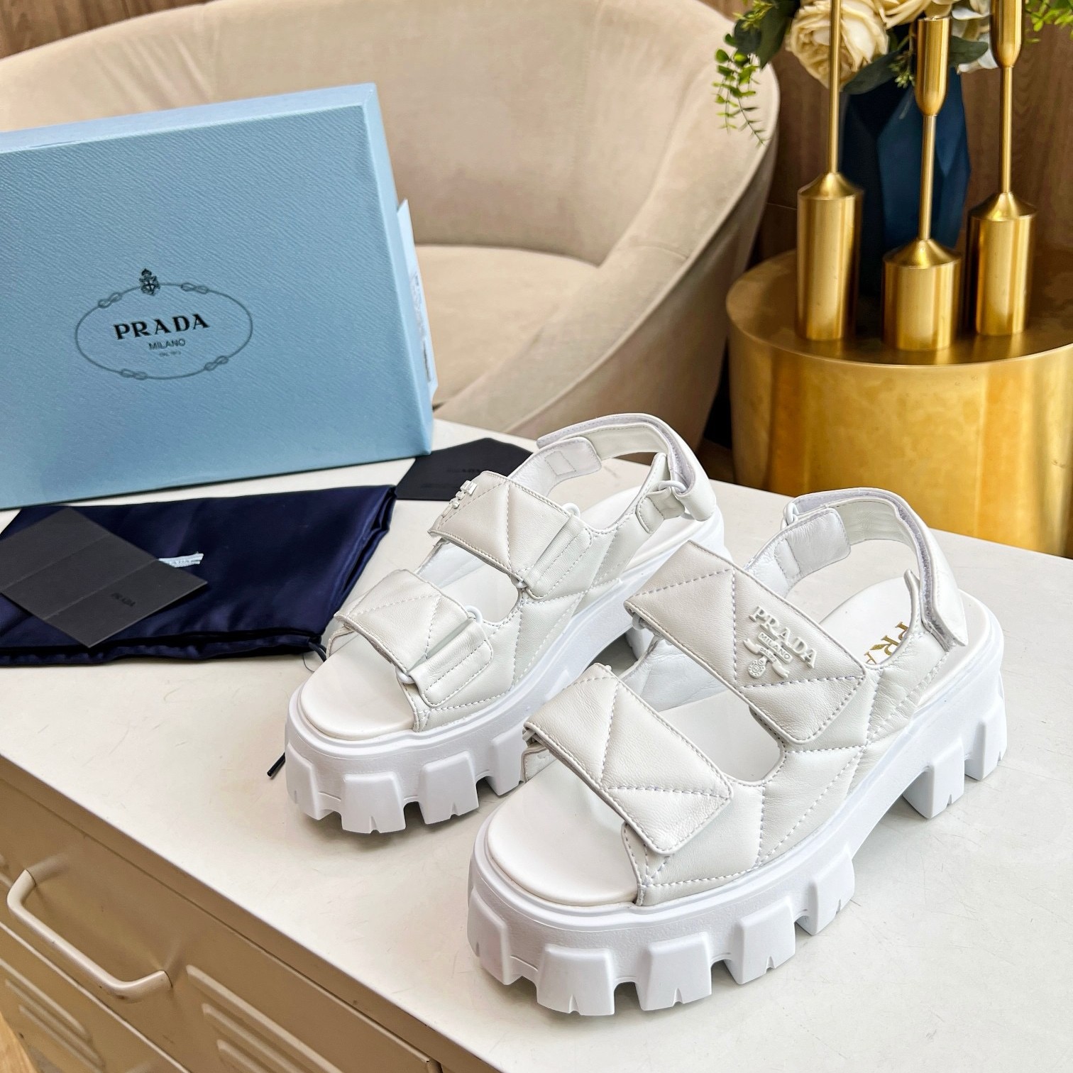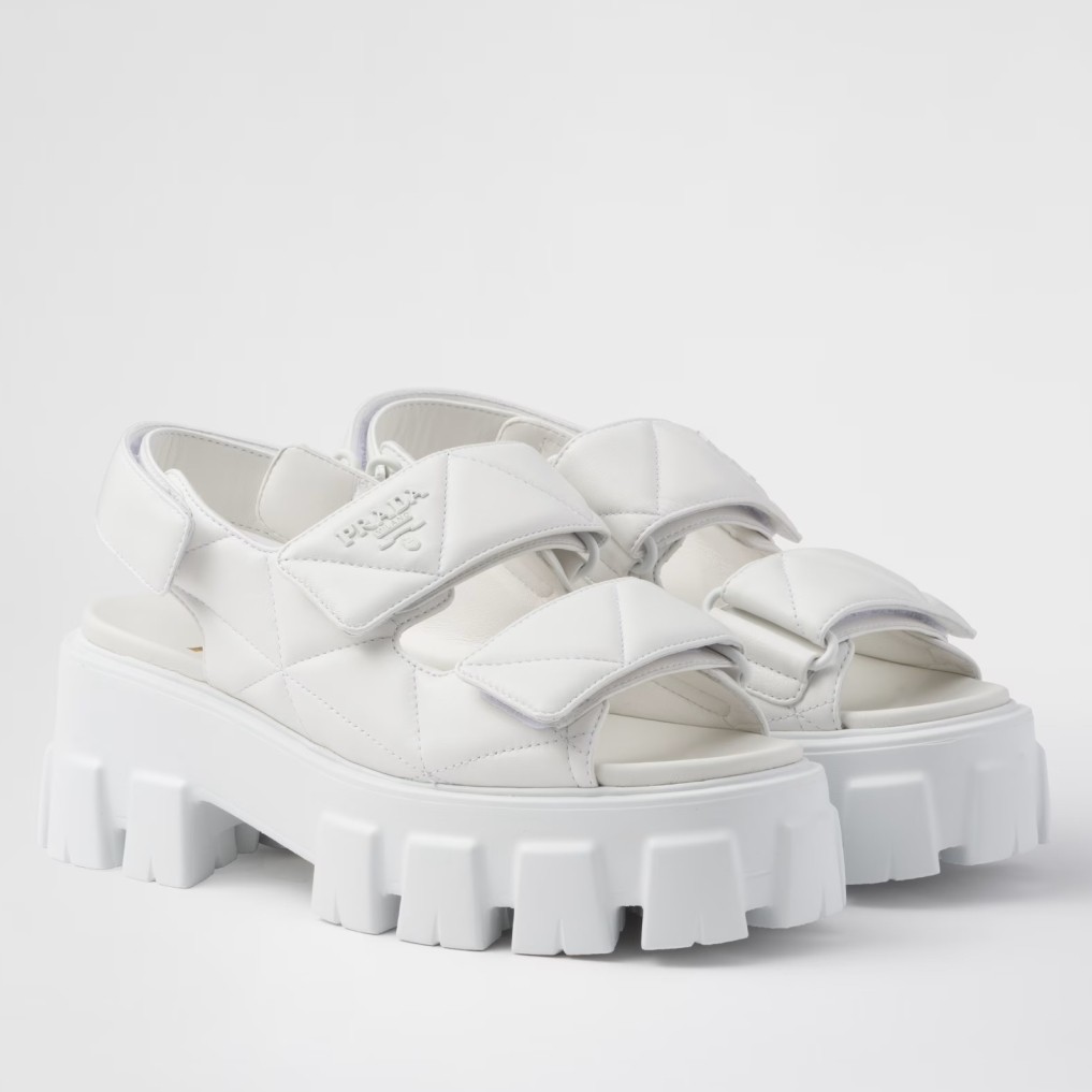 These flatform sandals with a modern menswear-inspired silhouette are enhanced by the quilted detail that echoes the iconic shape of the Prada triangle. The sporty style made of nappa leather is enriched by the distinctive Monolith sole that combines important volumes with light rubber, becoming an expression of Prada’s dual soul.