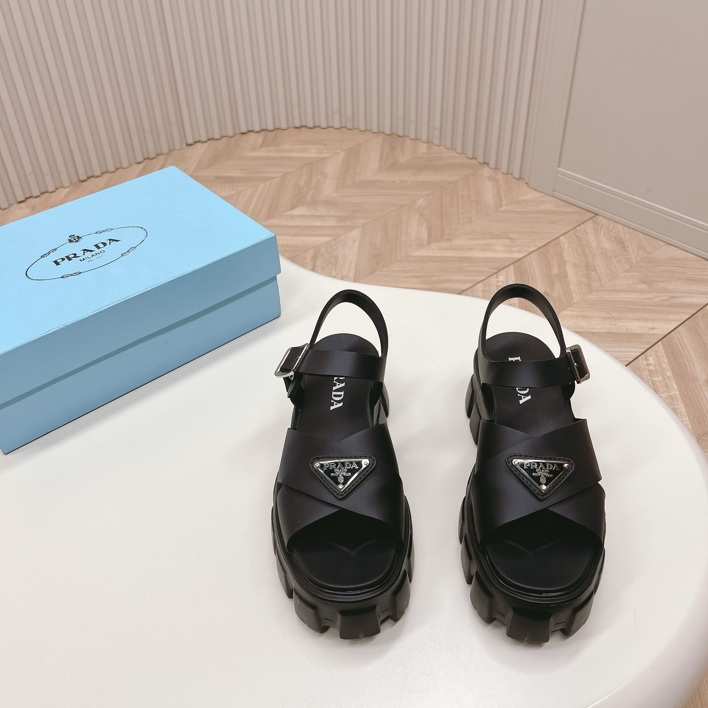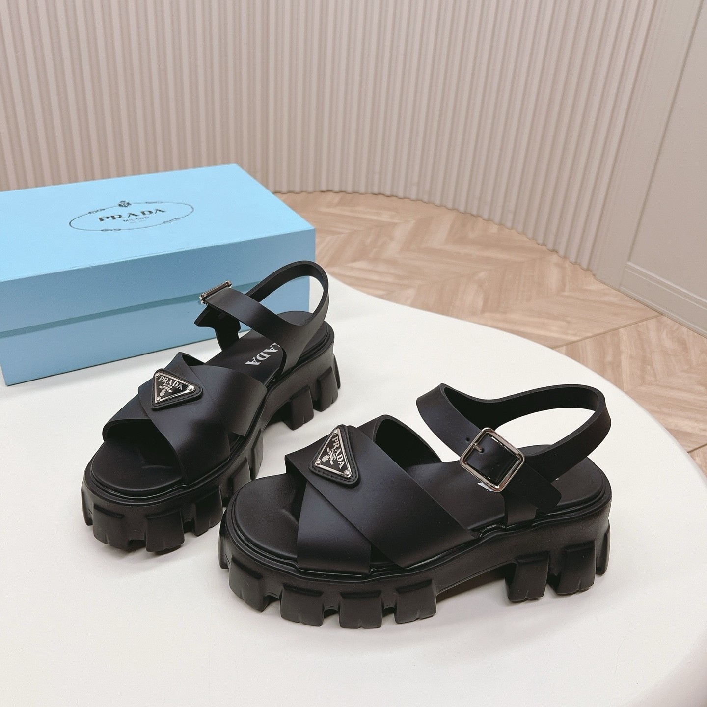 These rubber sandals with sporty touches and contemporary details are an emblem of Prada’s unconventional and dual soul. The style characterized by the distinctive Monolith sole is completed by the iconic signature of the enameled metal triangle logo.