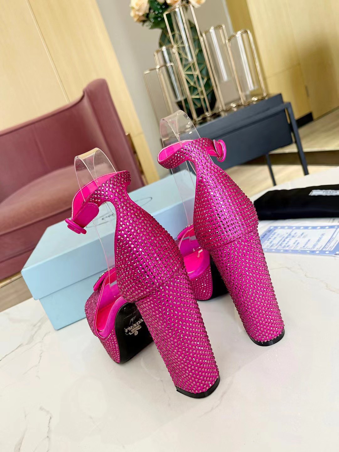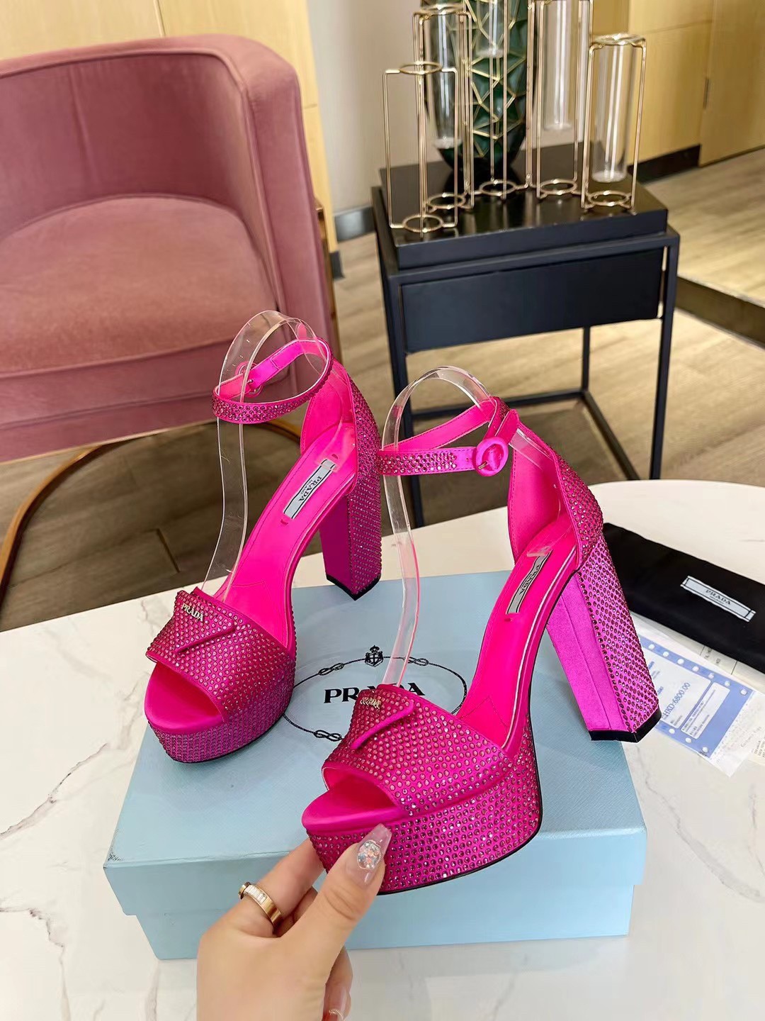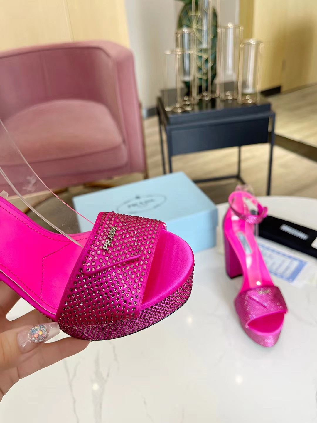 Bold allure characterizes these high-heeled satin platform sandals studded with crystals that create a play of light and iridescent reflections on the surface. The triangle logo appearing as a slightly padded leather detail adds a modernist note.
