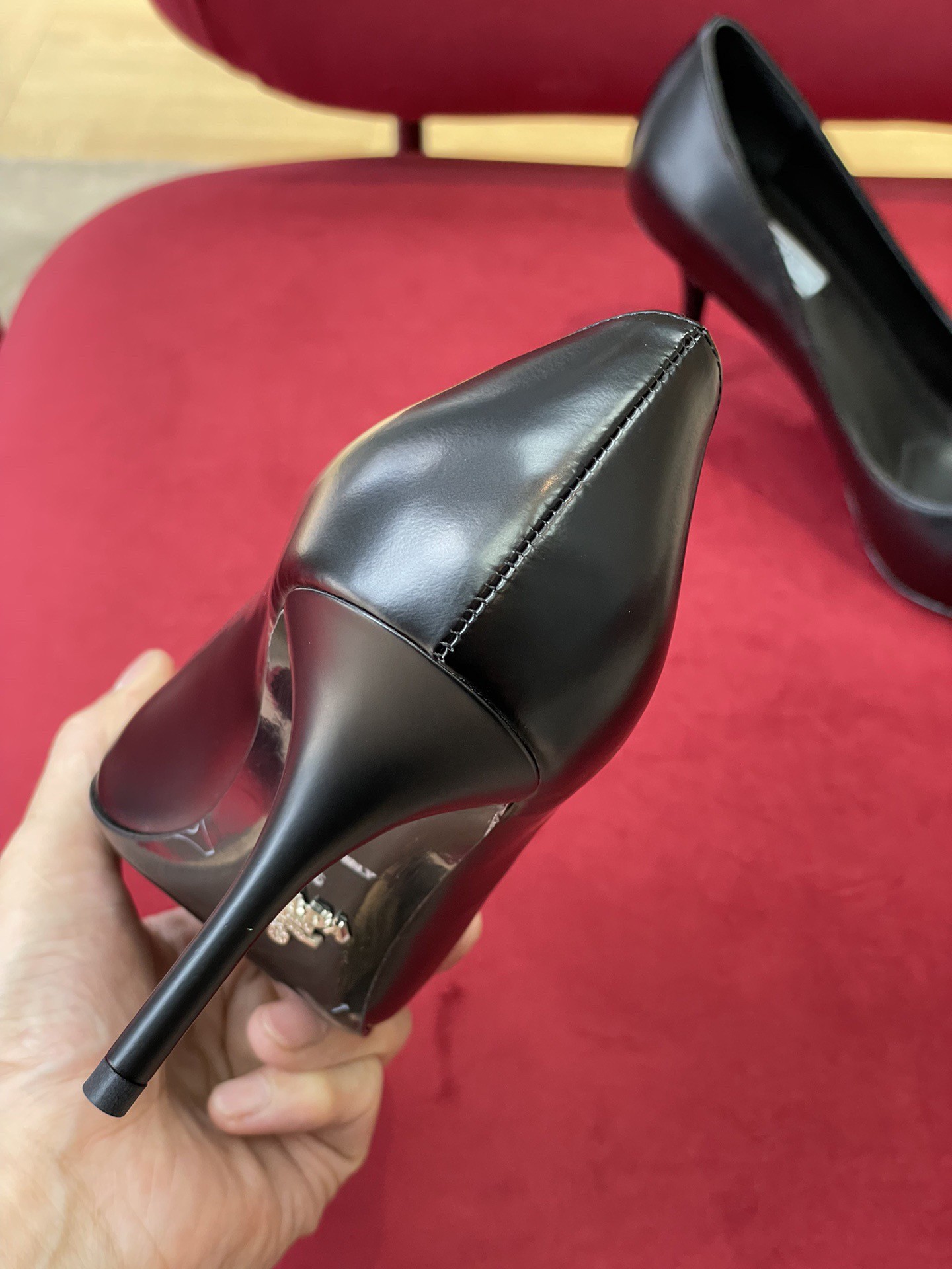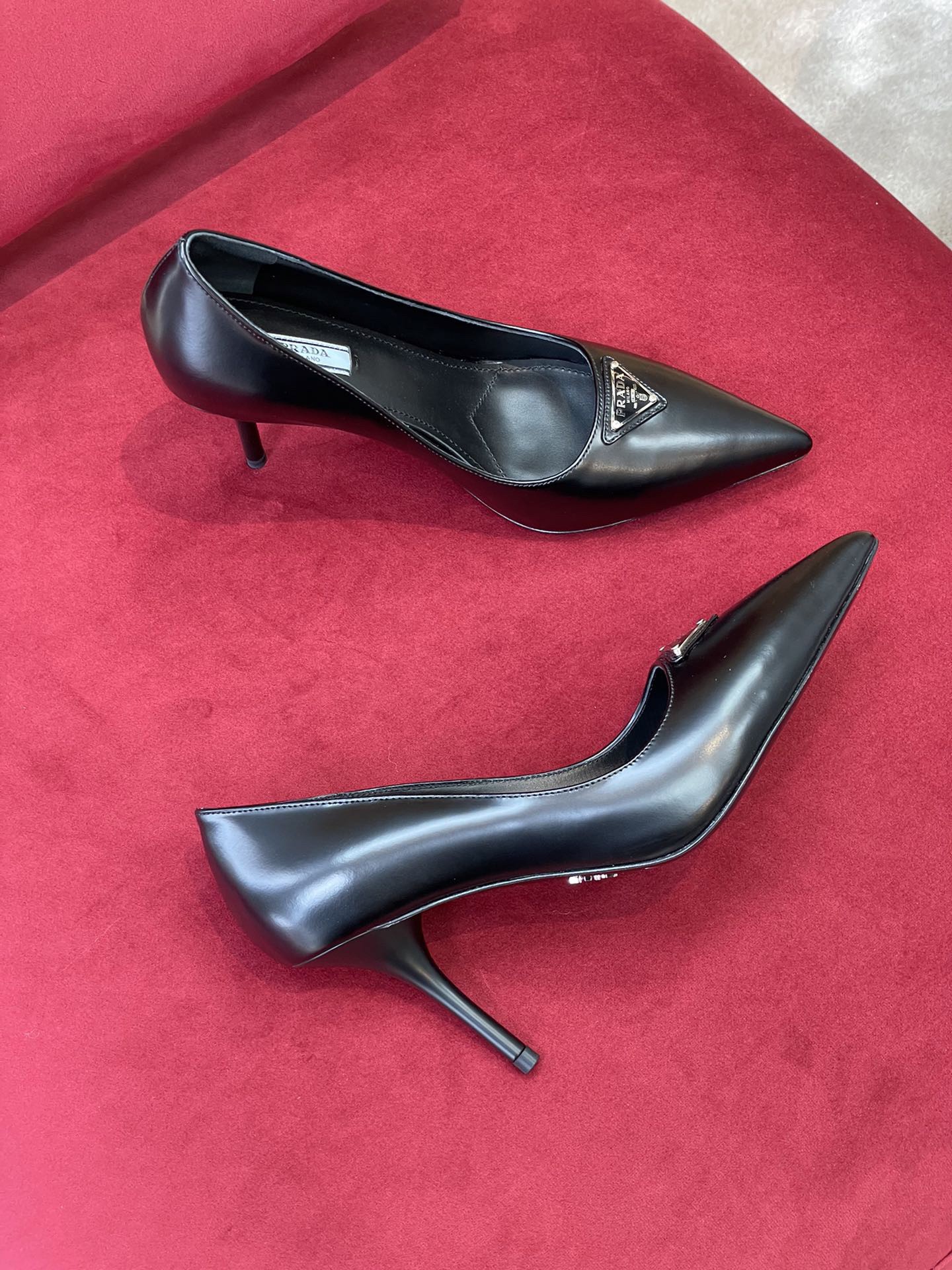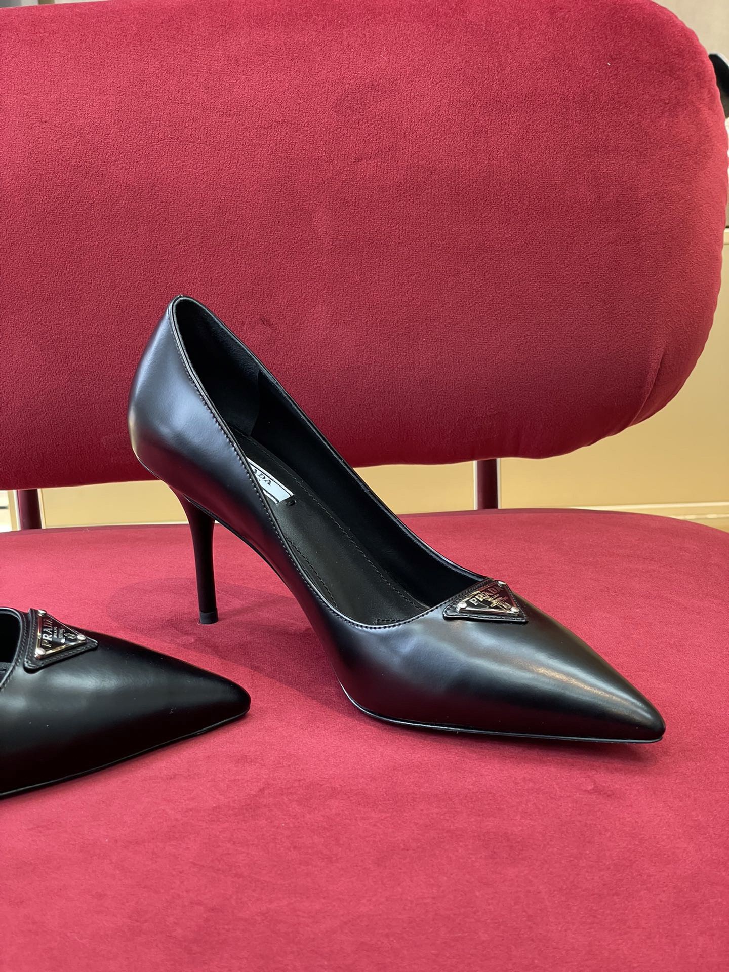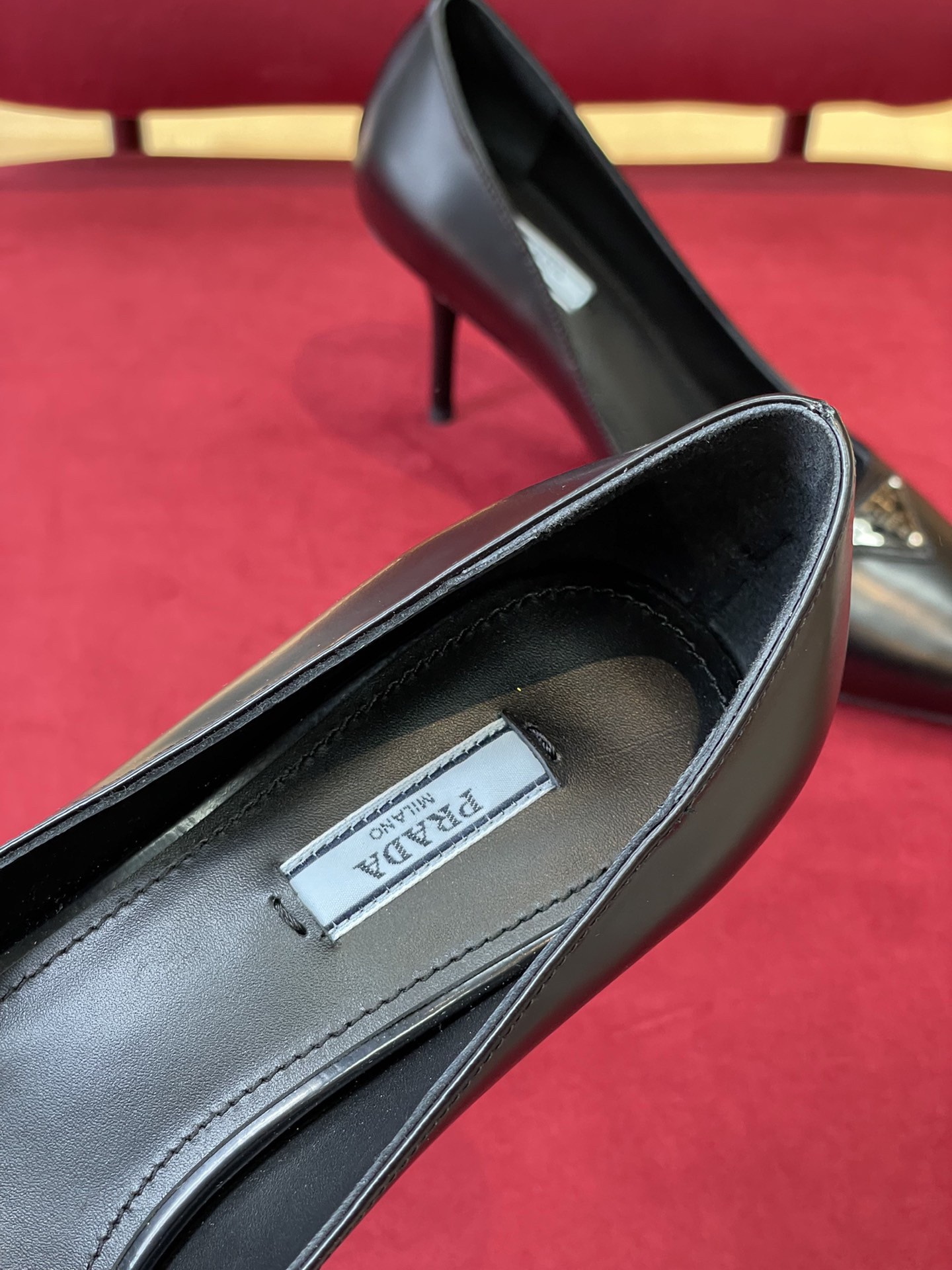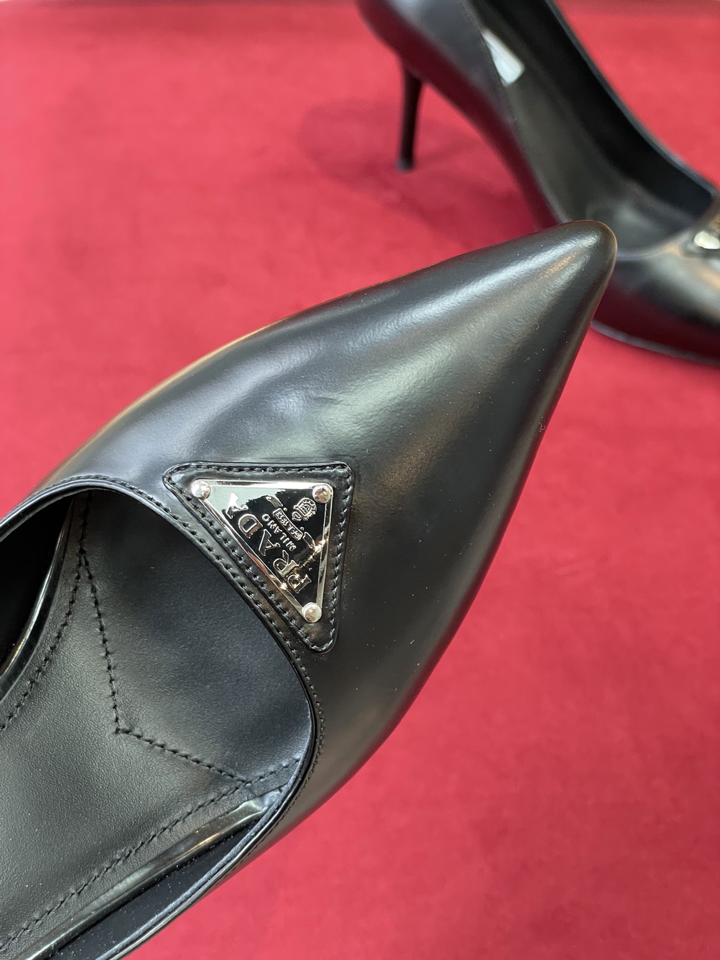 Prada’s iconic triangle logo decorates these pumps with sleek allure. Traditionally used for fine classic footwear, since the 90s brushed leather has been reinterpreted in Prada collections on contemporary designs for a hybrid result that reflects the brand’s duality.