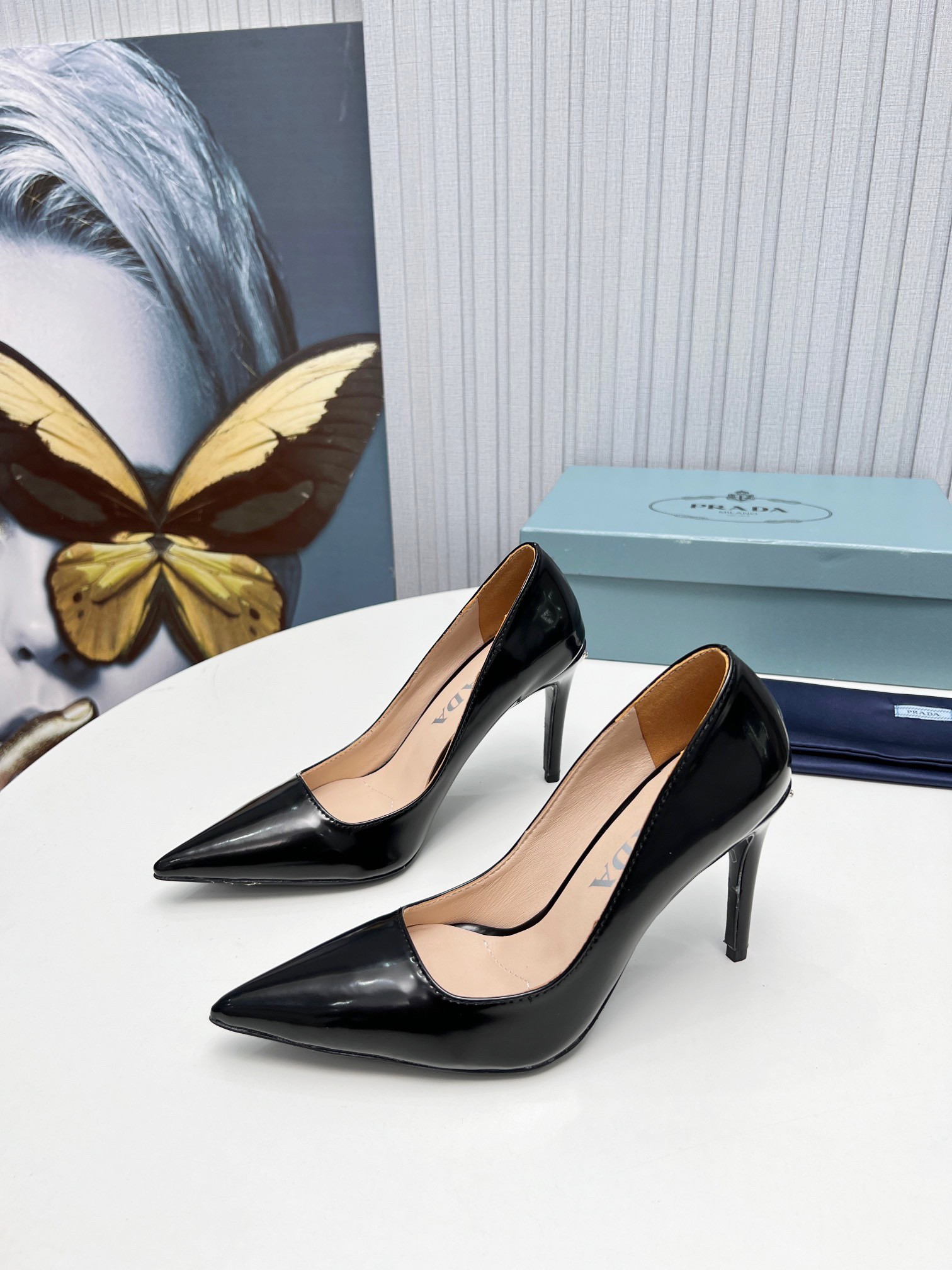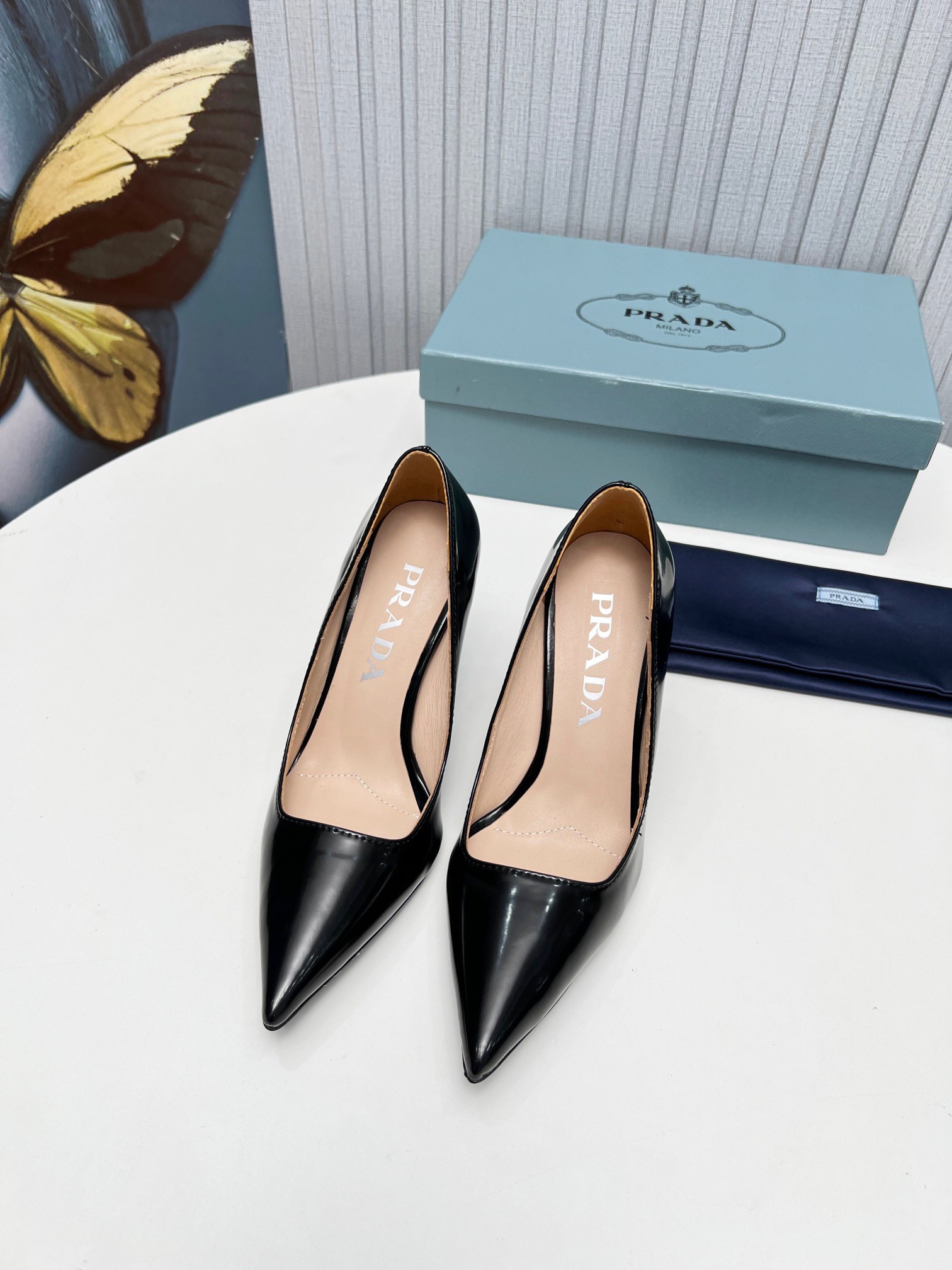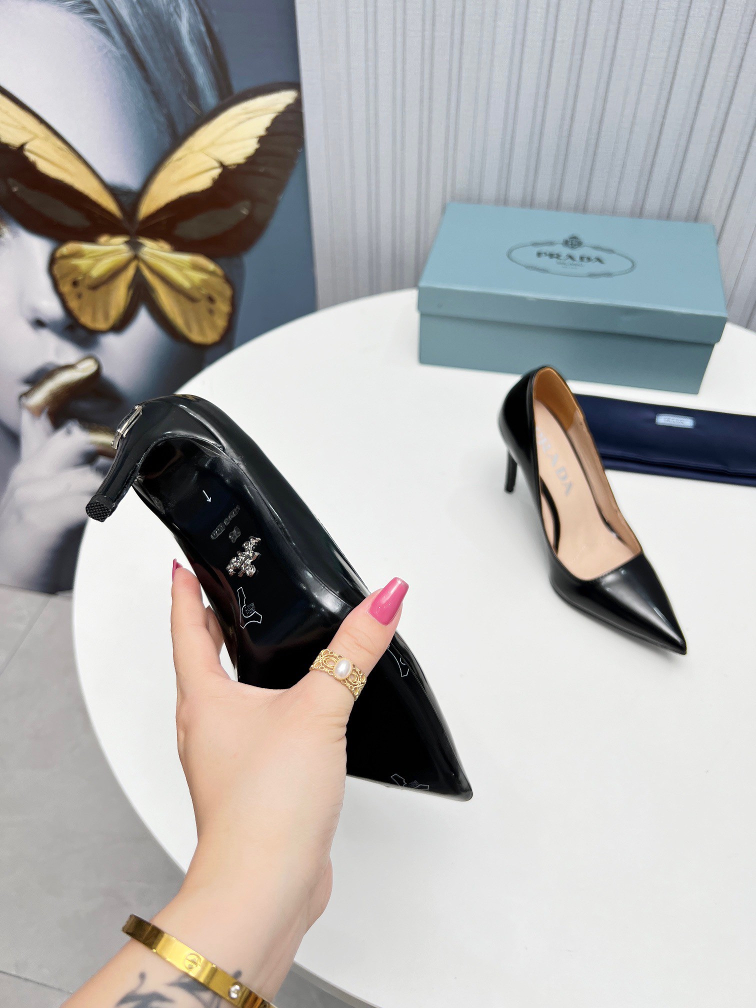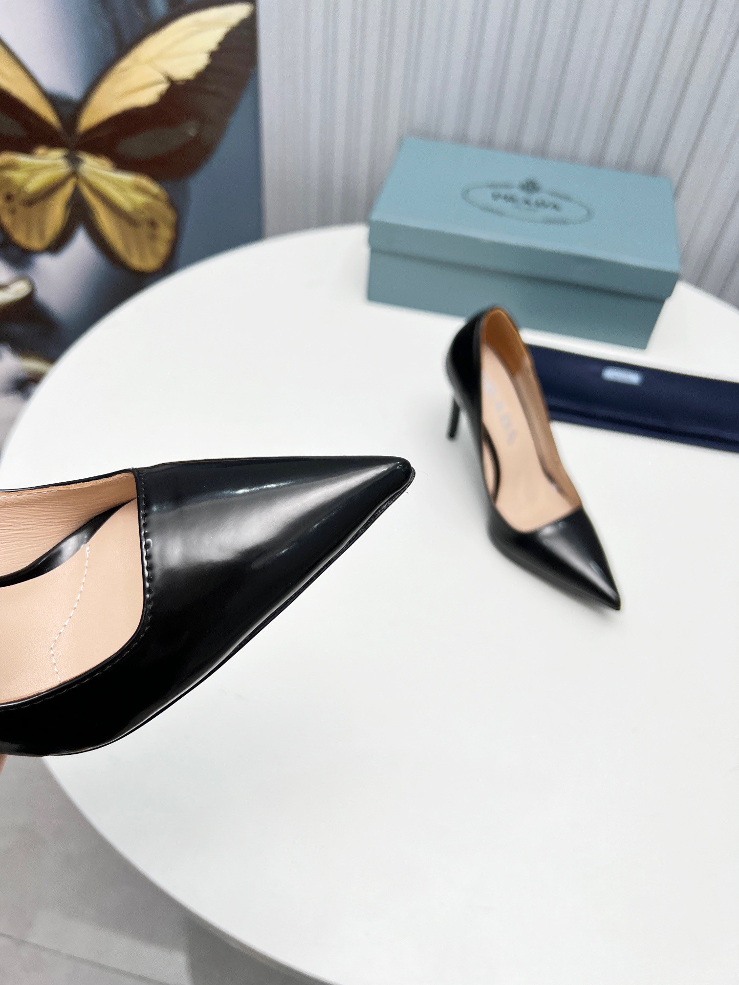 These glossy patent leather pumps decorated with Prada’s iconic enameled metal triangle logo express timeless elegance. They are finished with a thin 95mm stiletto heel to confidently elongate your legs.
