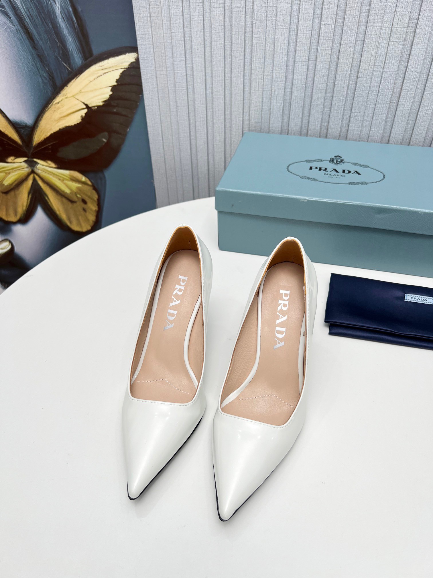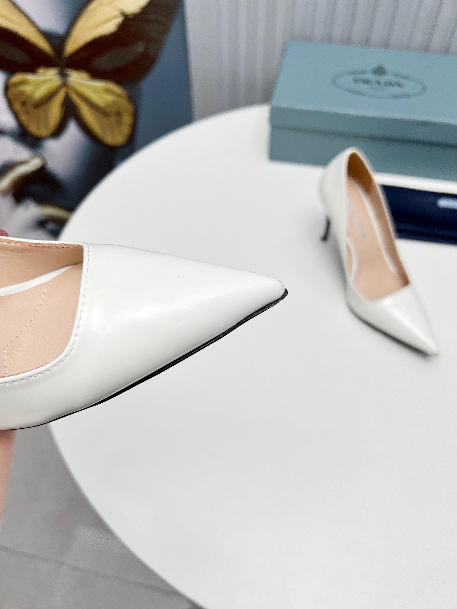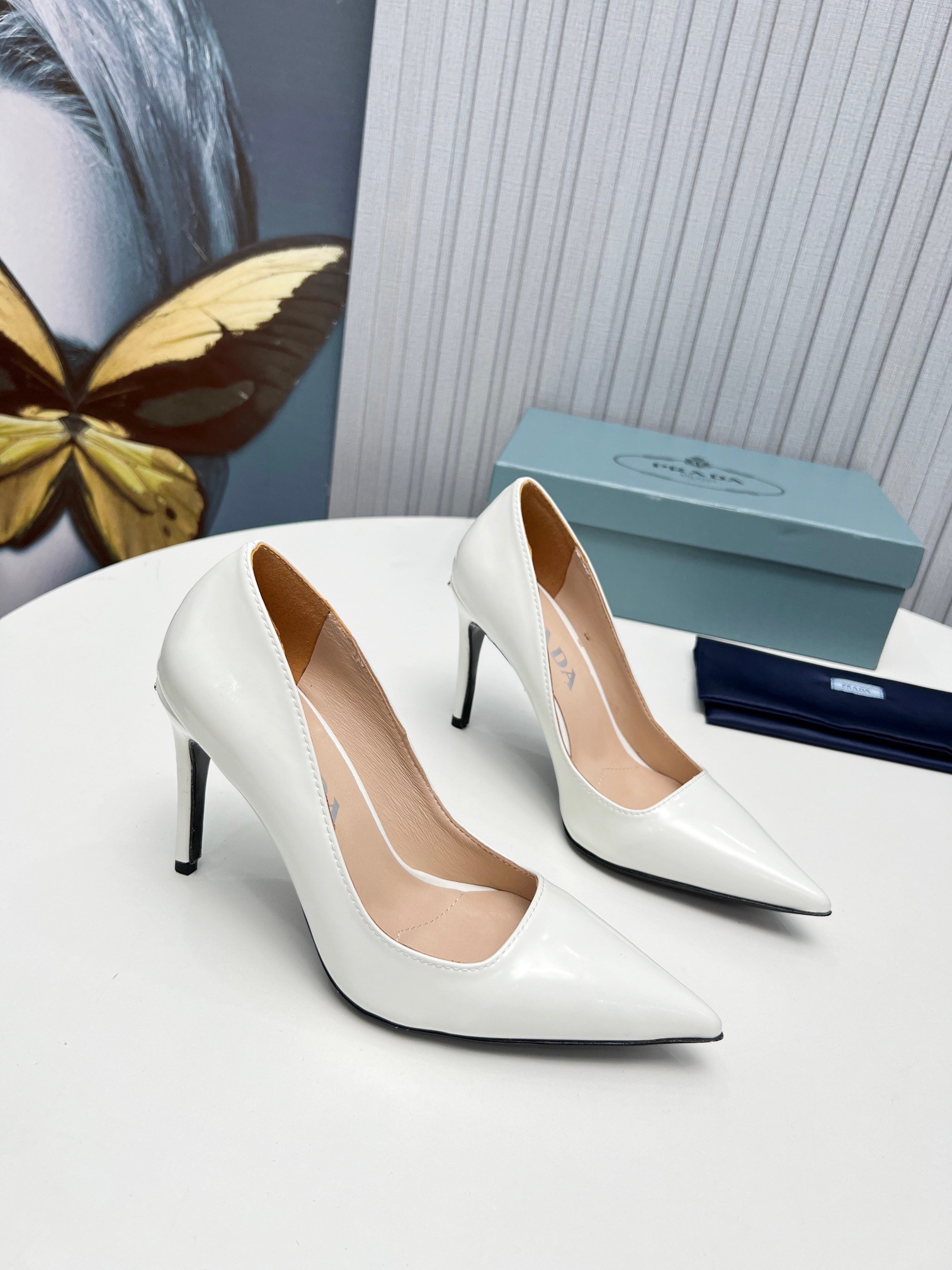 These glossy patent leather pumps decorated with Prada’s iconic enameled metal triangle logo express timeless elegance. They are finished with a thin 95mm stiletto heel to confidently elongate your legs.