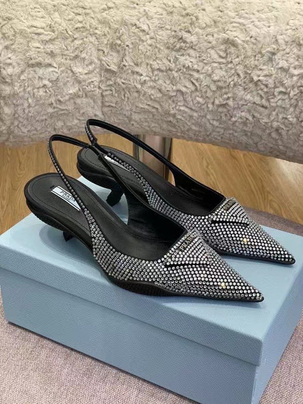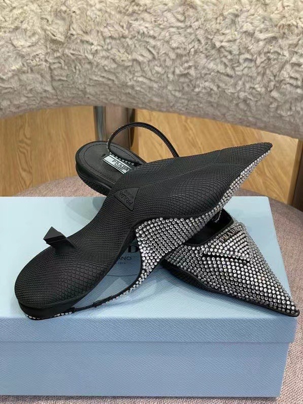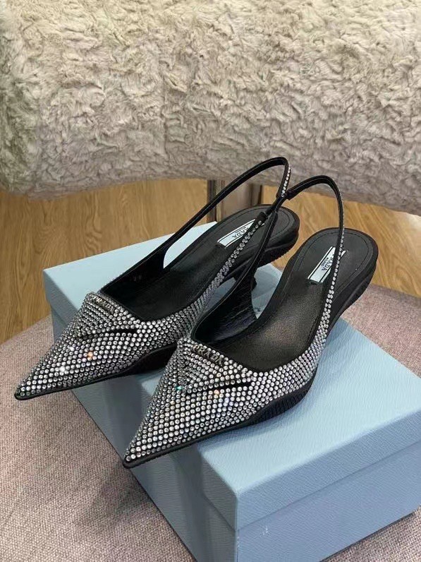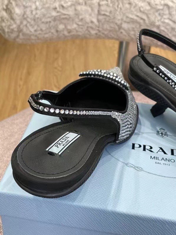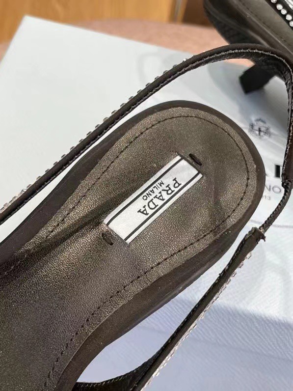 These slingback pumps with comma heel are made of satin studded with crystals that create a play of light and iridescent glimmers on the surface. Revisiting a design from the Prada archives of the nineties, a rubber sole envelops the upper, creating a hybrid silhouette that blends a feminine pointy silhouette and sports references. New interpretations for the iconic triangle, transformed into a slightly padded detail.