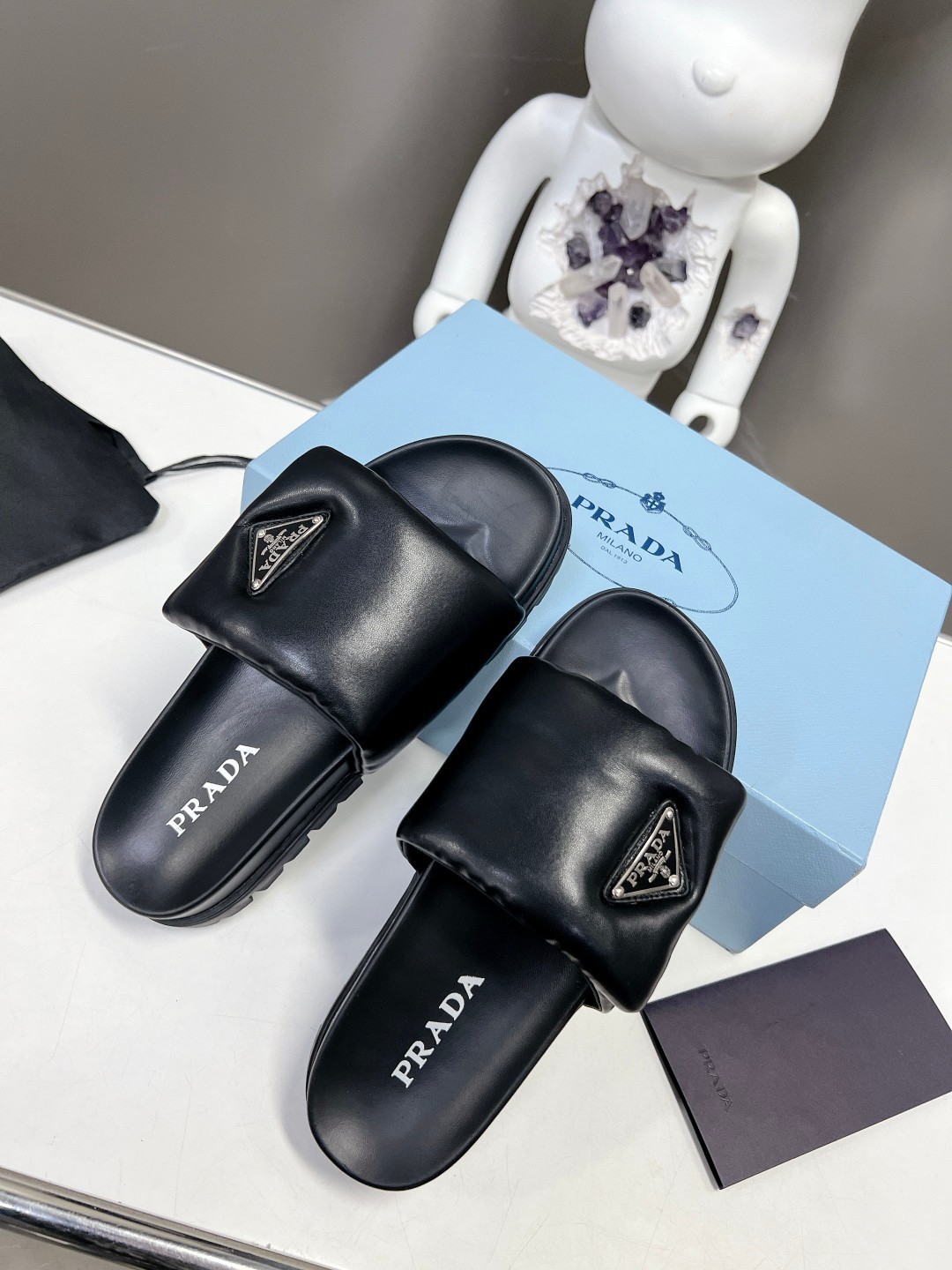 Prada explores nostalgic influences in these soft nappa leather slides. Inspired by minimalist ’90s designs, they’re adorned with the brand’s enamelled triangle logo plaque, referencing archival codes.