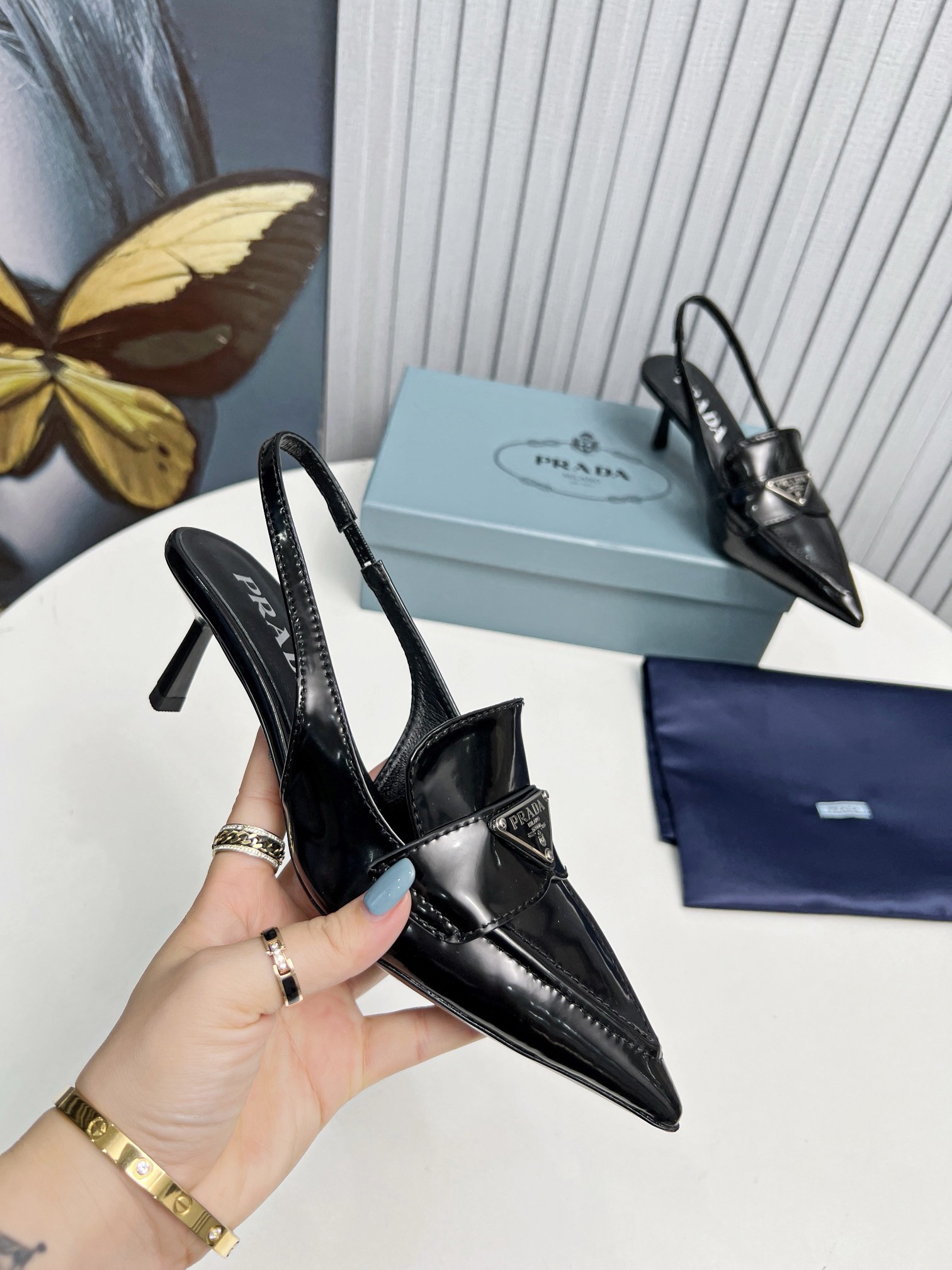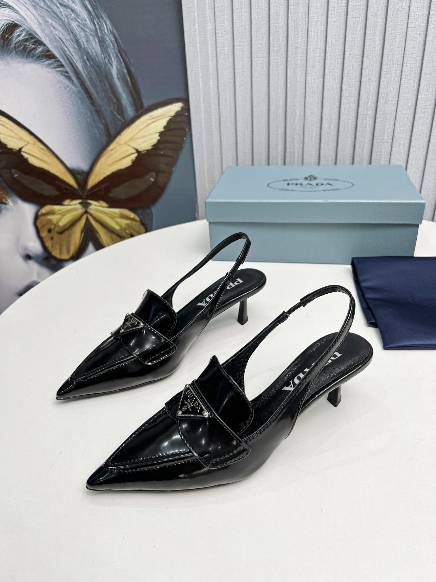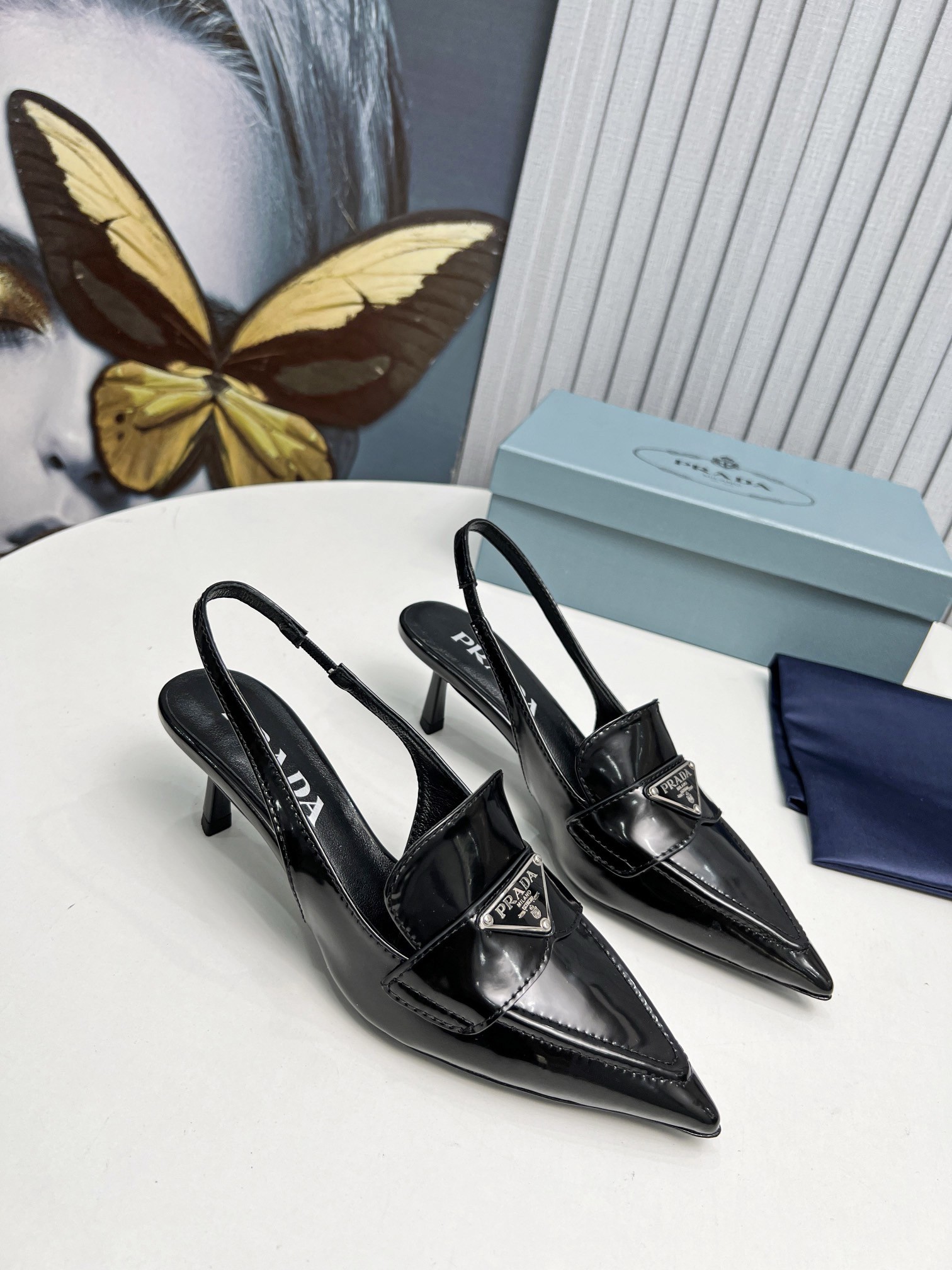 A motif which first appeared in 1913 on trunks designed by Mario Prada. These tapered, sinuous patent leather slingbacks with masculine touches are embellished with the iconic enameled metal triangle logo that stands out on the upper.
