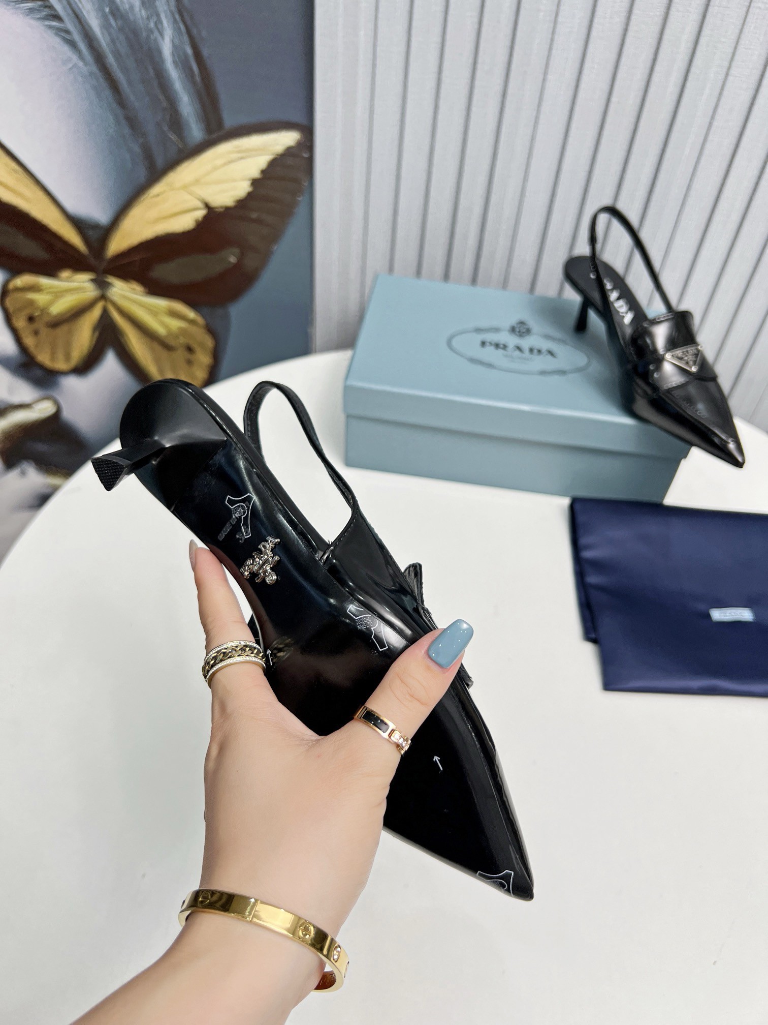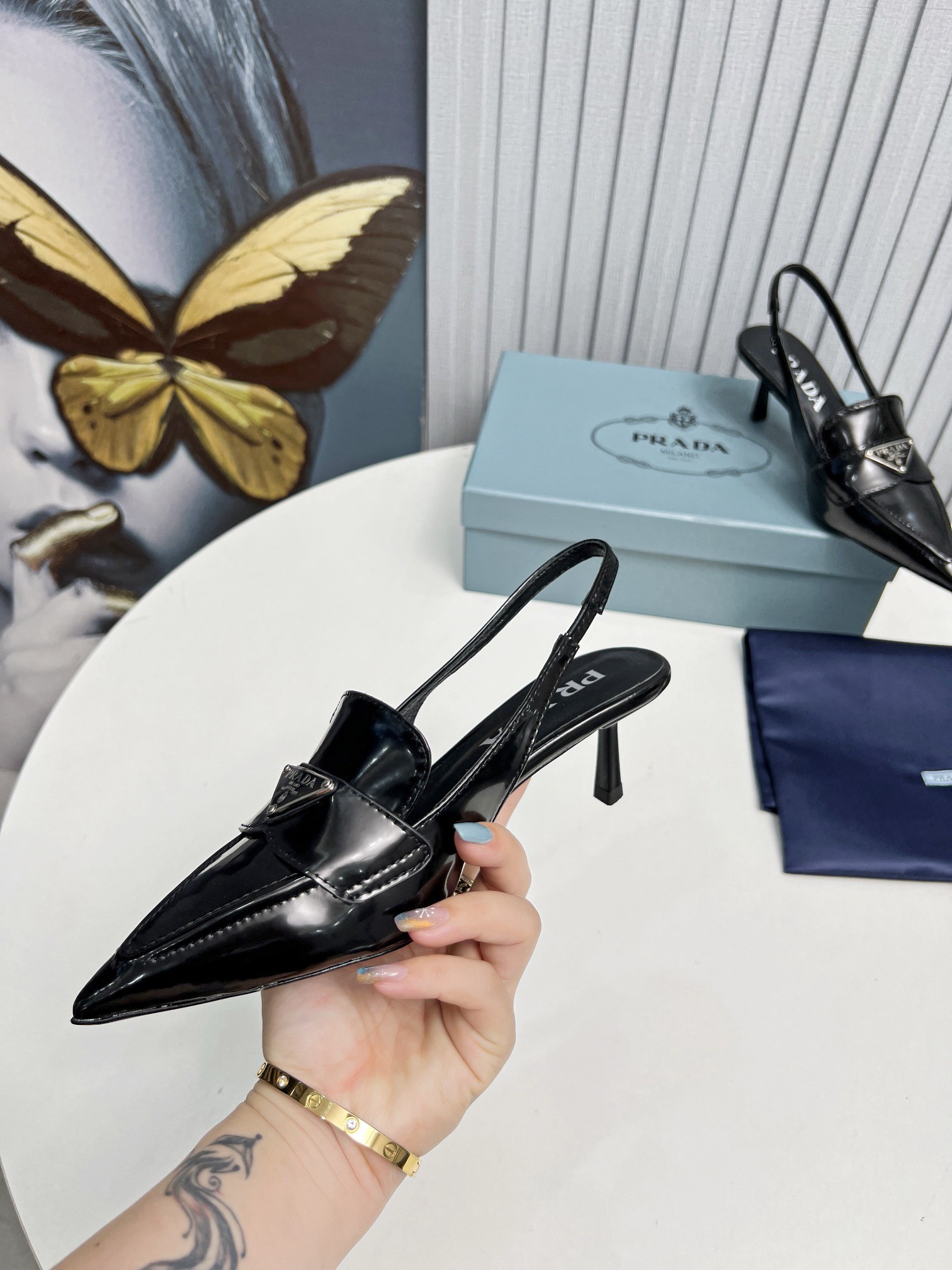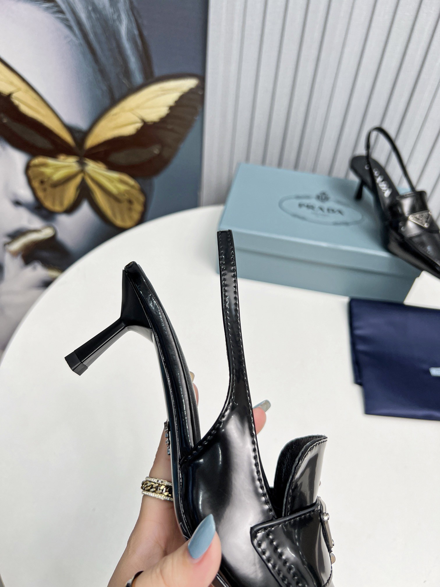 A motif which first appeared in 1913 on trunks designed by Mario Prada. These tapered, sinuous patent leather slingbacks with masculine touches are embellished with the iconic enameled metal triangle logo that stands out on the upper.