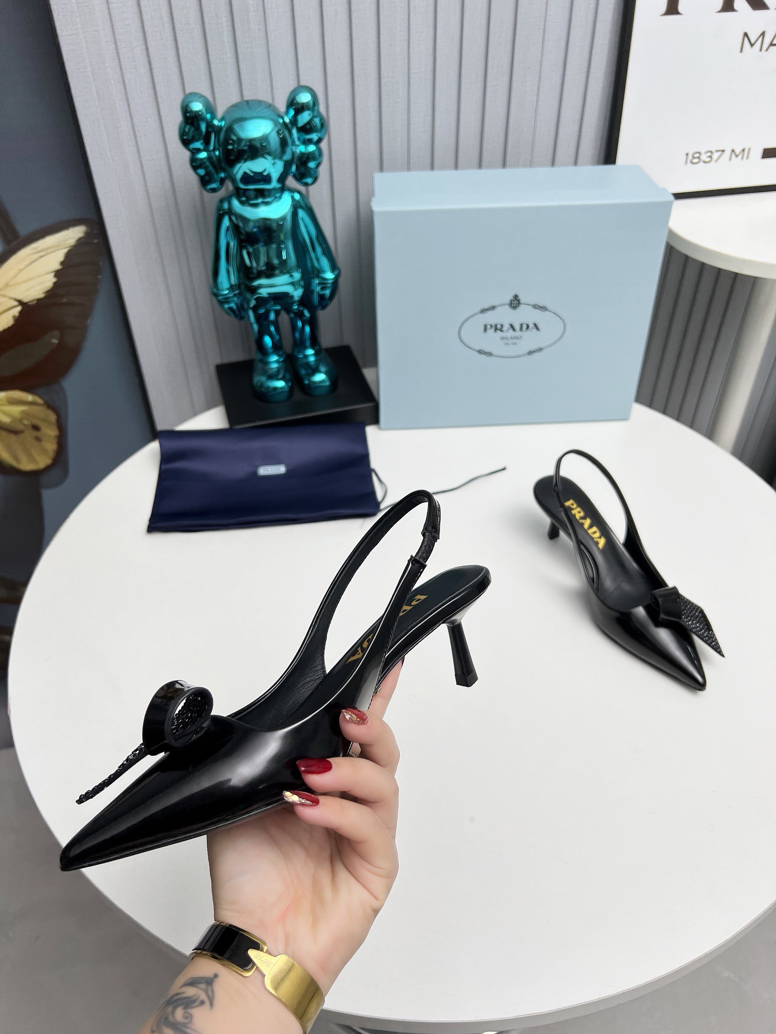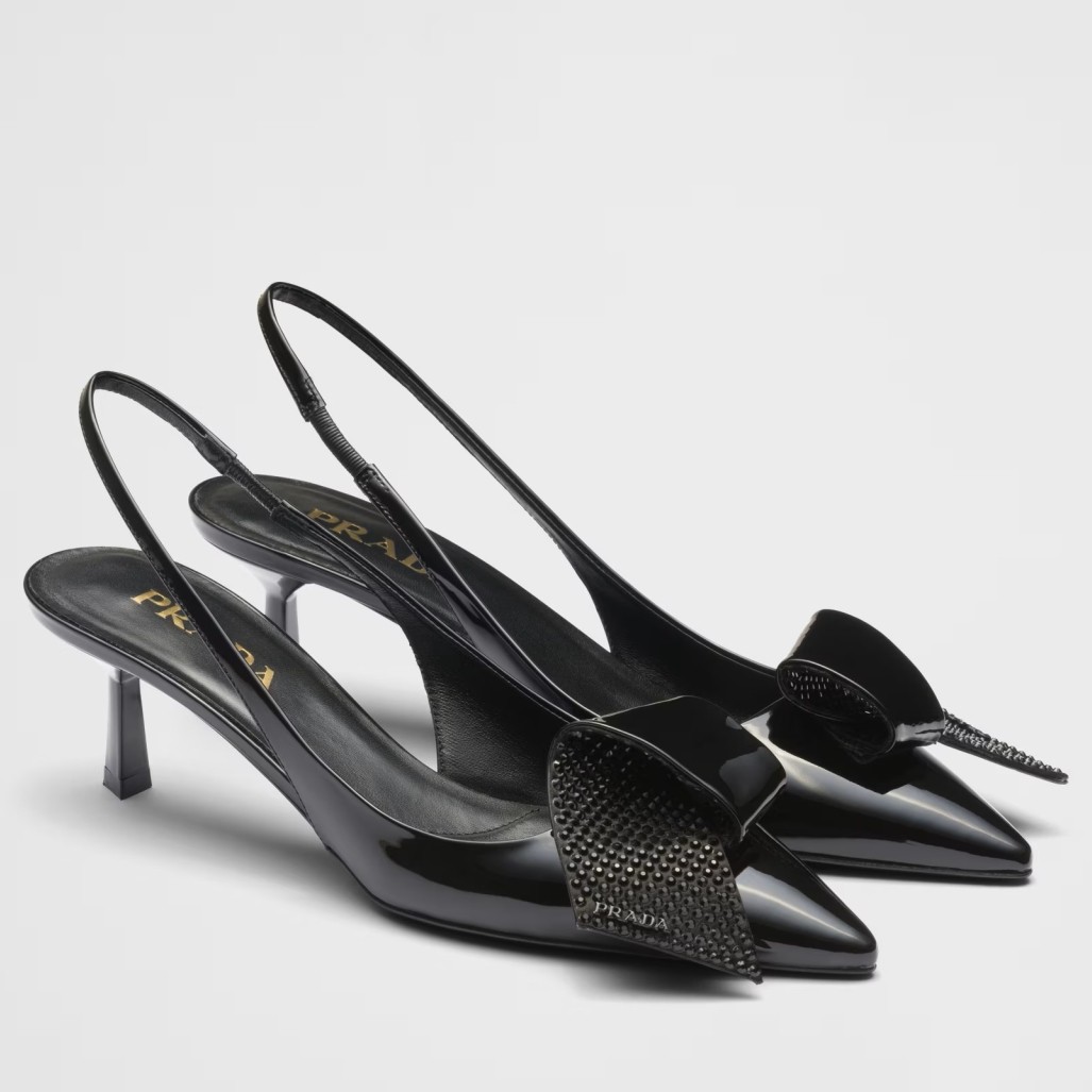 Dynamic details add a vibrant touch to the sophisticated, feminine silhouette of these patent leather slingback pumps characterized by a geometric heel with contemporary style. The slingback style with refined allure is enhanced by an architecturally inspired ornament illuminated by tonal crystals.