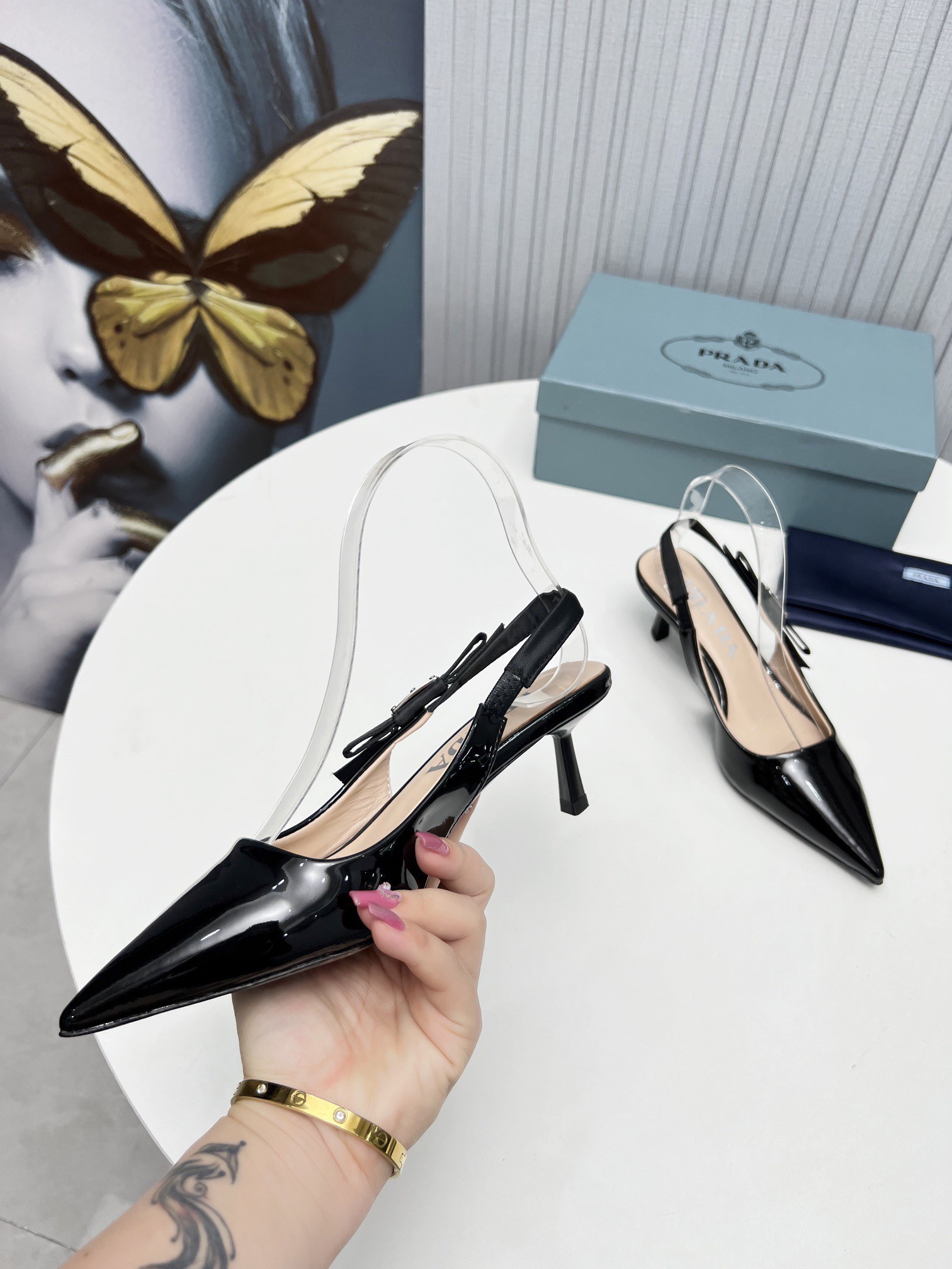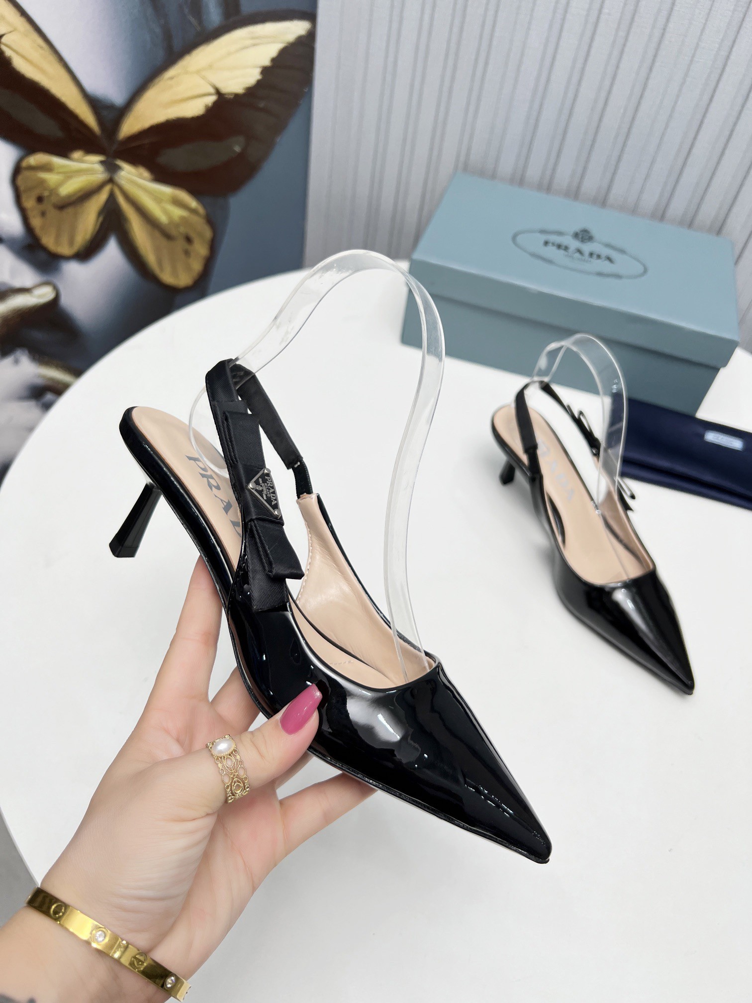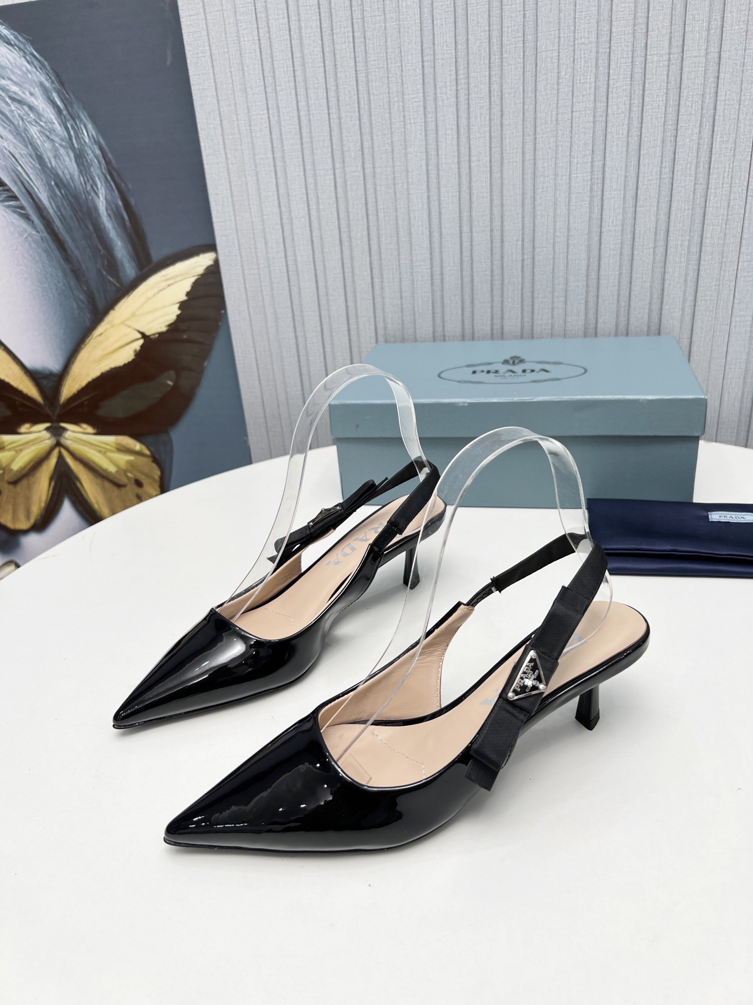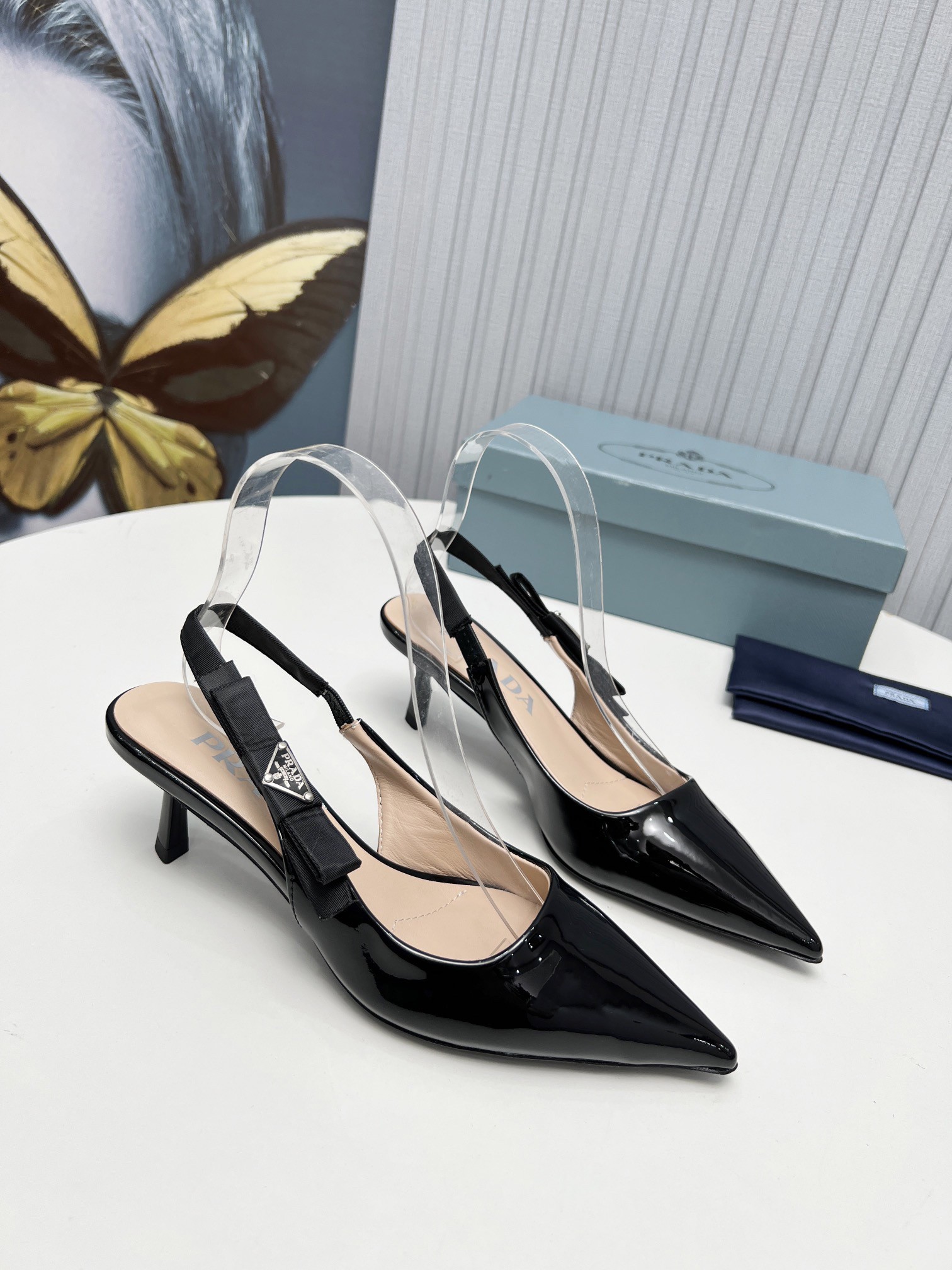 Retro allure and minimalist lines characterize these patent leather slingbacks with pointy toe. The triangle logo embellishes the elegant bow on the strap of this shoe.