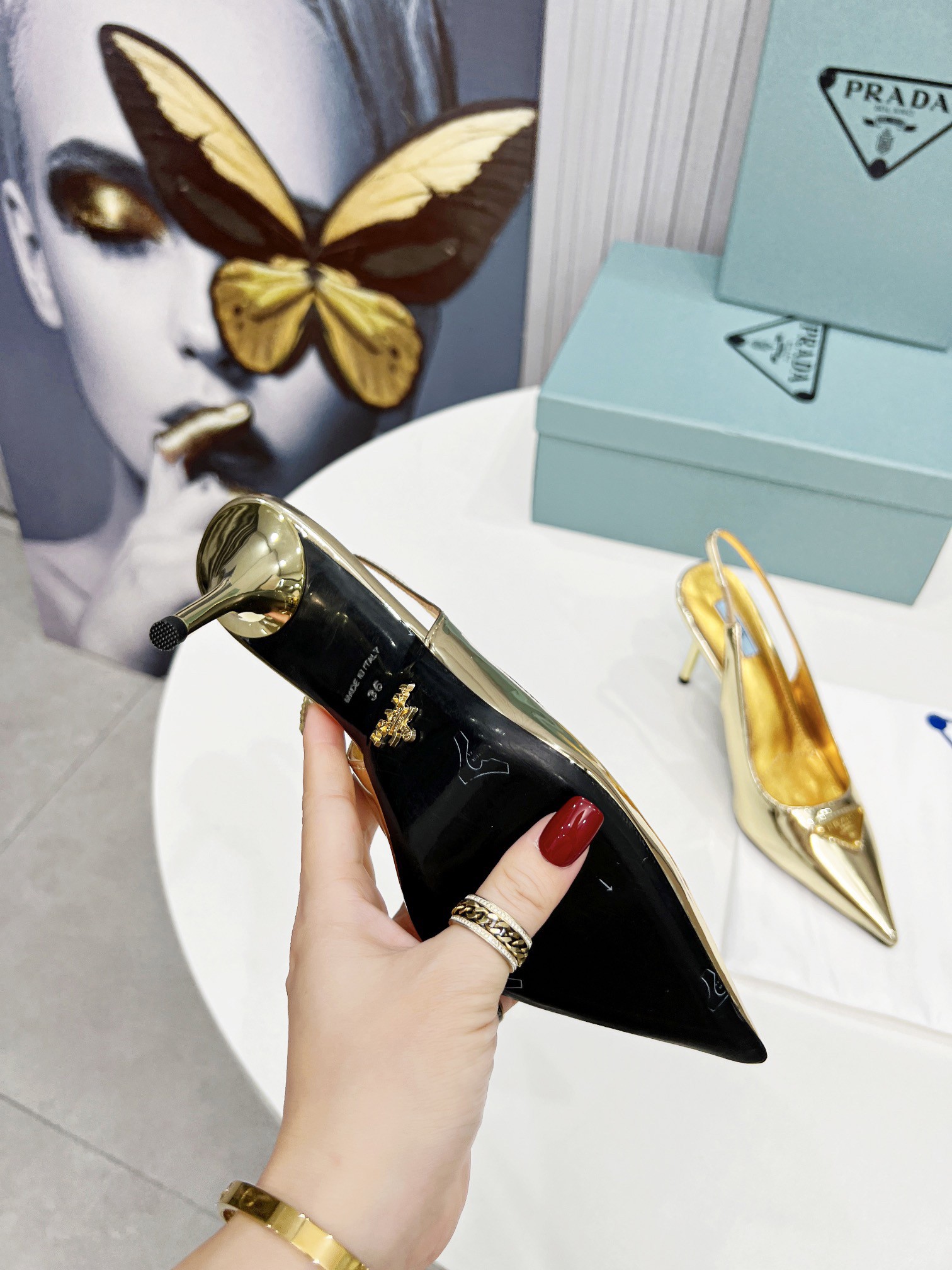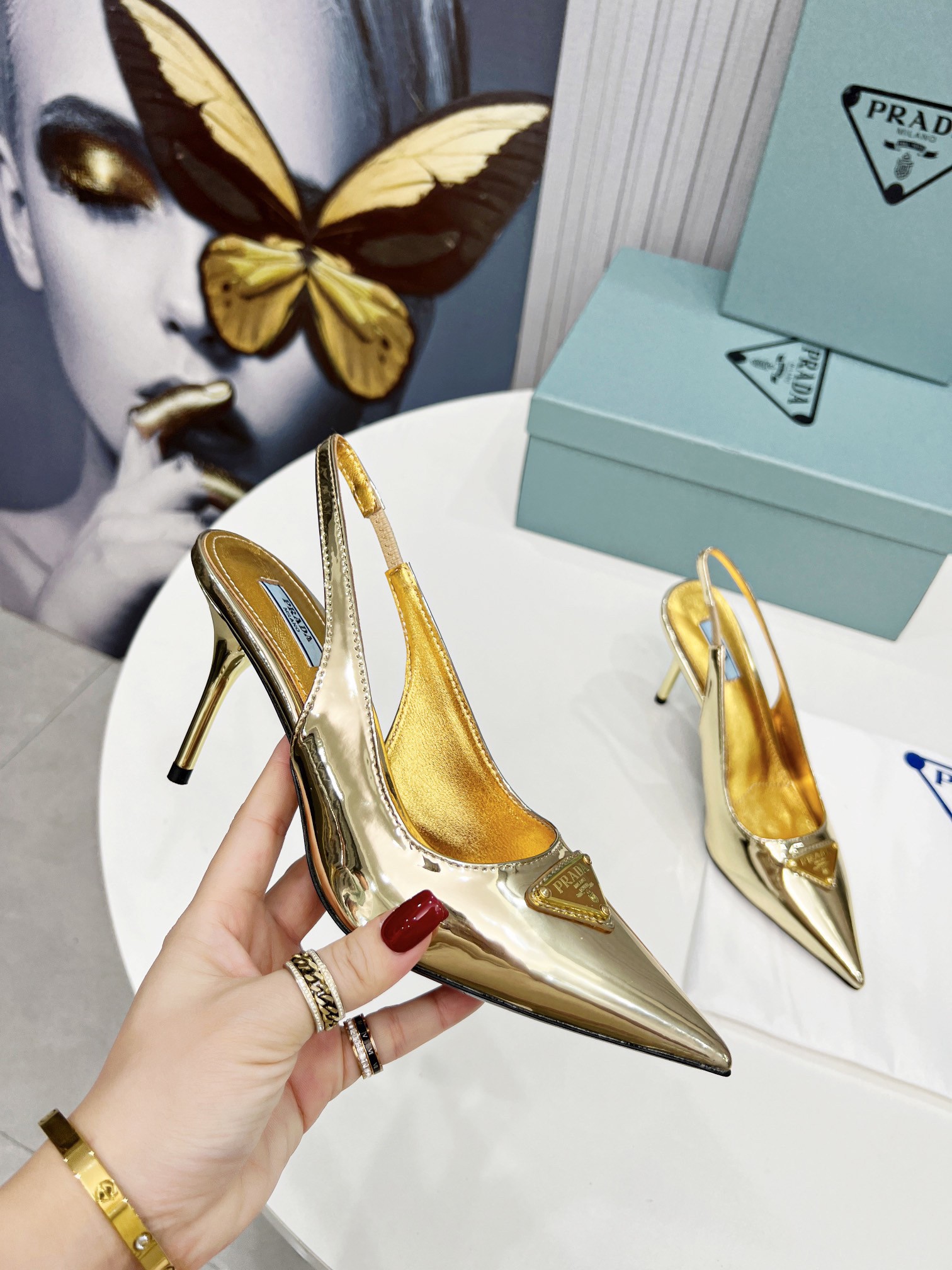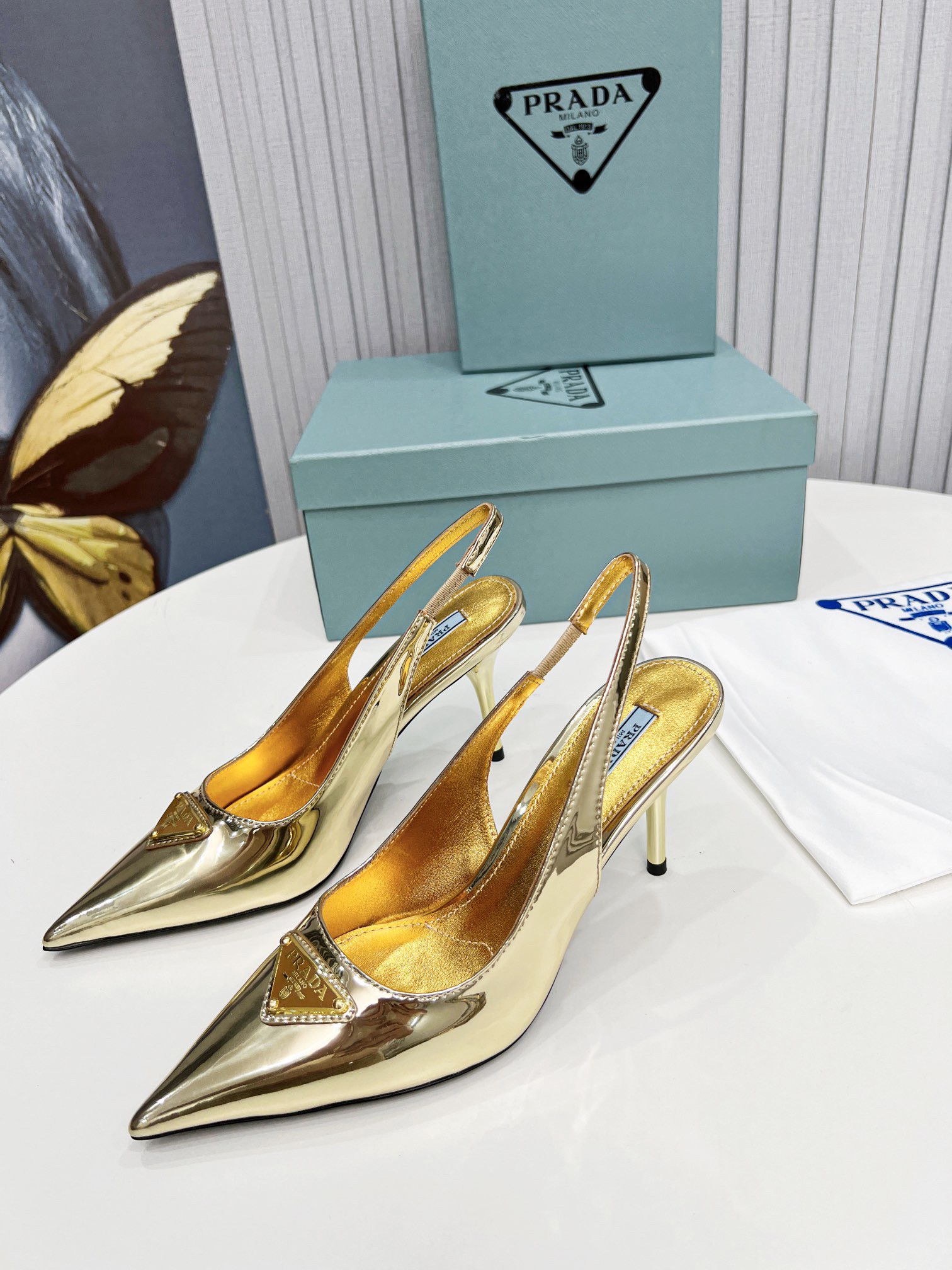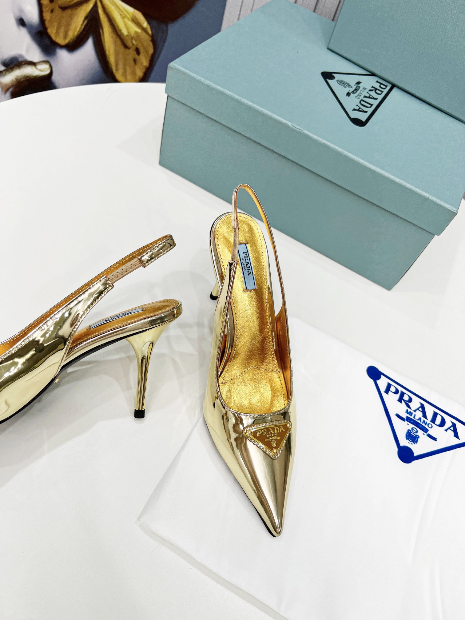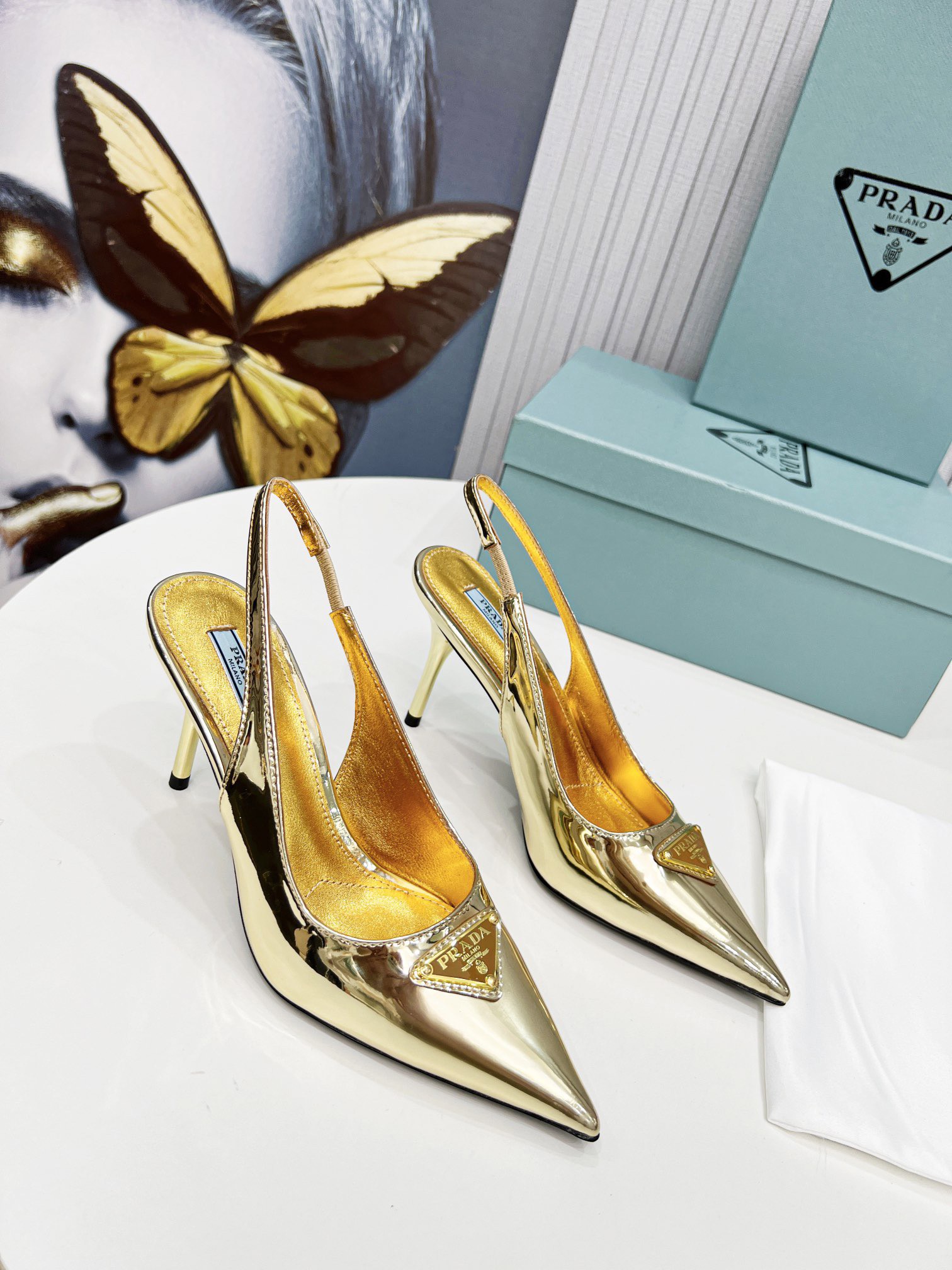 Prada’s iconic triangle logo decorates these slingback pumps with sleek allure. A metallic gleam elegantly accents this leather style decorated with the iconic enameled metal triangle logo, which first appeared in 1913 on trunks designed by Mario Prada.