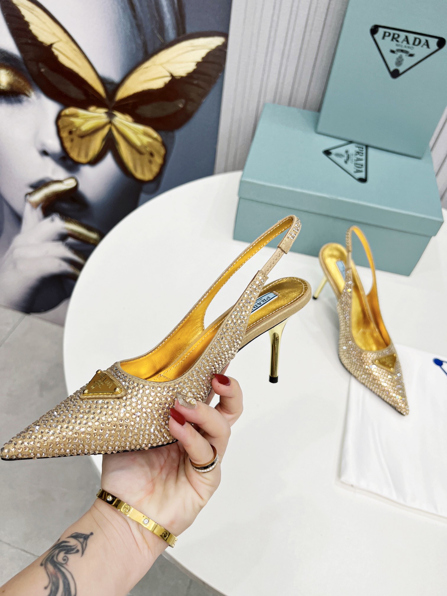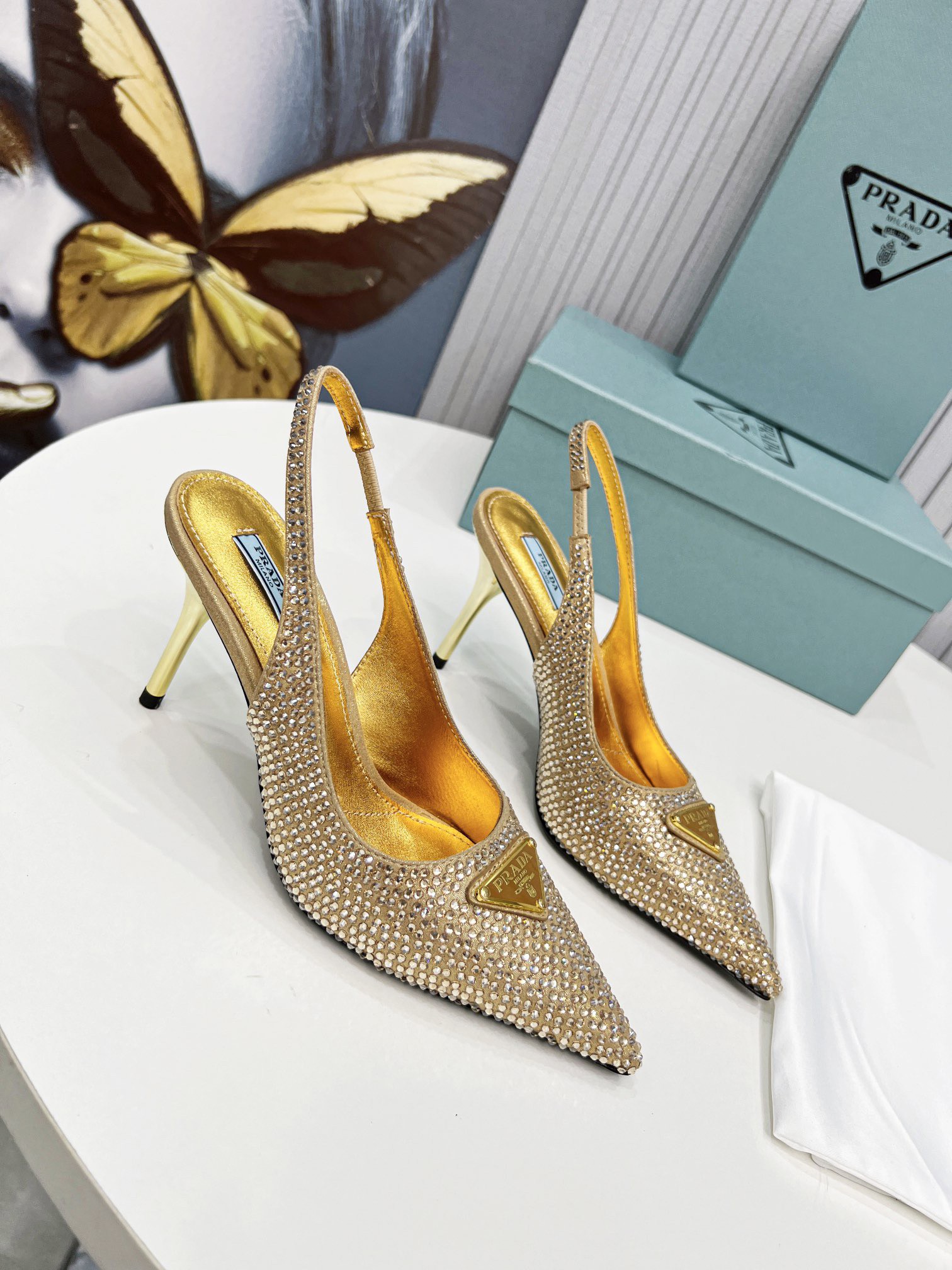 Faceted crystals create sparkles and iridescent glimmers on these satin slingback pumps, characterized by a sophisticated silhouette and refined allure. The enameled metal triangle logo decorates the shoe.