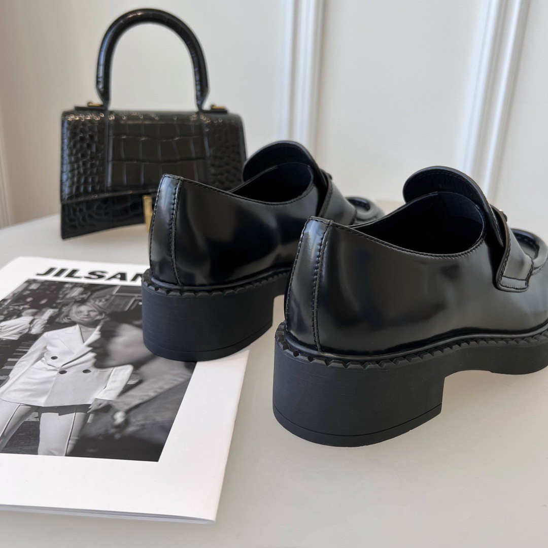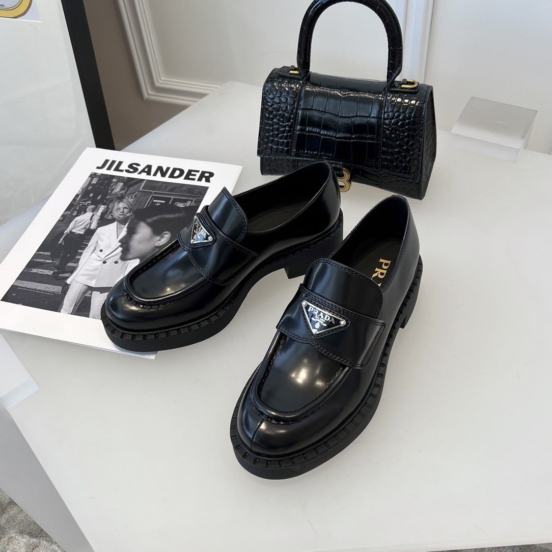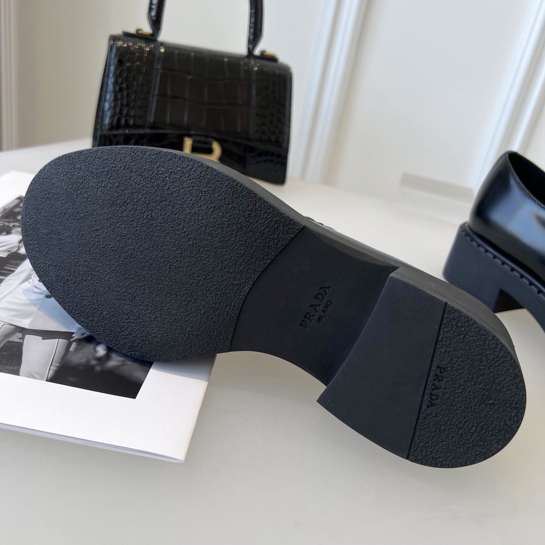 Emphasized by the iconic enameled triangle logo, these retro-inspired loafers are made of brushed leather, traditionally used in classic fine footwear and reinterpreted in Prada collections on unexpected designs for a hybrid result that reflects the duality of the brand. The notched effect of the welt around the shoe gives it a handcrafted touch.