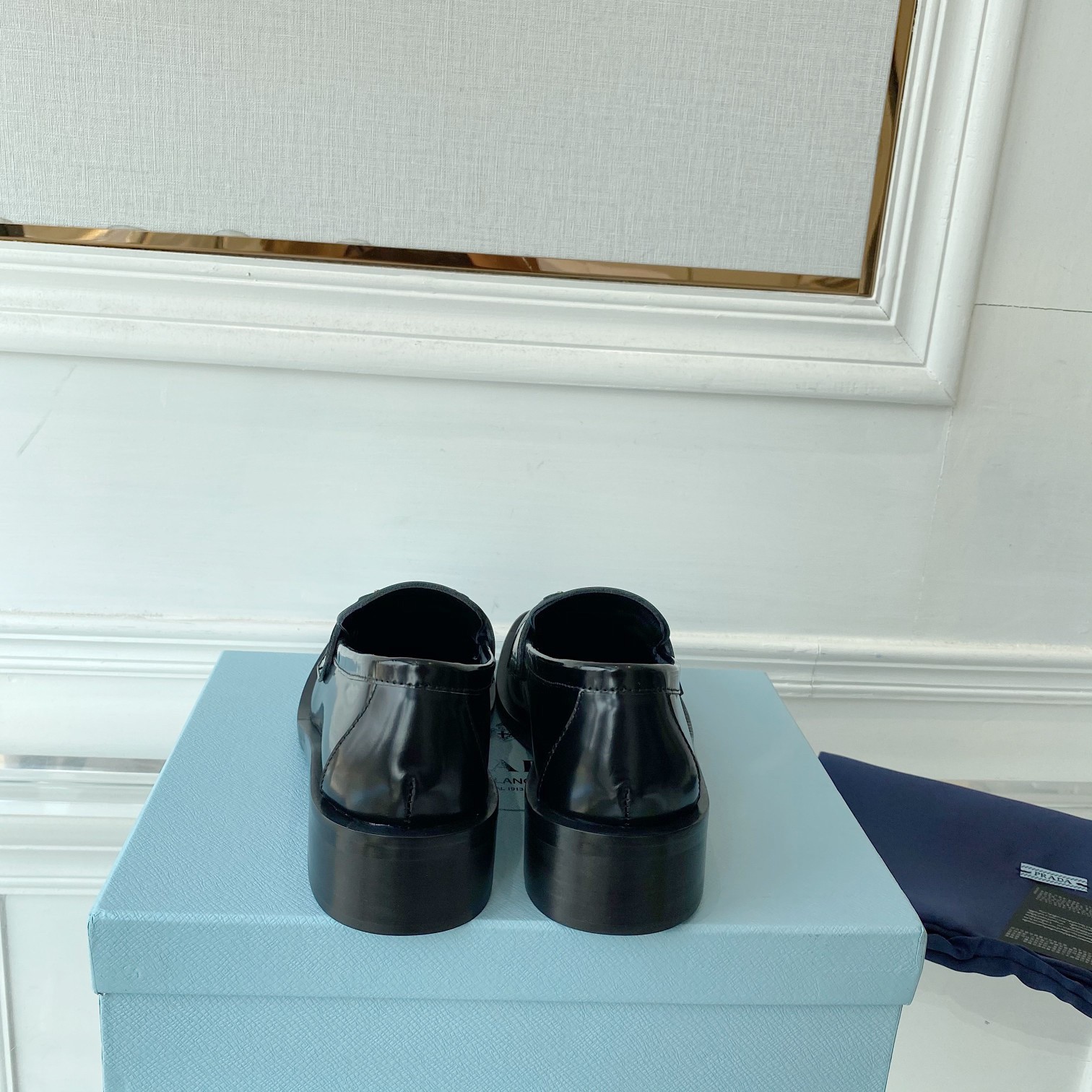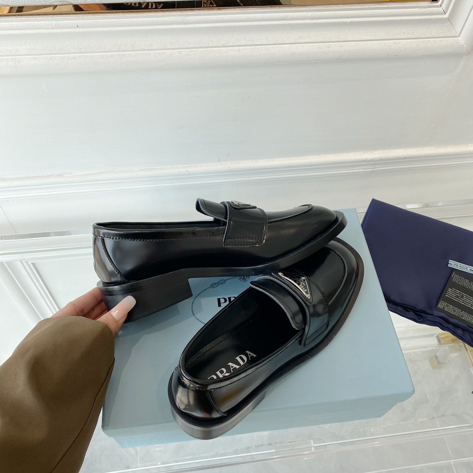 These loafers characterized by their refined, minimalist design are made of brushed leather that is traditionally used for fine classic footwear. The shoe, which embodies the artisan know-how of the brand, is decorated with the enameled metal triangle logo that first appeared on trunks designed by Mario Prada.