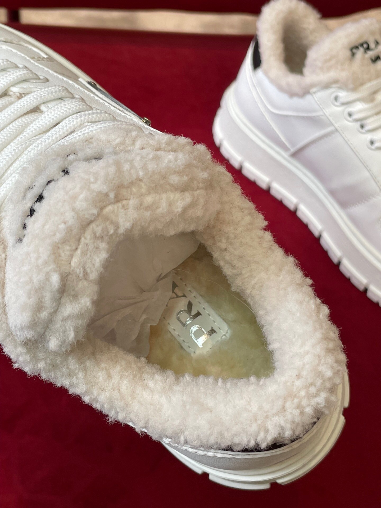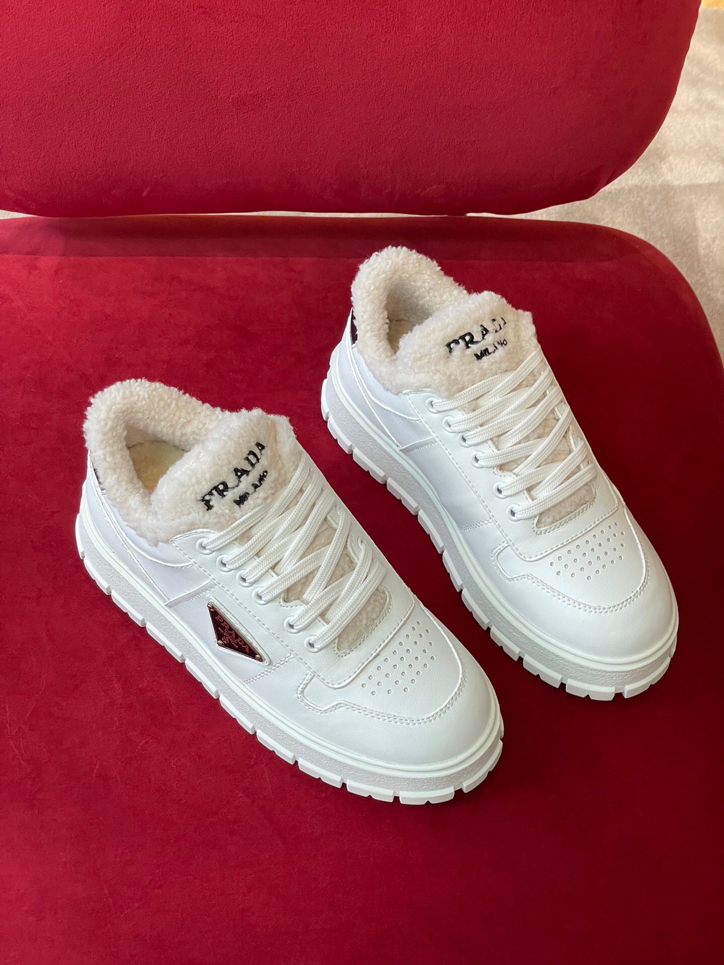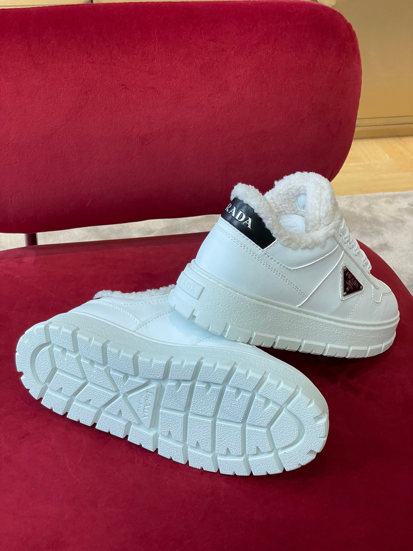 The soft shearling tongue decorated with the Prada logo is an unexpected detail that adds an original twist to these leather sneakers characterized by a sporty design with retro references.
