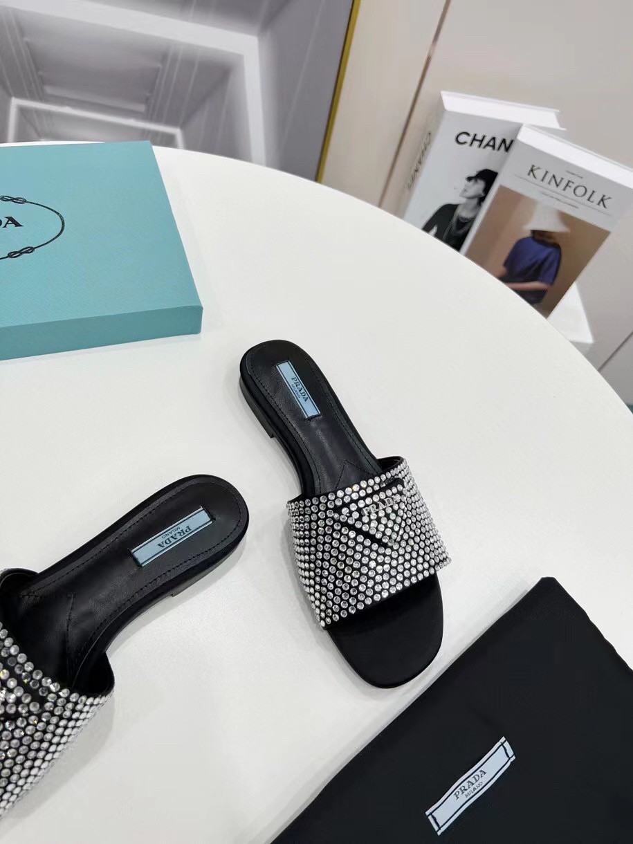 Faceted crystals create plays of light and iridescent reflections on these flat slides in a luxurious version. The hybrid concept pervades the Prada narrative and is translated into innovative designs with an interesting and unusual combination of materials, shapes, and functions. New variations of the brand’s iconic triangle logo turn it into a slightly padded leather detail.