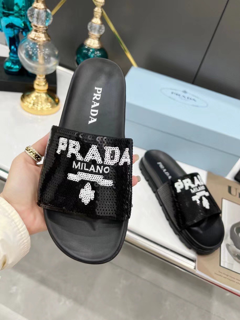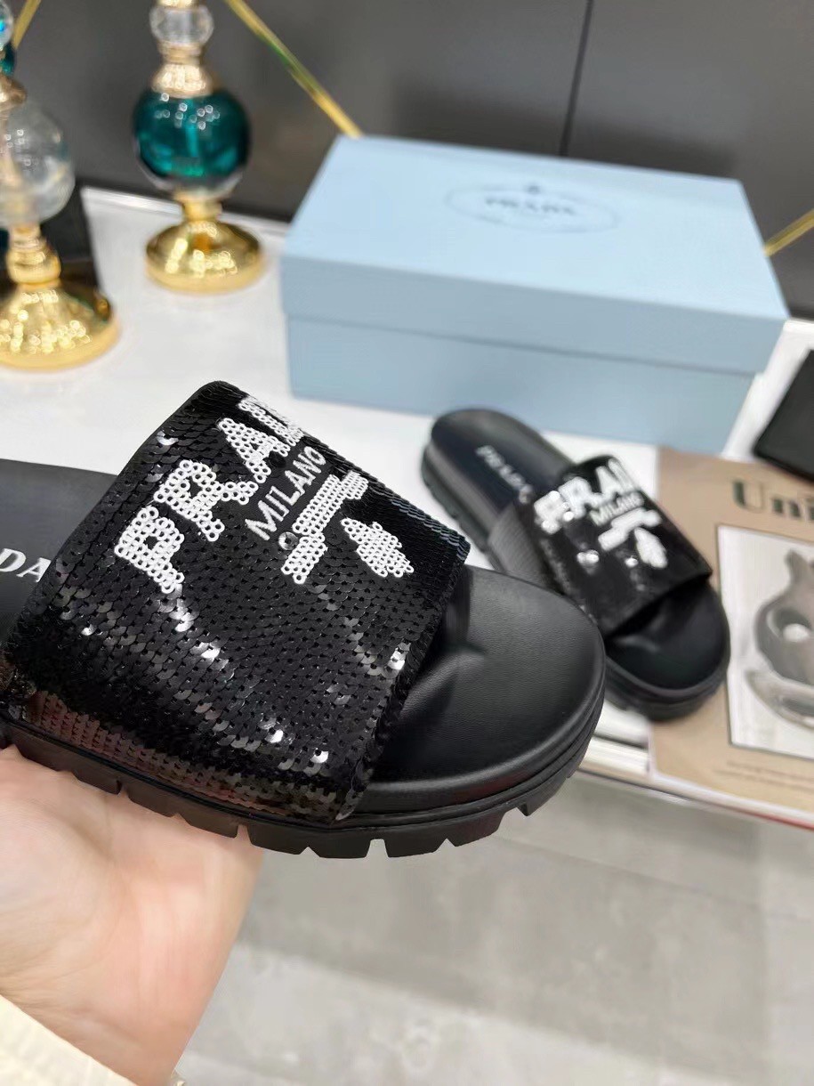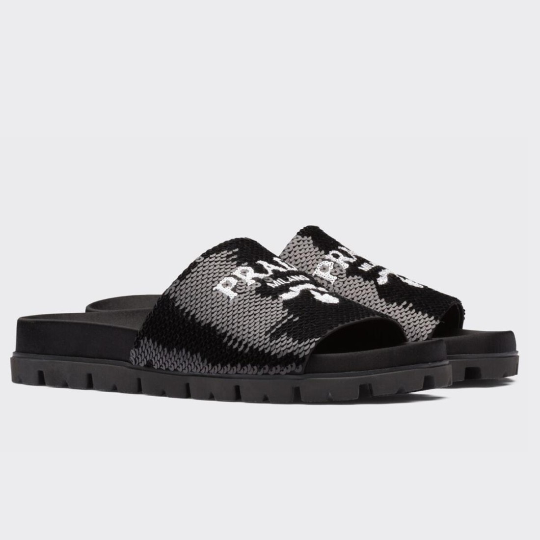 A streetwear-inspired design is reinterpreted in an unexpected way: these slides with rubber lug sole are covered all over with embroidered sequins. The hybrid concept pervades the Prada narrative and is translated into innovative designs with an interesting and unusual combination of materials, shapes, and functions.