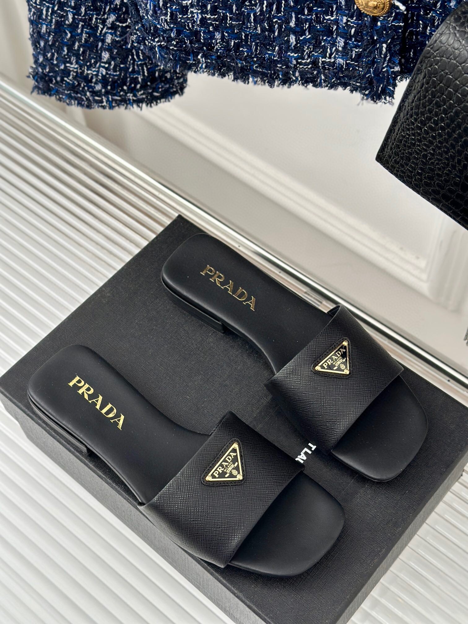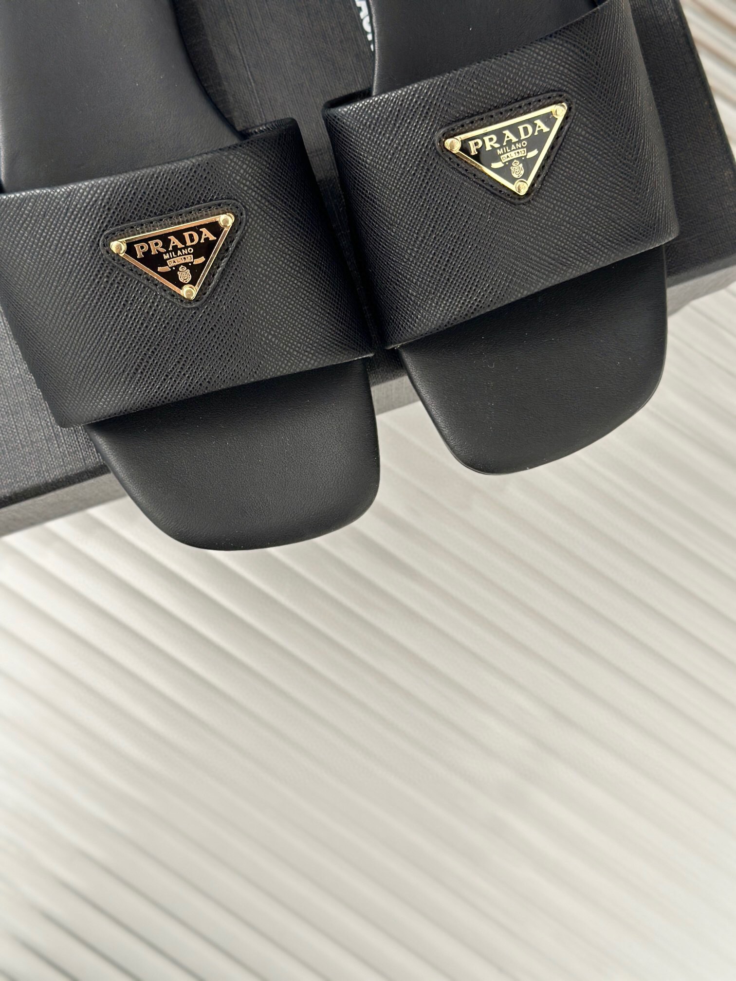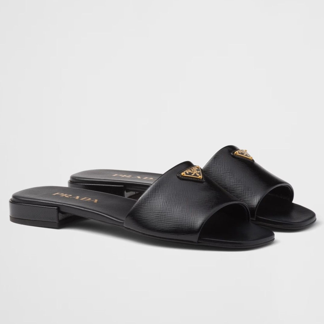 The distinctive crosshatch pattern of Saffiano leather, a signature material of Prada collections, meets the Saffiano leather in these slides with a contemporary design. The sophisticated and versatile style defined by clean, sleek lines is enriched with the iconic enameled metal triangle logo.