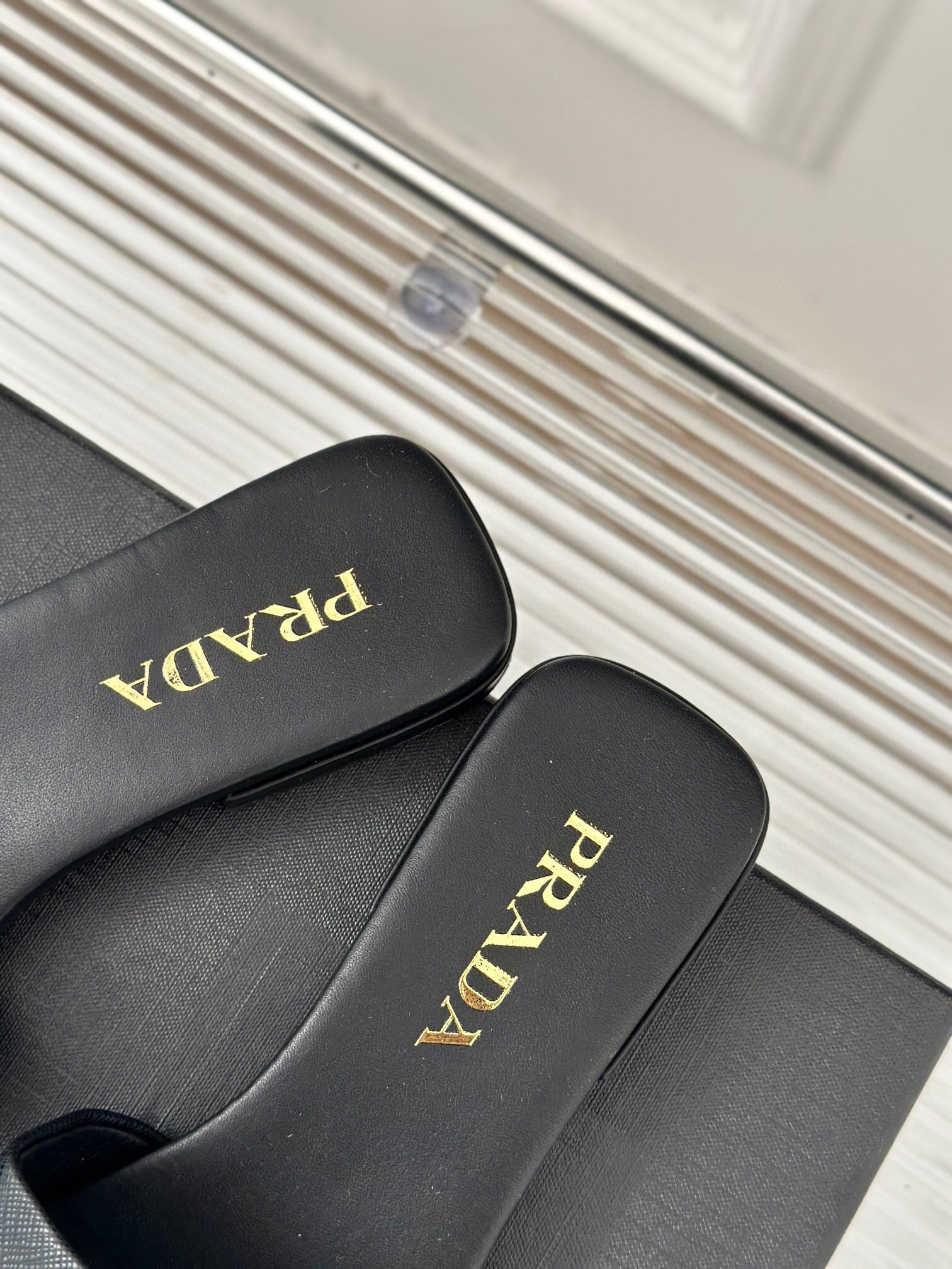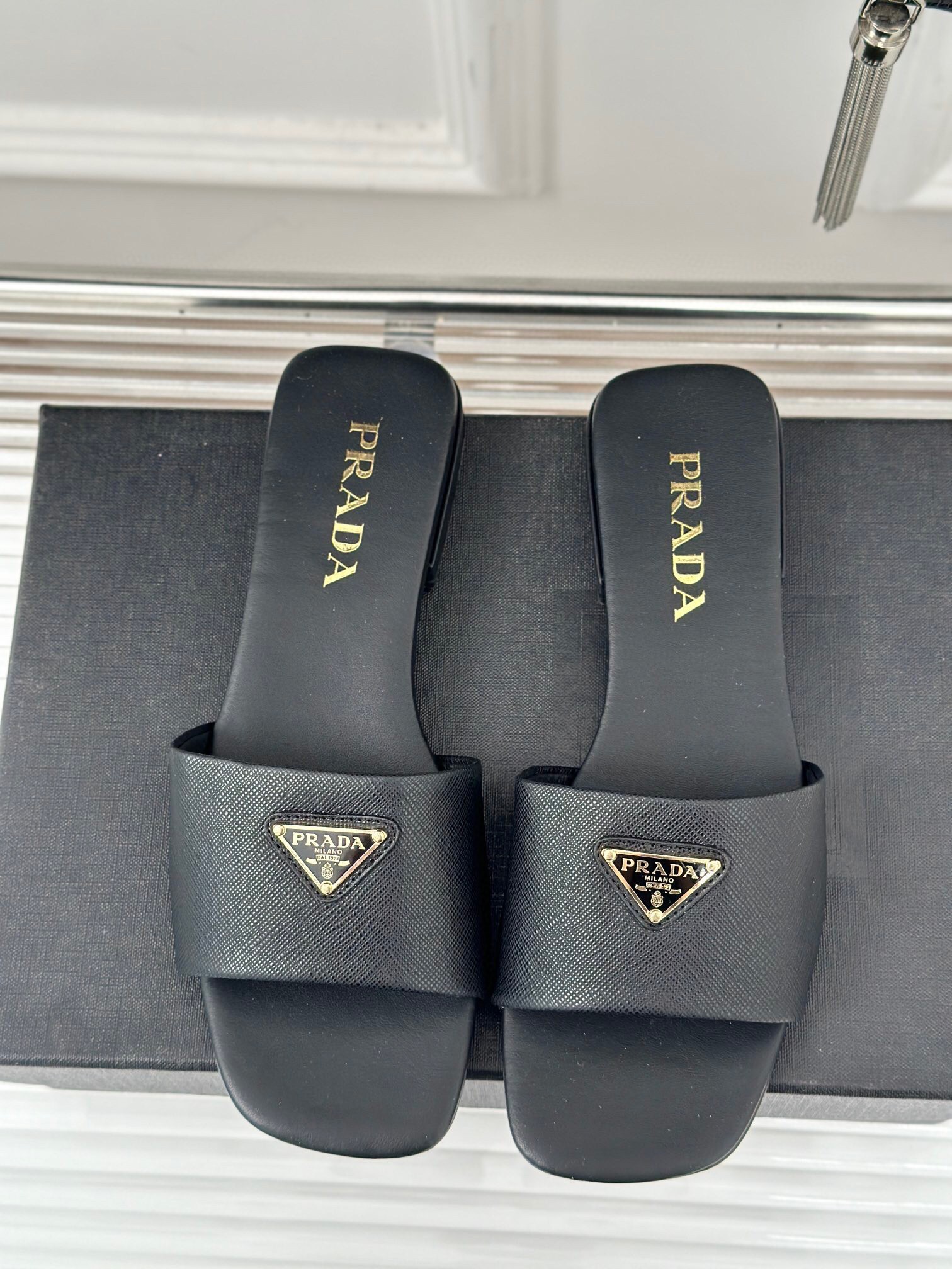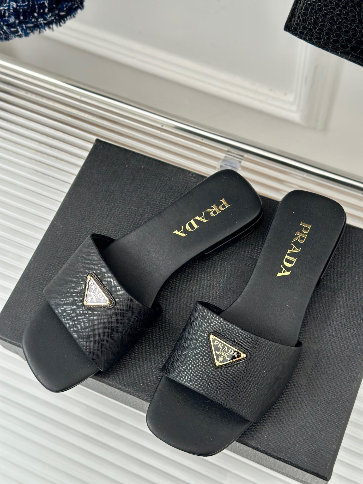 The distinctive crosshatch pattern of Saffiano leather, a signature material of Prada collections, meets the Saffiano leather in these slides with a contemporary design. The sophisticated and versatile style defined by clean, sleek lines is enriched with the iconic enameled metal triangle logo.