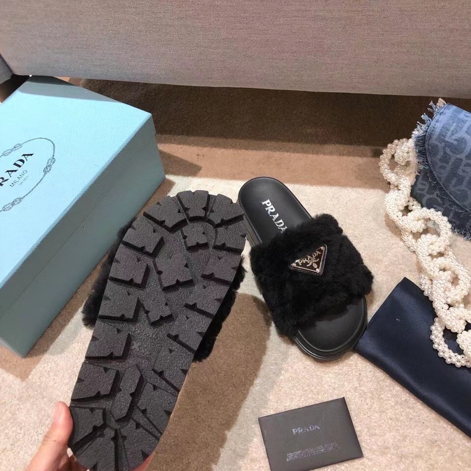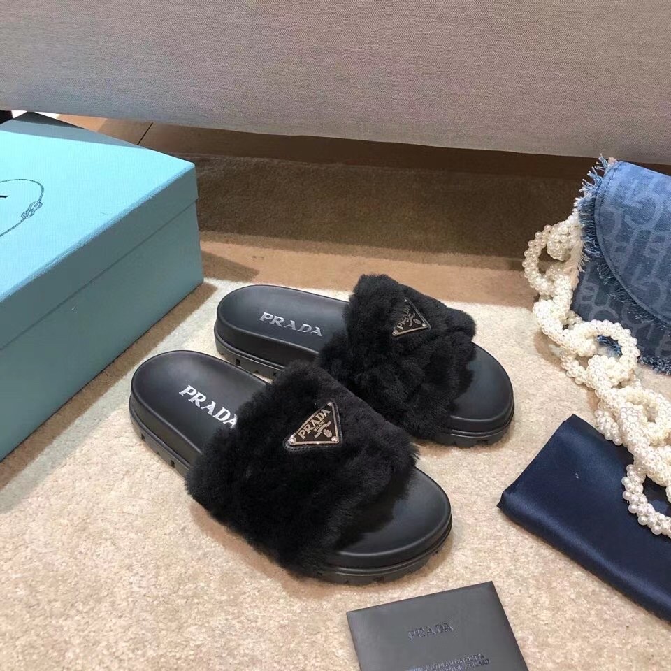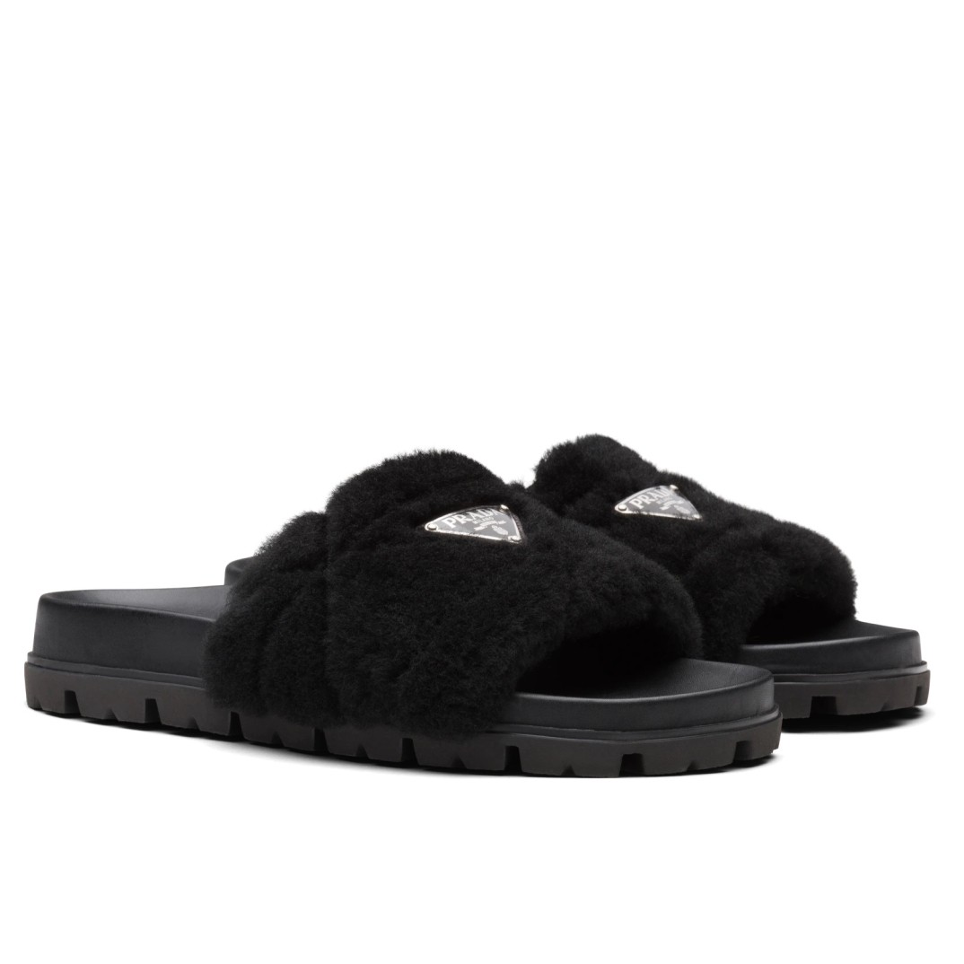 For a cosy poolside aesthetic, opt for Prada’s black slides. Made in Italy with quilted shearling straps. they’re accented with the label’s triangular emblem logo and are set on chunky rubber soles.