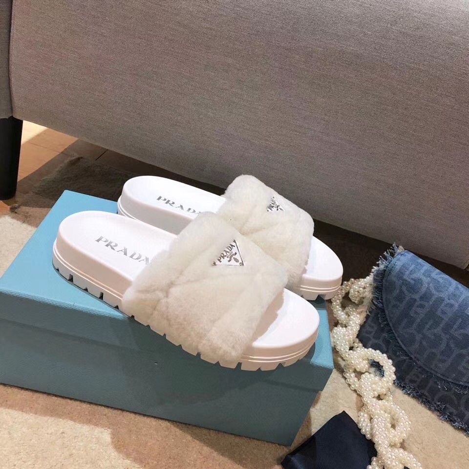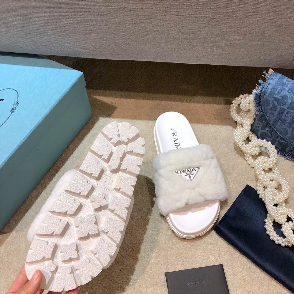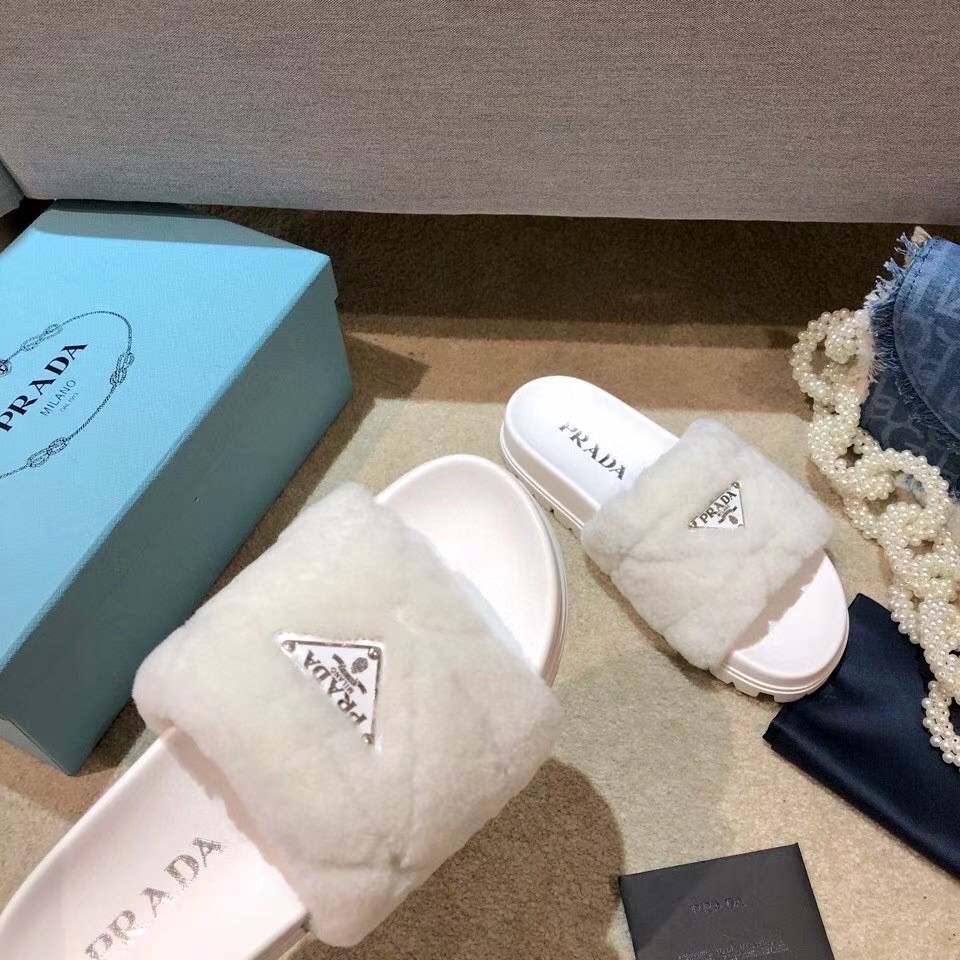 For a cosy poolside aesthetic, opt for Prada’s white slides. Made in Italy with quilted shearling straps. they’re accented with the label’s triangular emblem logo and are set on chunky rubber soles.
