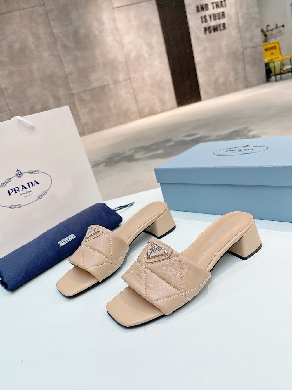 Prada’s iconic triangle is reproduced in the quilted pattern on these soft nappa leather slides that have a low heel and are decorated with the enameled metal triangle logo.