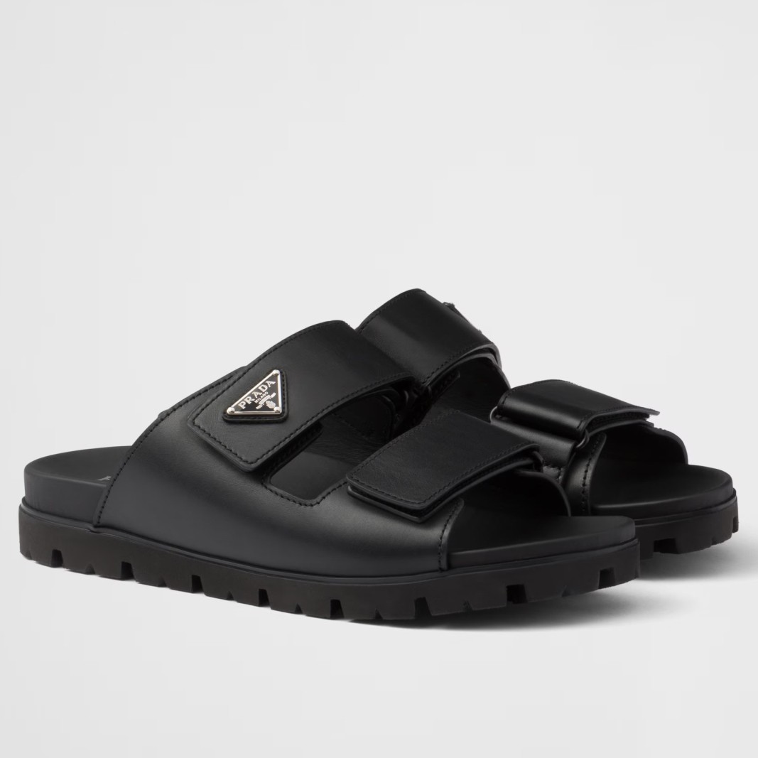 These leather sandals with sporty details are defined by clean, contemporary lines. The footwear with hook-and-loop straps is completed with rubber lug soles, which give it a casual style. The enameled metal triangle logo completes the style with its sleek and iconic signature touch.