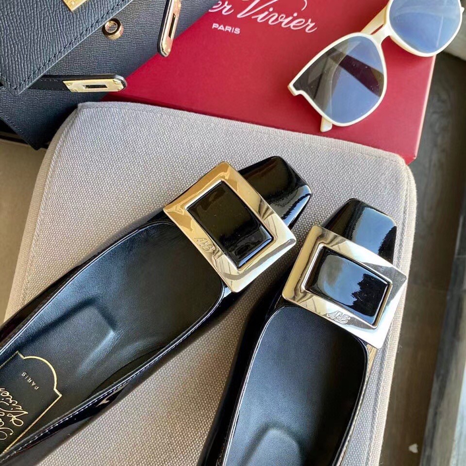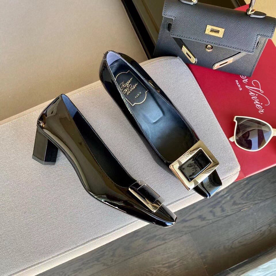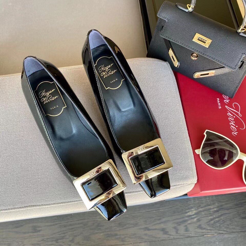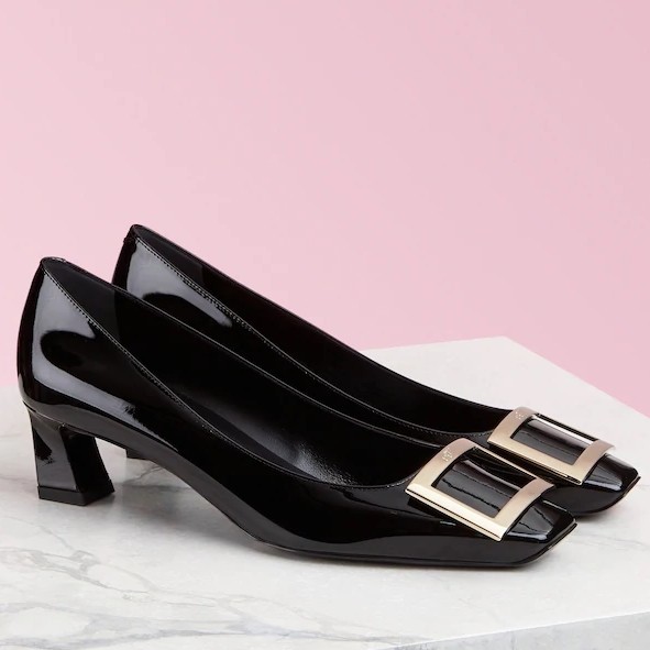 Set on signature 45mm “Skyscraper” heels, the Belle Vivier pumps are testament to Roger Vivier’s elegant approach to design. Crafted from glossy patent calfskin, the silhouette features a square toe bearing the logo-engraved buckle synonymous with the footwear label.