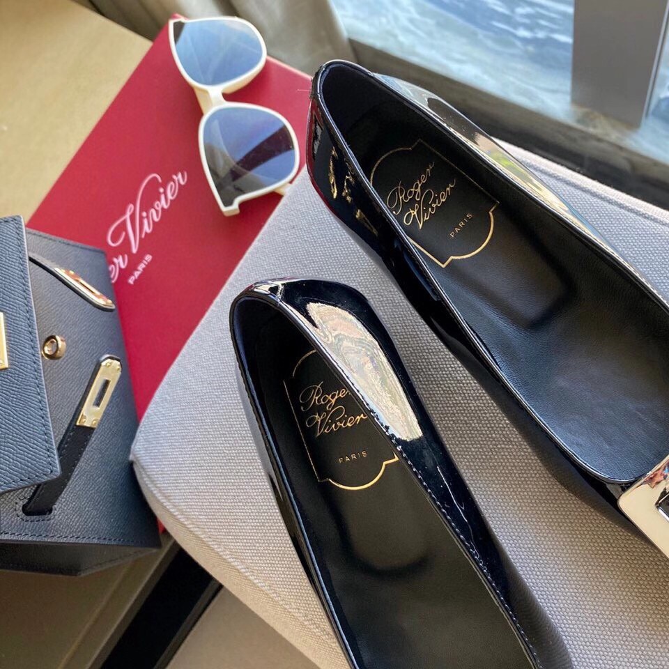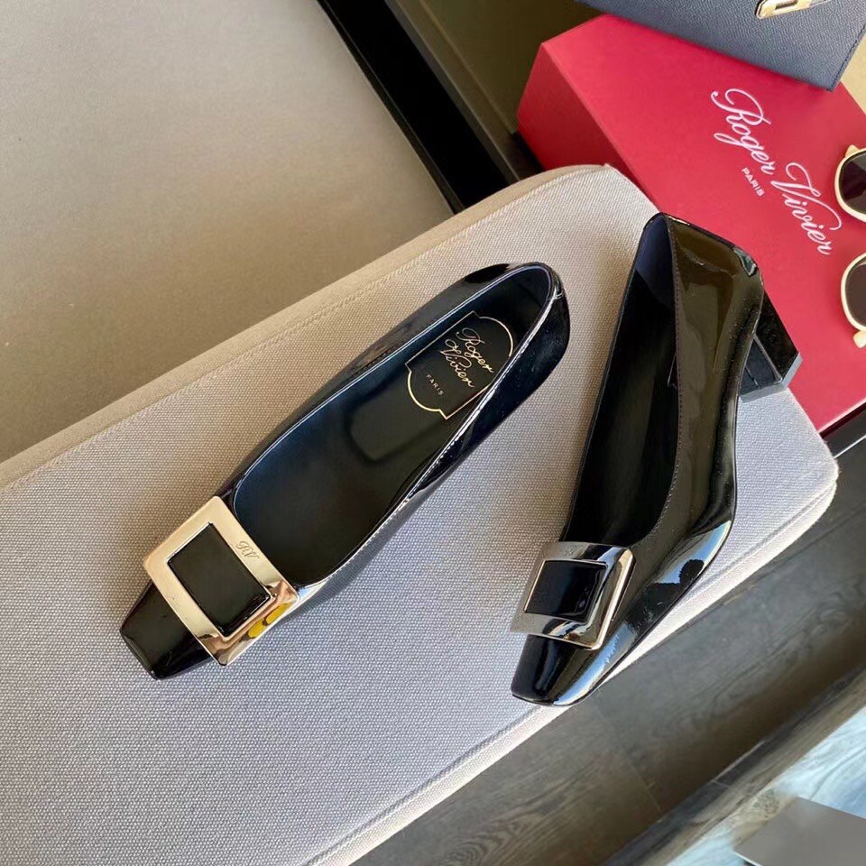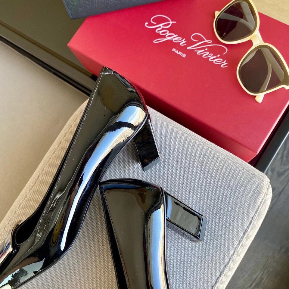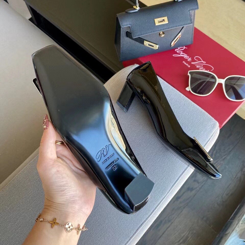 Set on signature 45mm “Skyscraper” heels, the Belle Vivier pumps are testament to Roger Vivier’s elegant approach to design. Crafted from glossy patent calfskin, the silhouette features a square toe bearing the logo-engraved buckle synonymous with the footwear label.