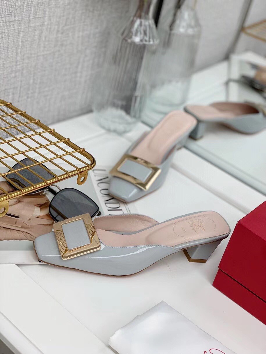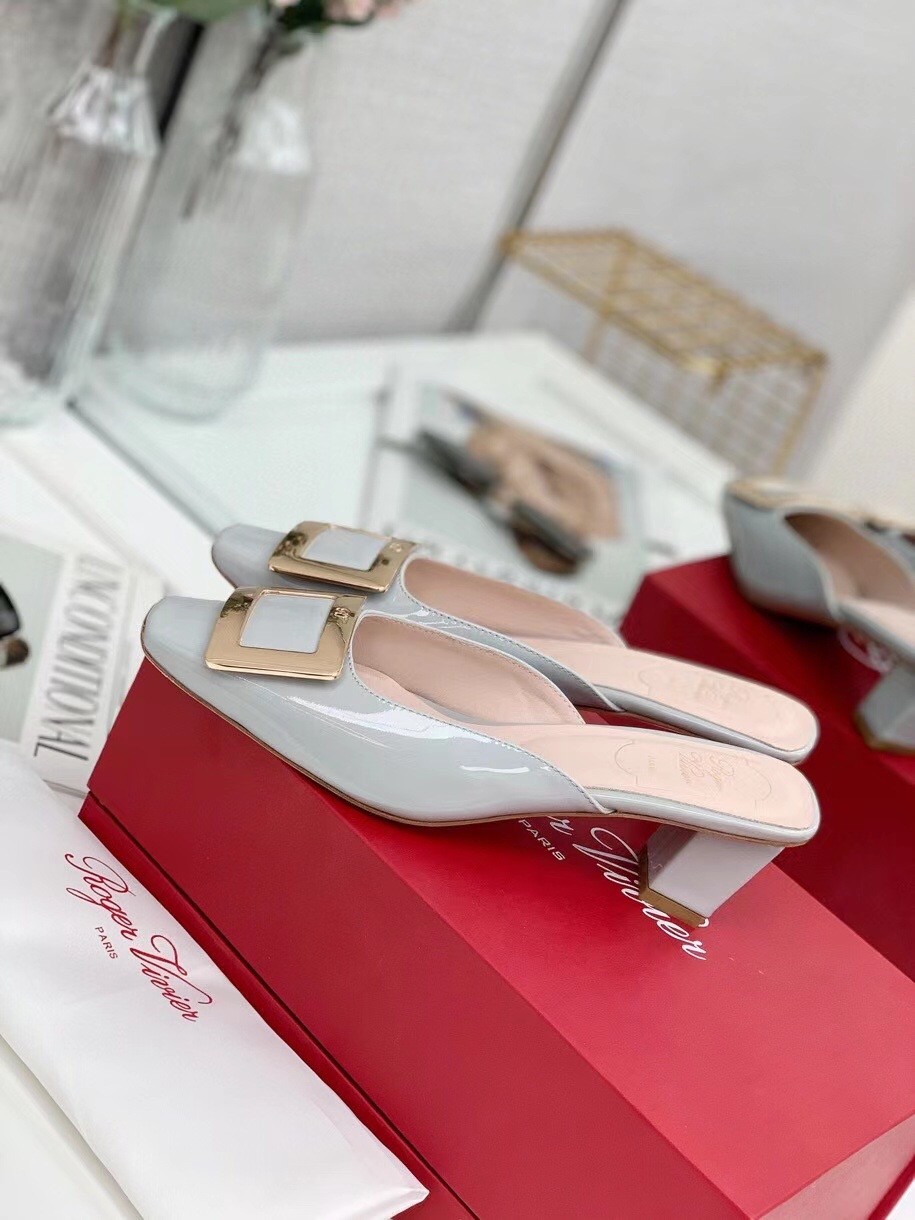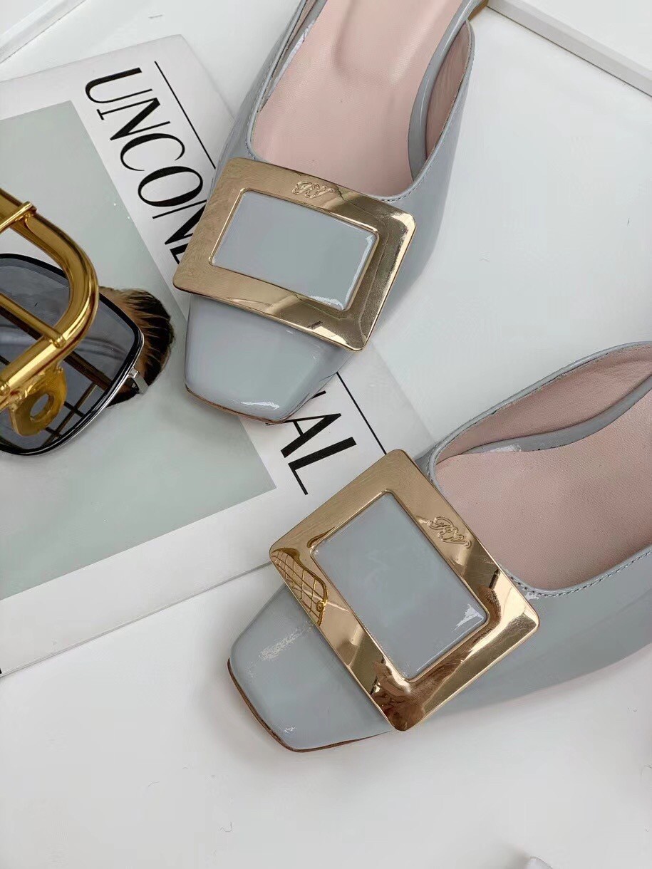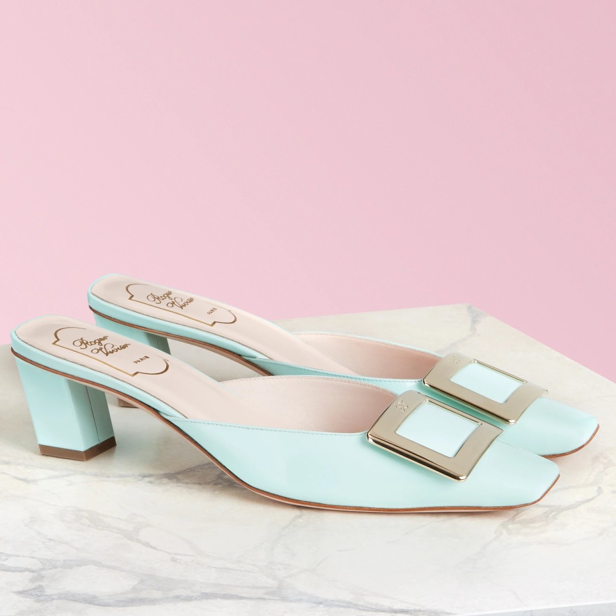 Roger Vivier Belle Vivier Metal Buckle Mules in Blue Patent Leather