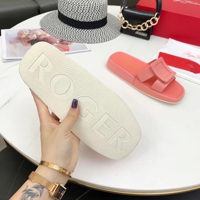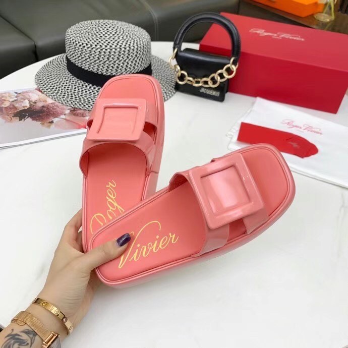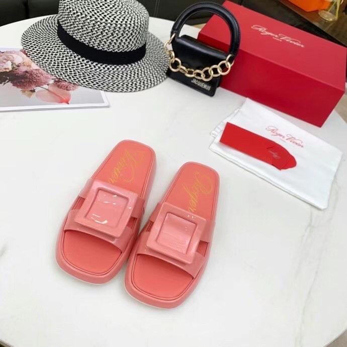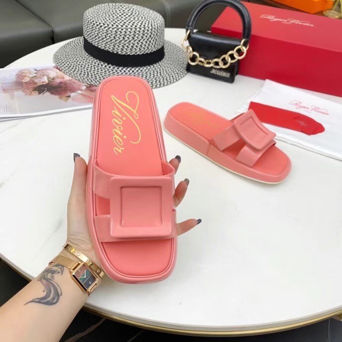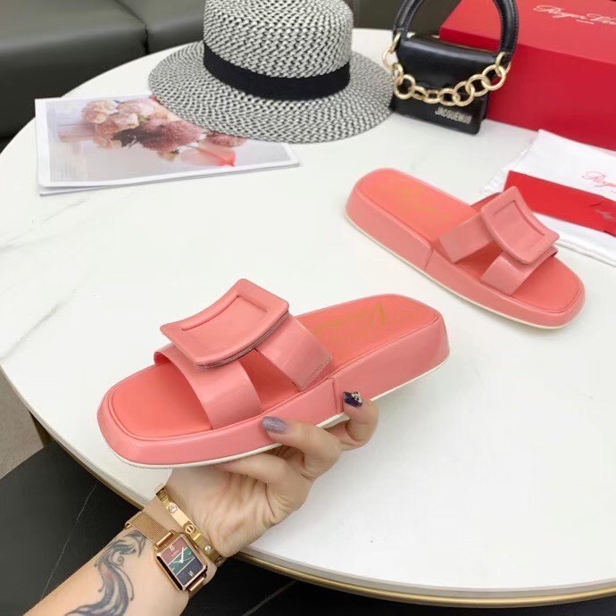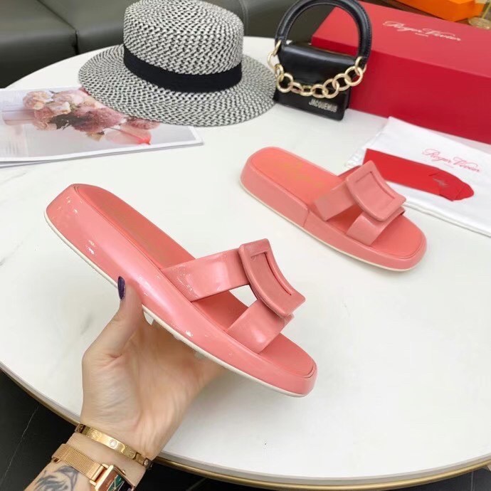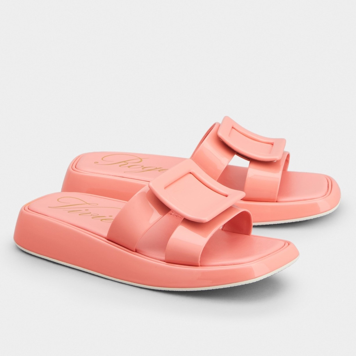 Roger Vivier updates a house signature – oversized square buckles – in contemporary fashion with these Vivier Slide sandals in tone-on-tone pink. The slip-on pair are made from patent leather with matching painted hardware and elevated rubber soles.