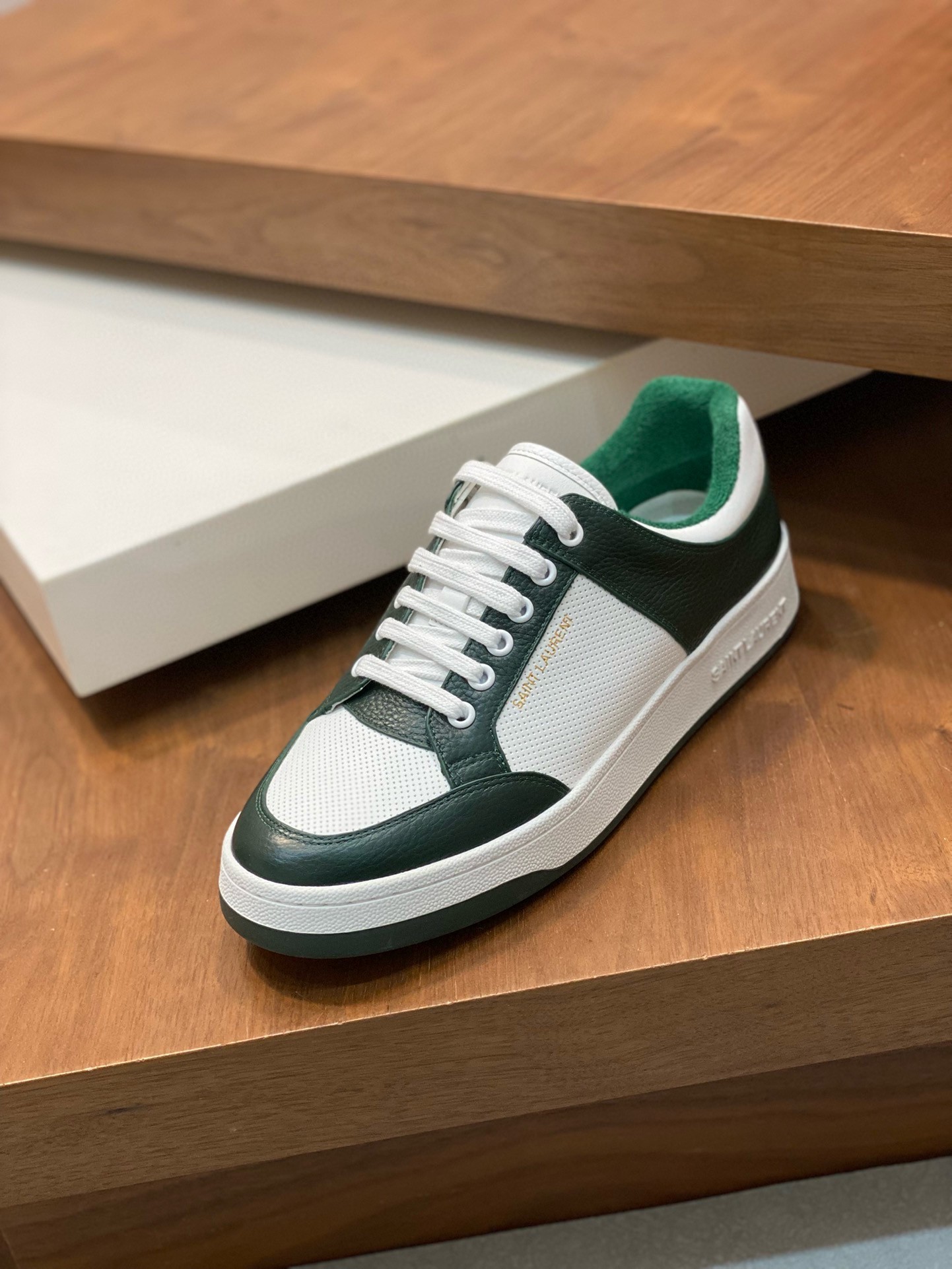 SAINT LAURENT’s SL61 sneakers have been made from supple white leather that’s perforated at the sides and toe box to enhance breathability. They’re paneled with green for a striking contrast and stamped with the brand’s moniker in gold on the heel tab and sides.