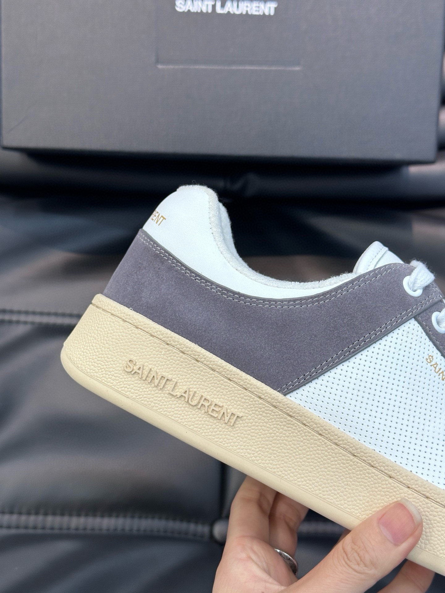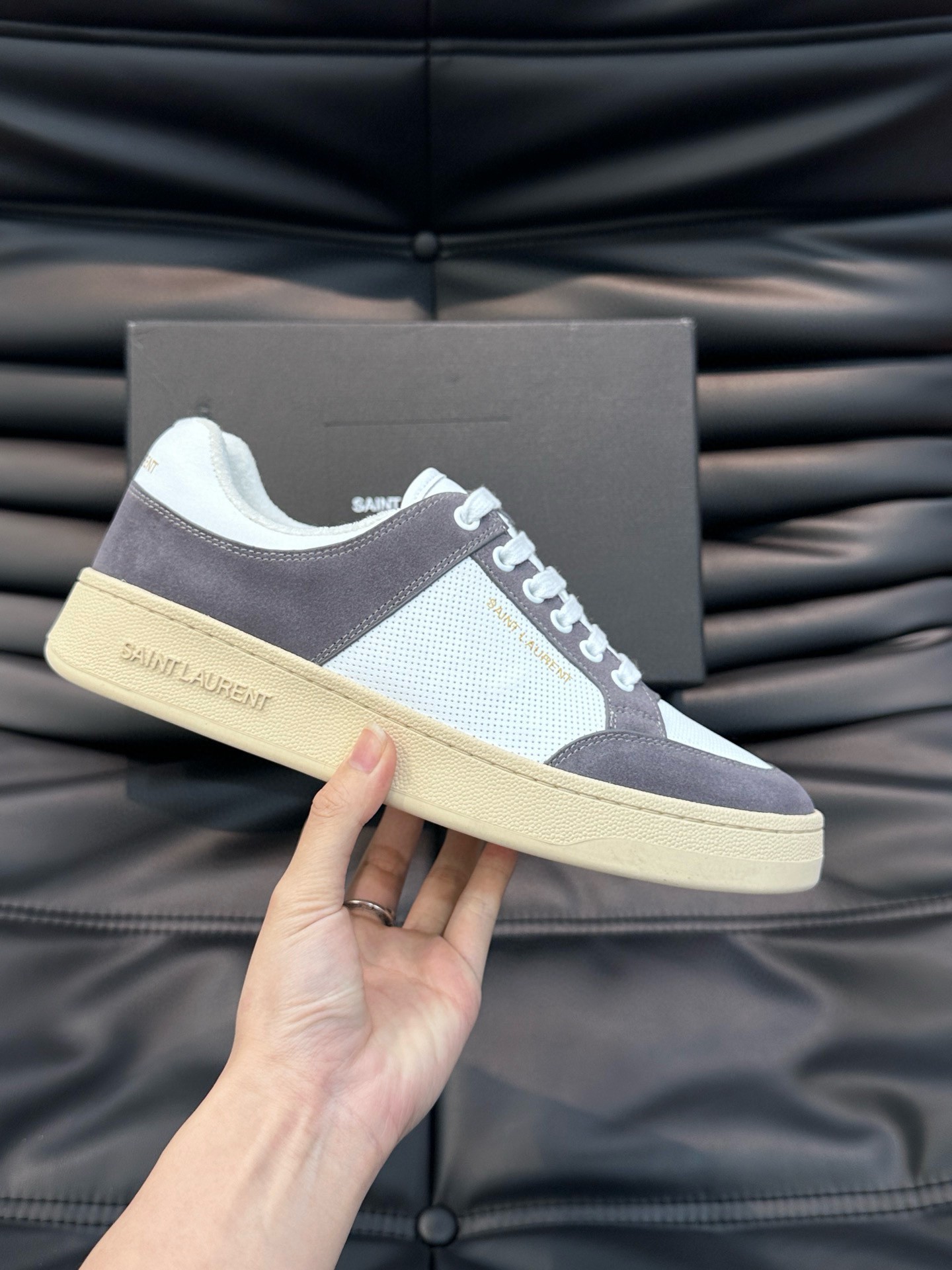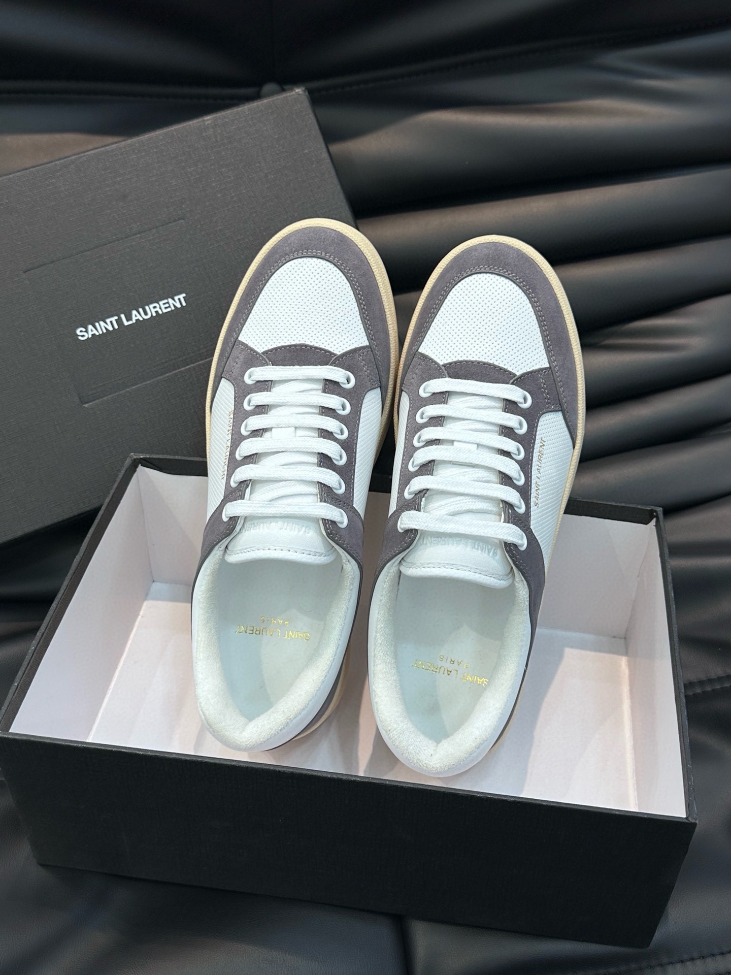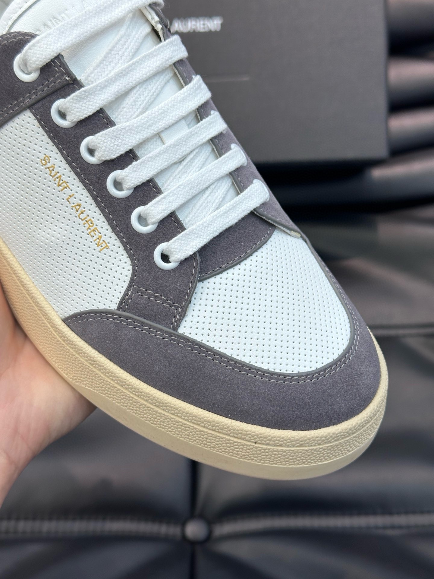 SAINT LAURENT’s SL61 sneakers have been made from supple white leather that’s perforated at the sides and toe box to enhance breathability. They’re paneled with grey for a striking contrast and stamped with the brand’s moniker in gold on the heel tab and sides.