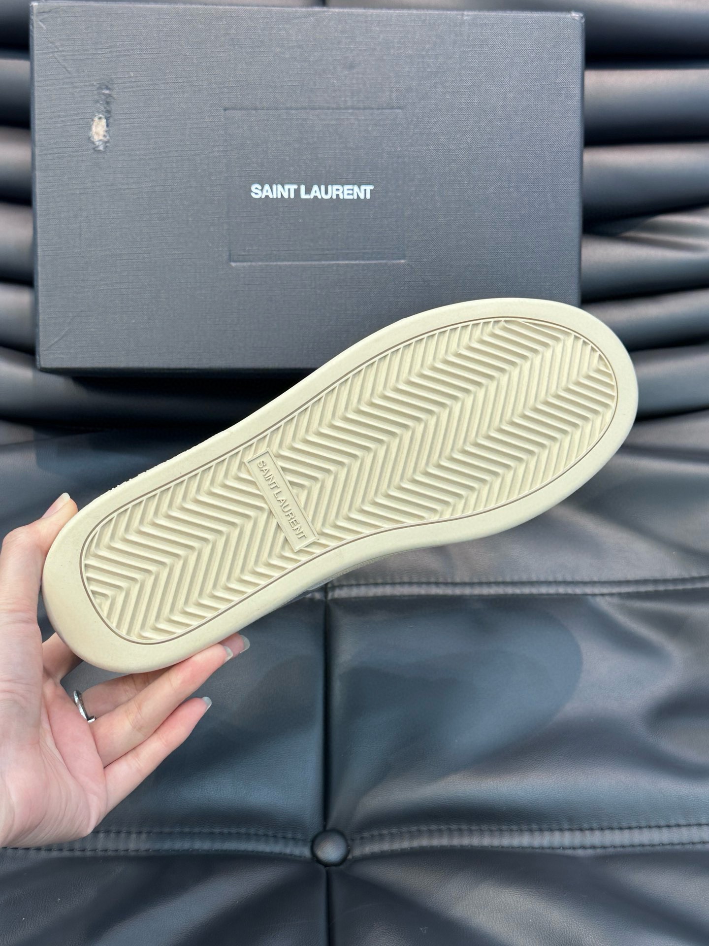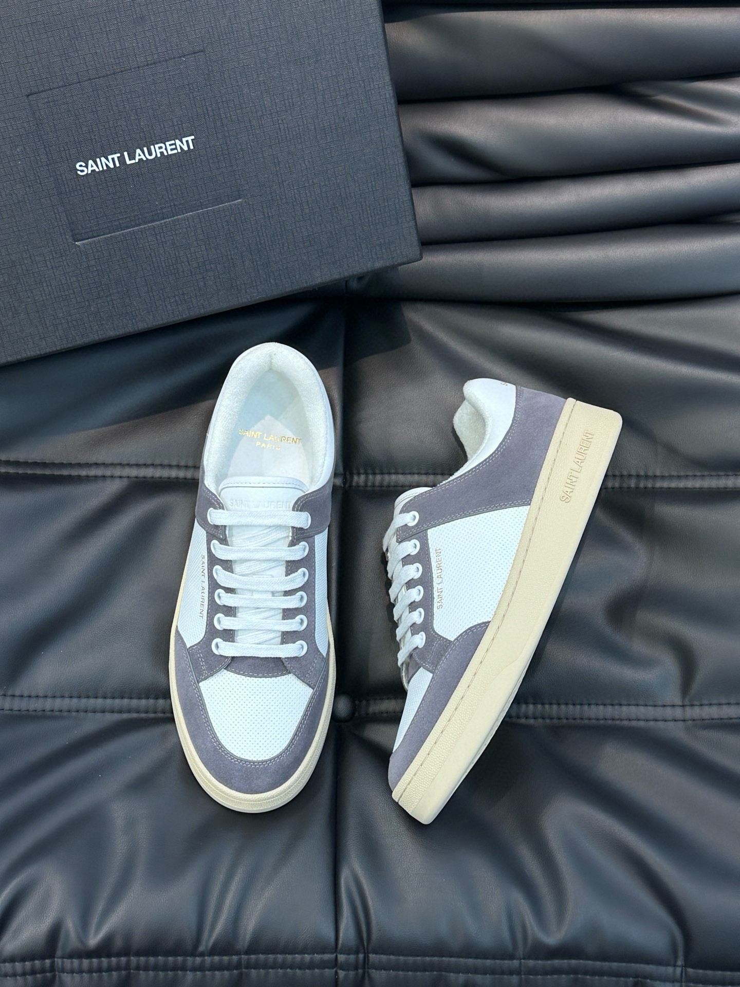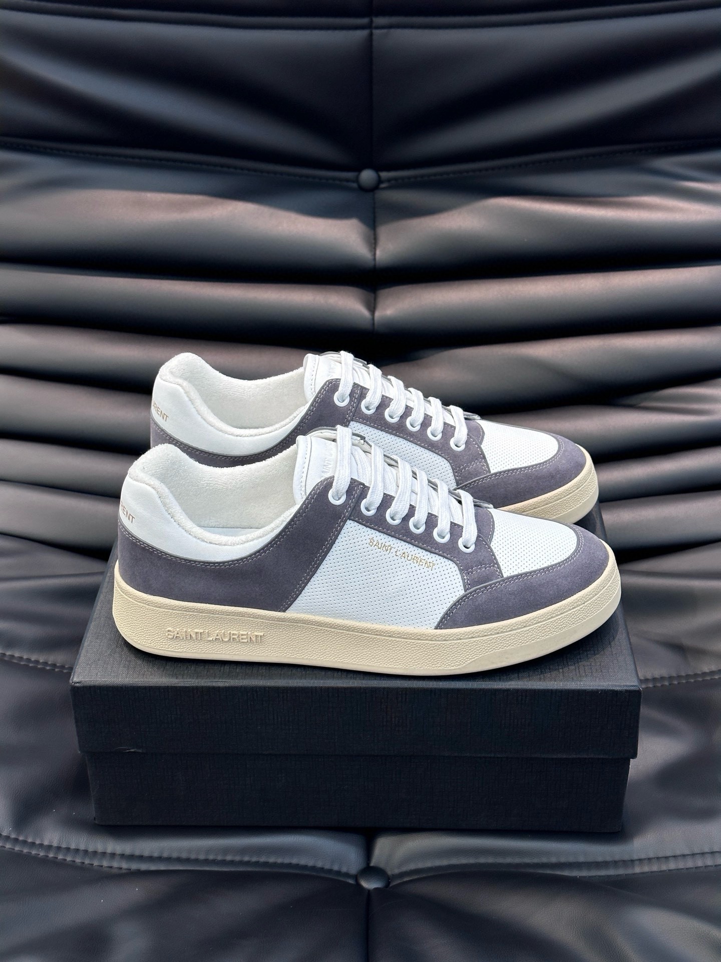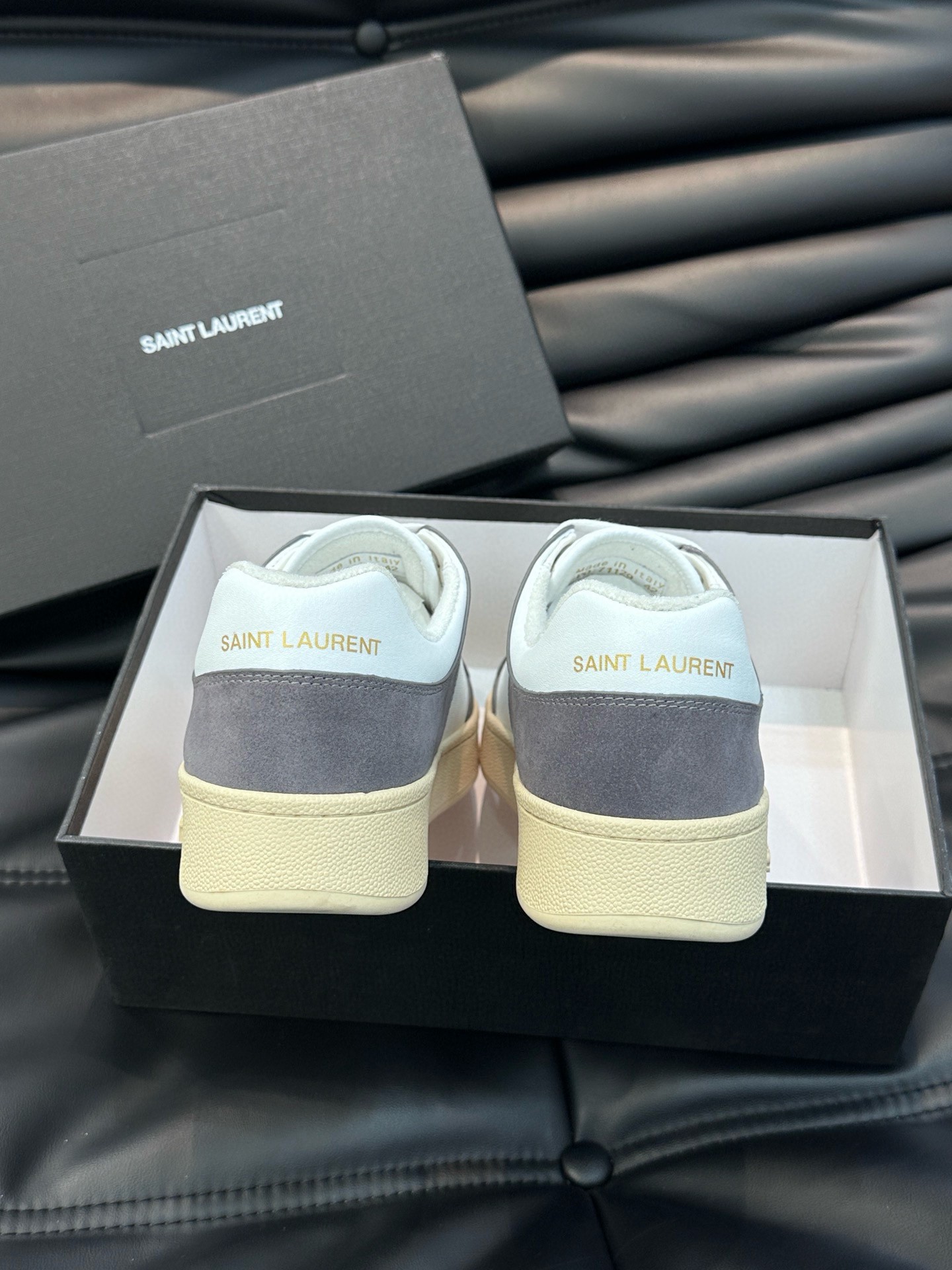 SAINT LAURENT’s SL61 sneakers have been made from supple white leather that’s perforated at the sides and toe box to enhance breathability. They’re paneled with grey for a striking contrast and stamped with the brand’s moniker in gold on the heel tab and sides.