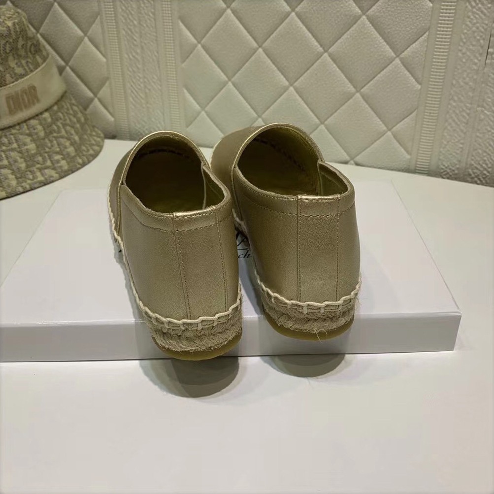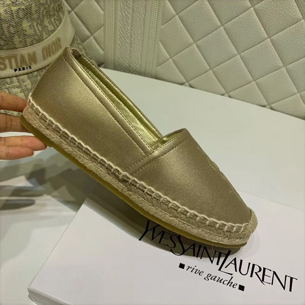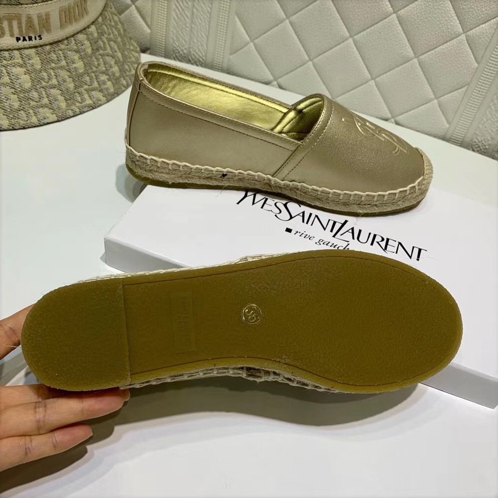 Espadrilles – the quintessential summer shoes – receive the Saint Laurent treatment in gold leather. These flats are made in Spain using traditional techniques to create their classic features: braided jute soles and loop-stitched uppers. Embossed YSL monograms top the toes, providing a small break from tradition.