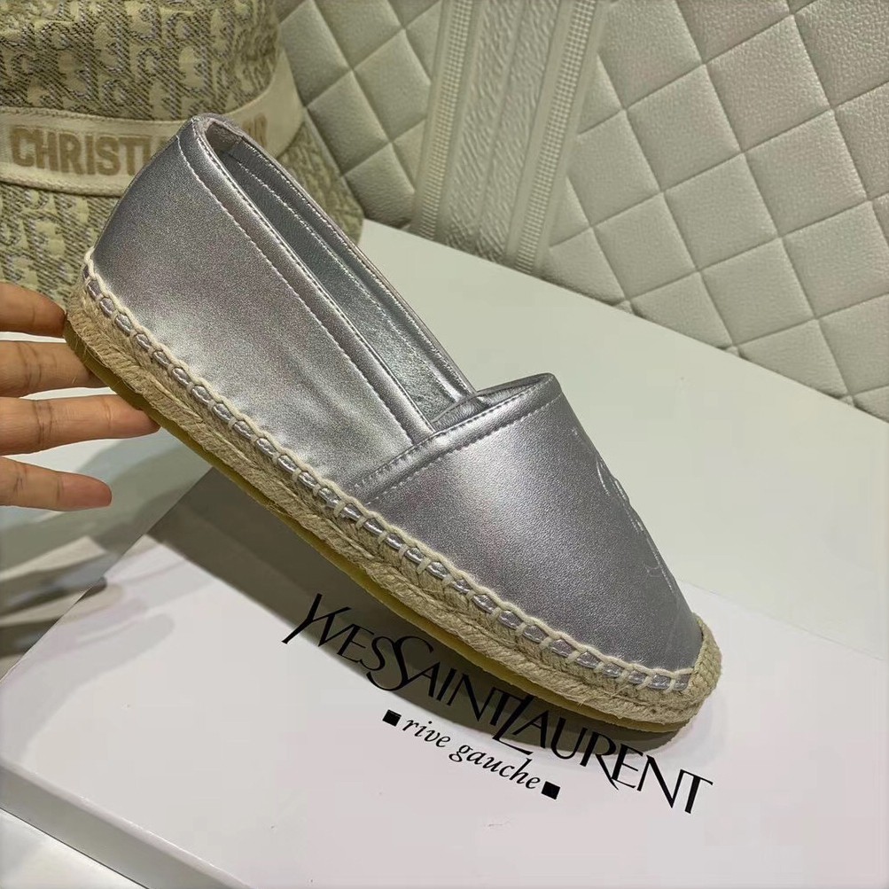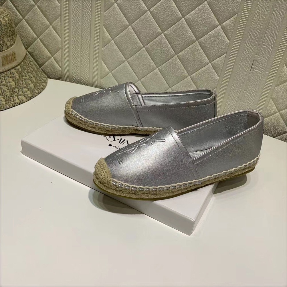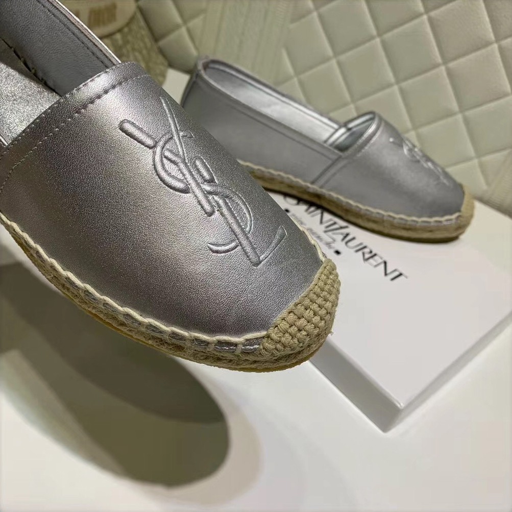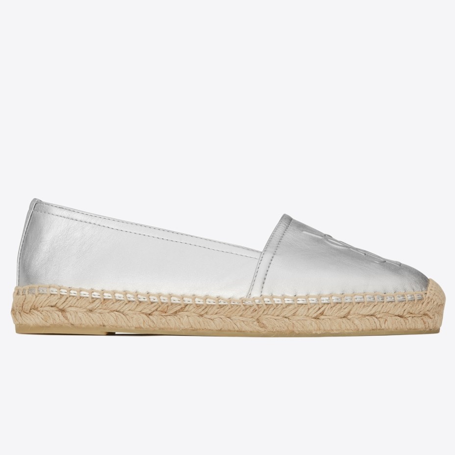 Espadrilles – the quintessential summer shoes – receive the Saint Laurent treatment in silver leather. These flats are made in Spain using traditional techniques to create their classic features: braided jute soles and loop-stitched uppers. Embossed YSL monograms top the toes, providing a small break from tradition.
