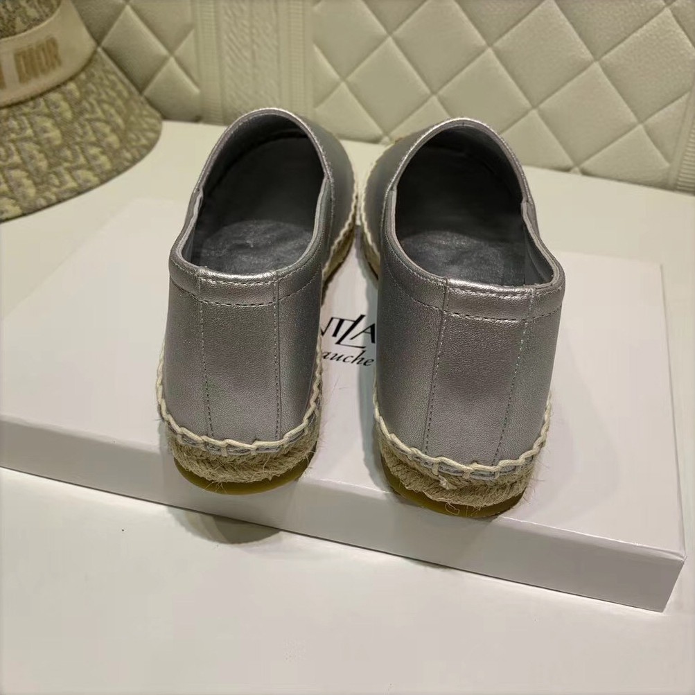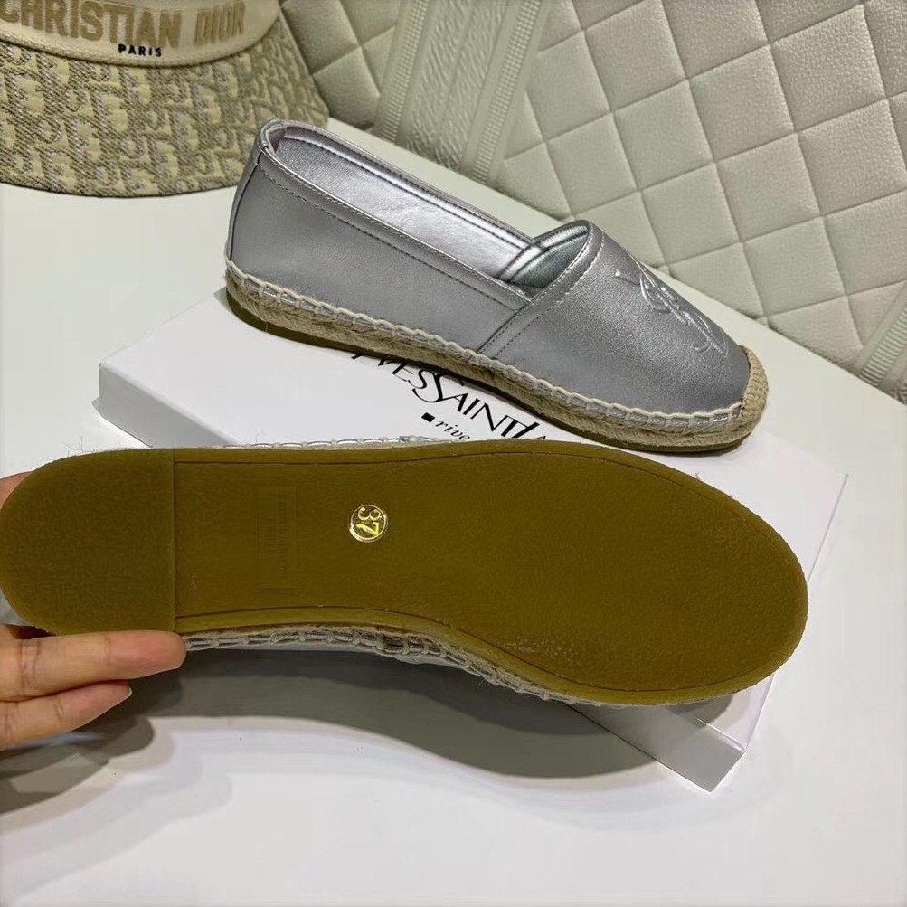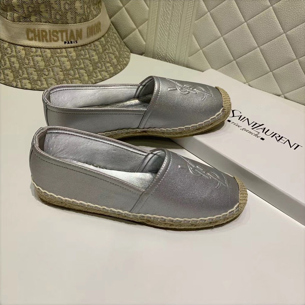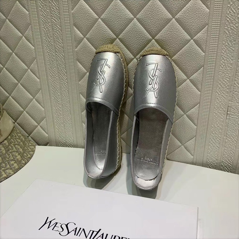 Espadrilles – the quintessential summer shoes – receive the Saint Laurent treatment in silver leather. These flats are made in Spain using traditional techniques to create their classic features: braided jute soles and loop-stitched uppers. Embossed YSL monograms top the toes, providing a small break from tradition.
