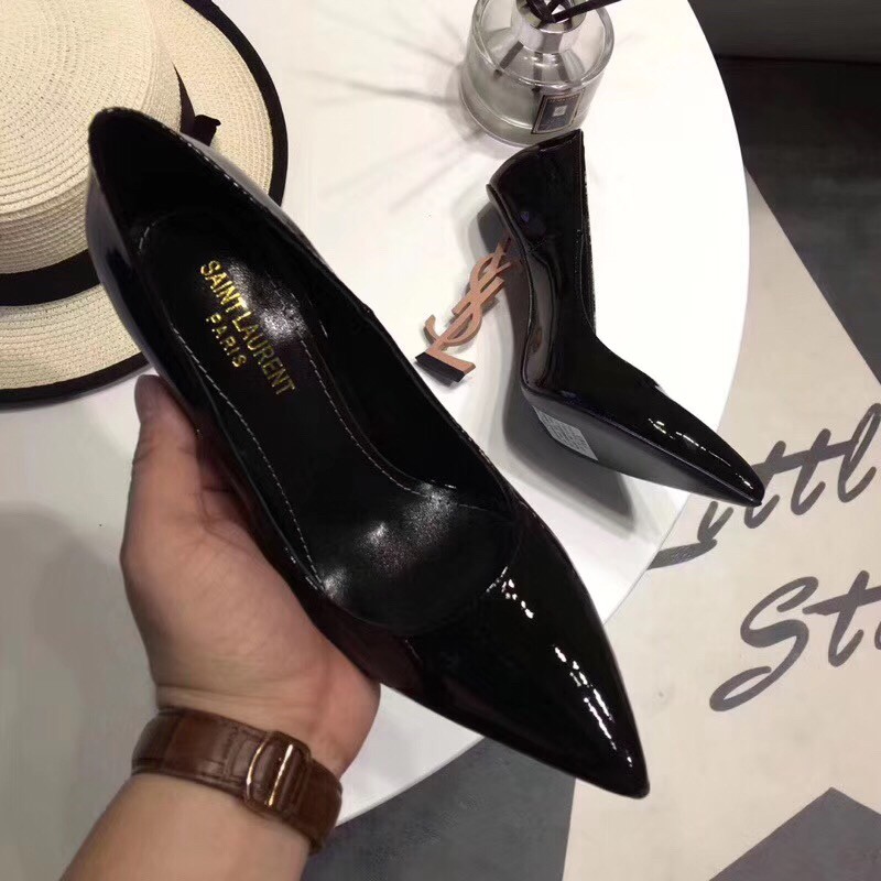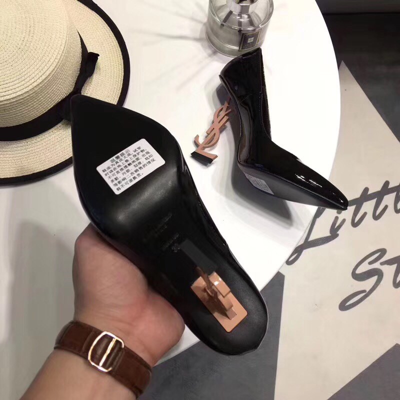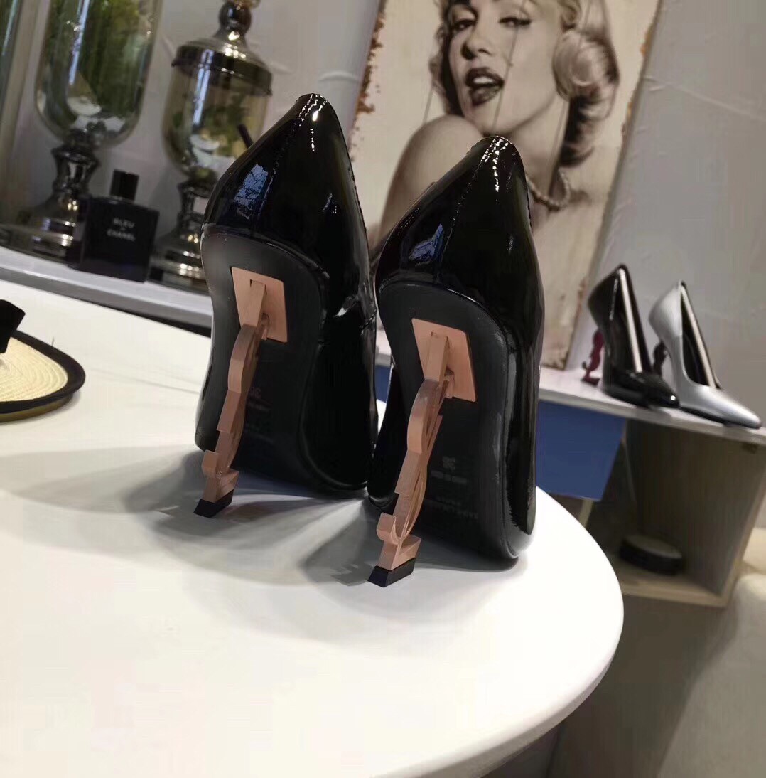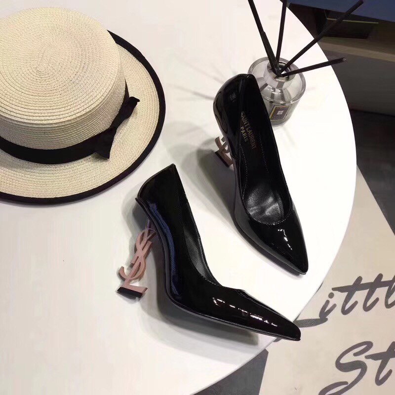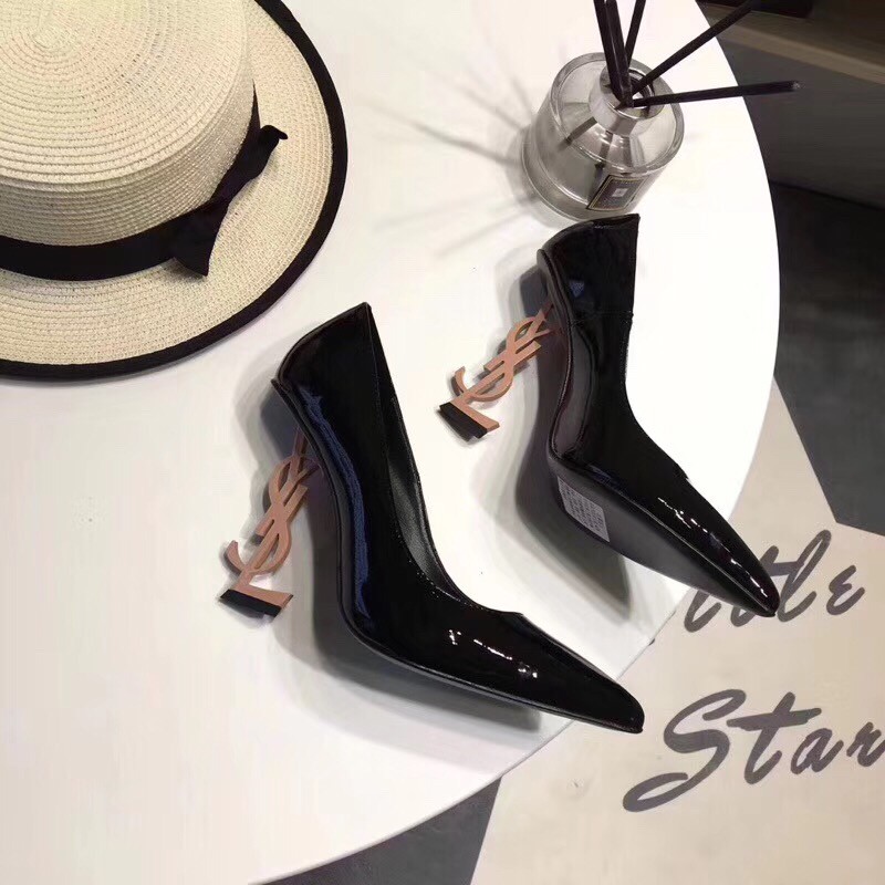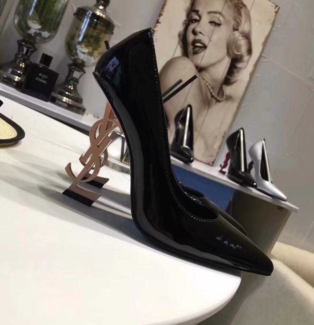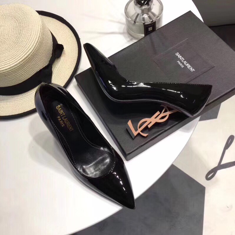 – Structural metal interlocking YSL signature heel and low-cut vamp