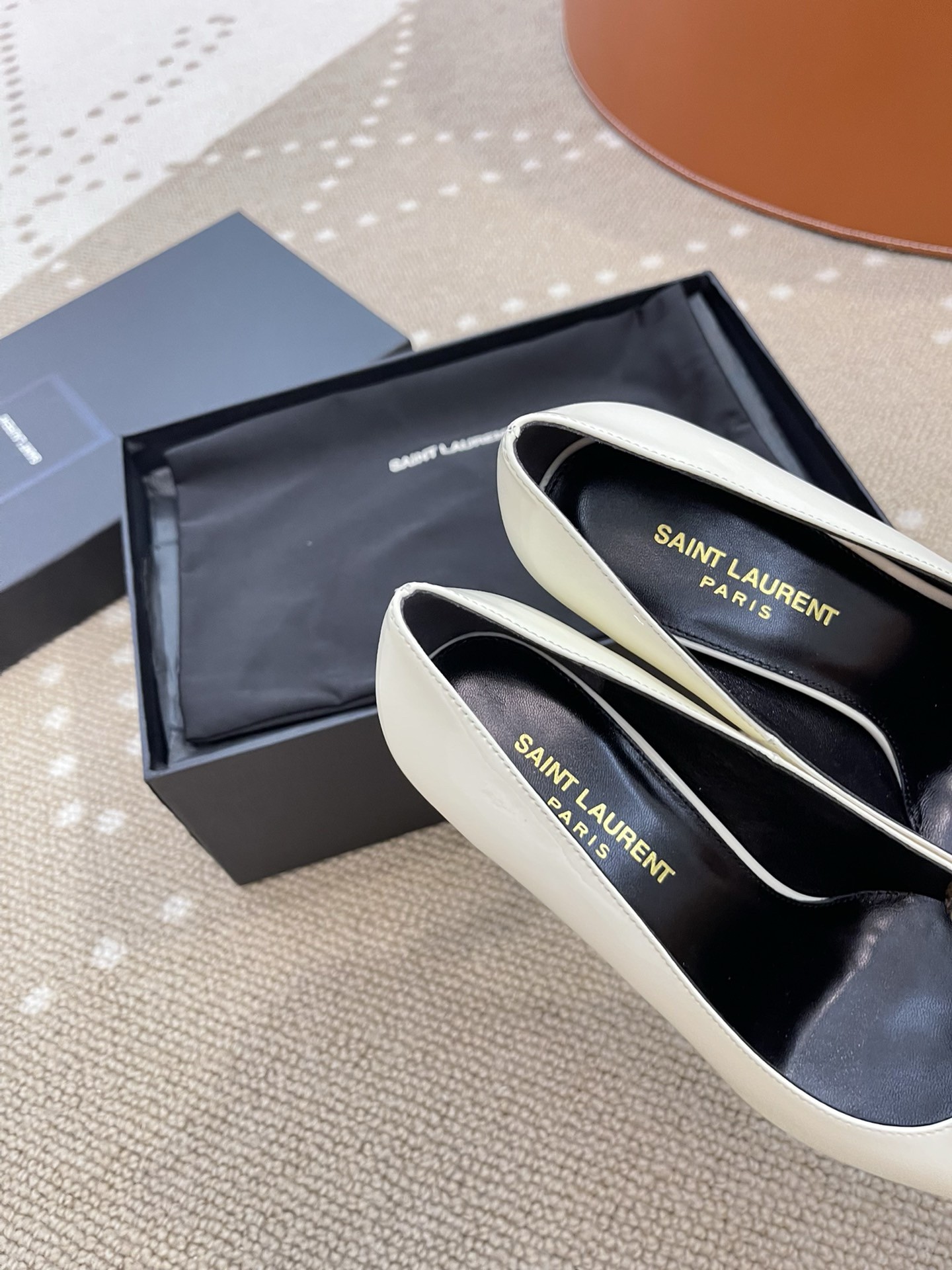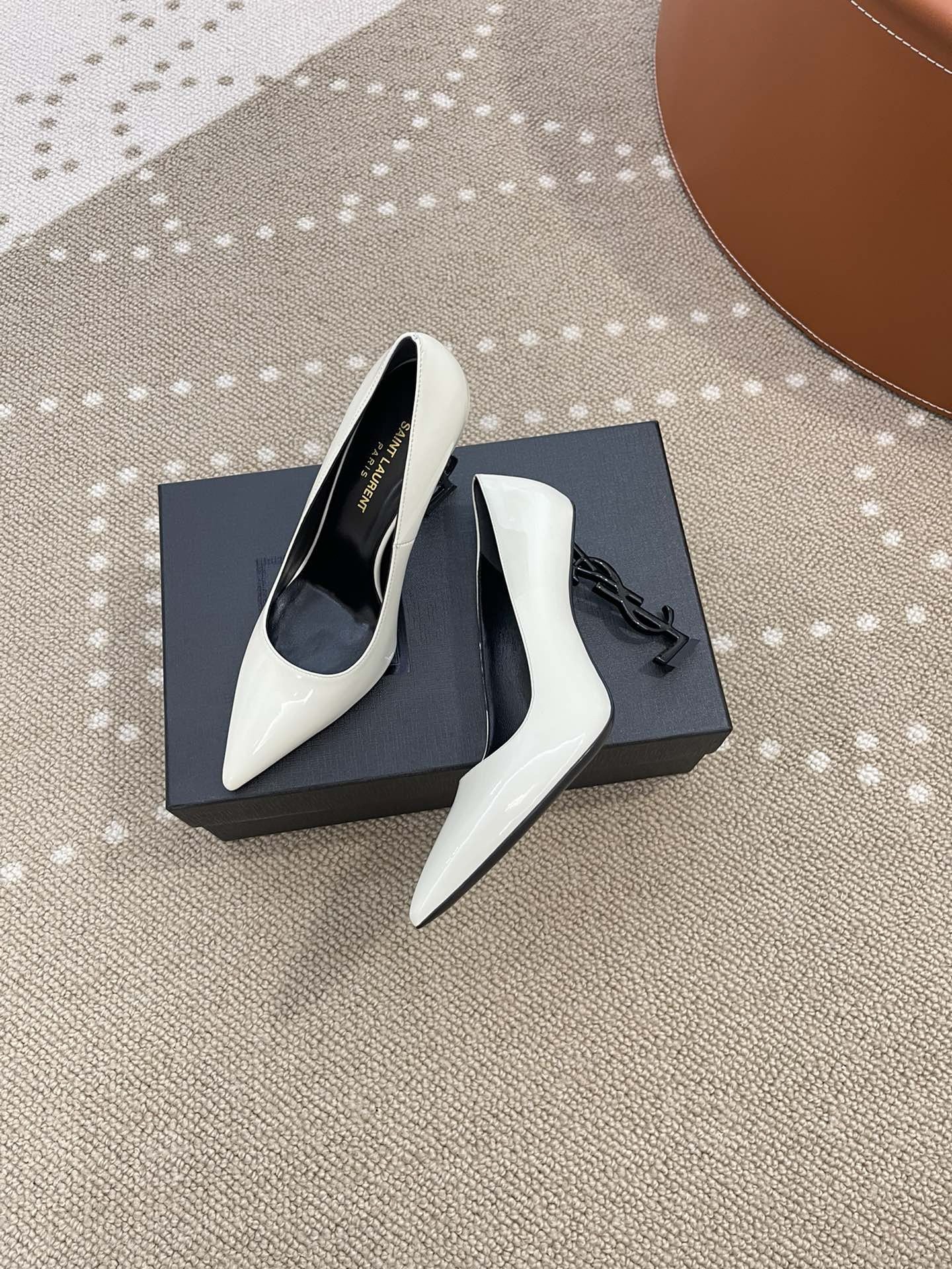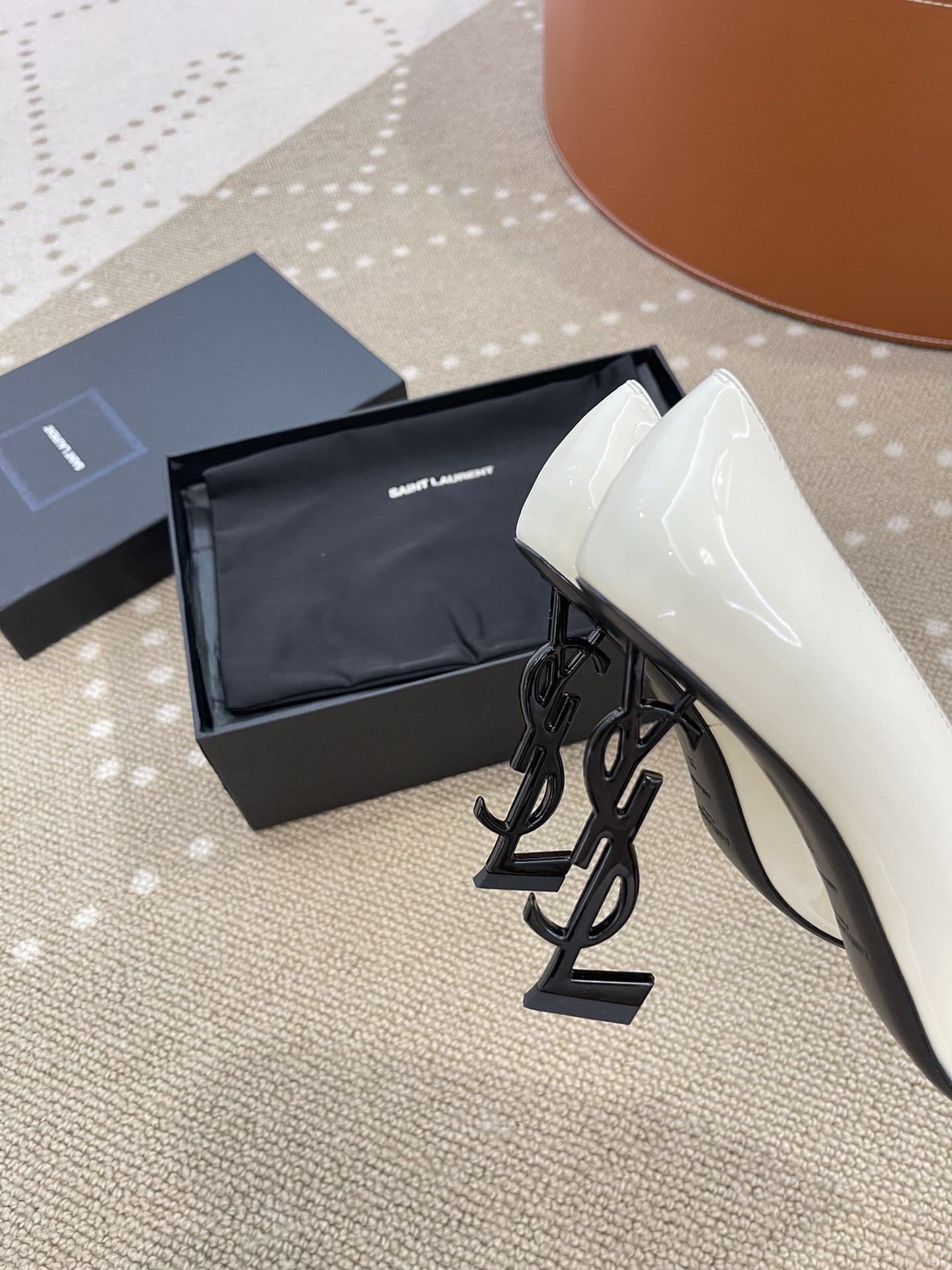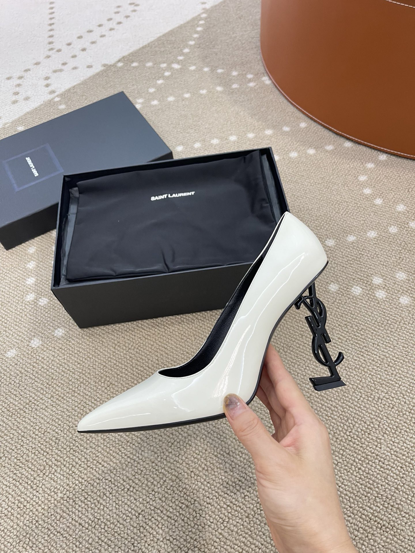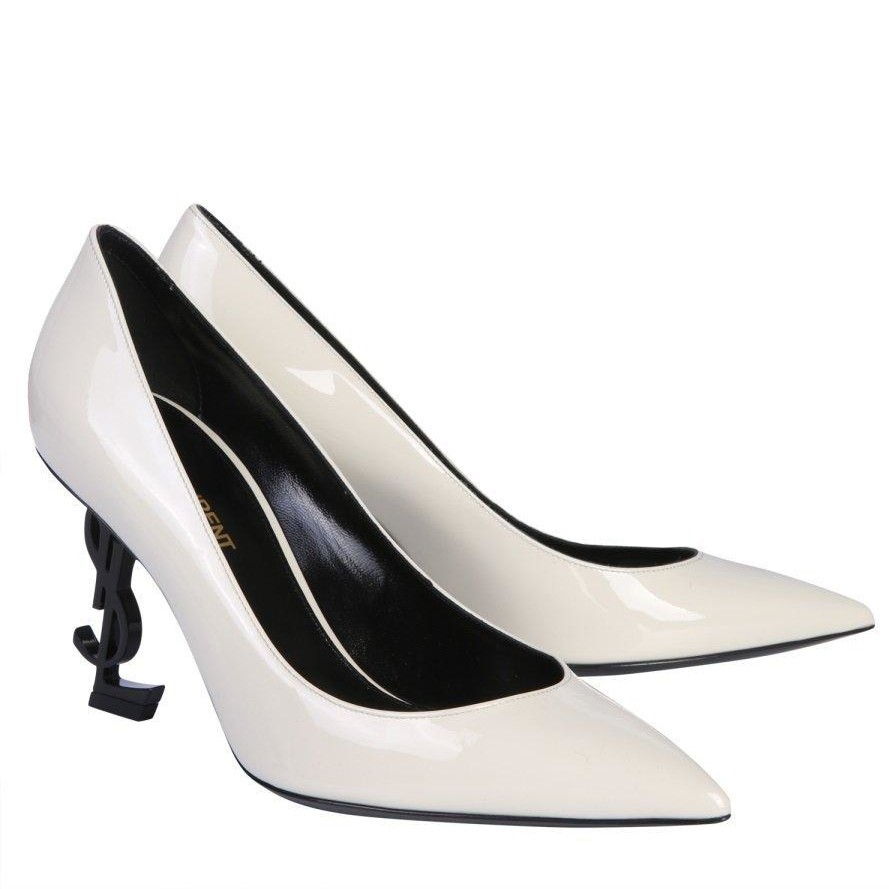 Saint Laurent Opyum 110 Pumps In White Patent Leather with Black Heel