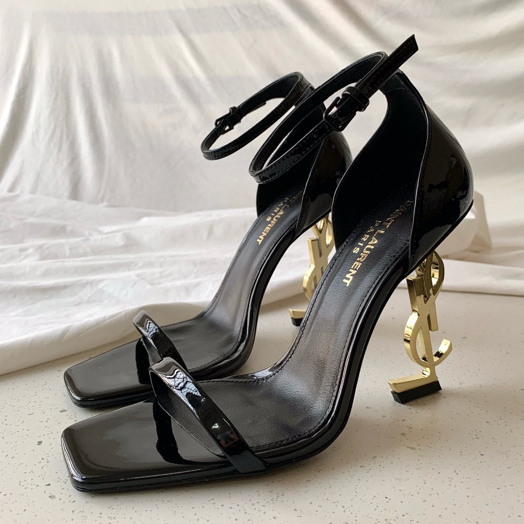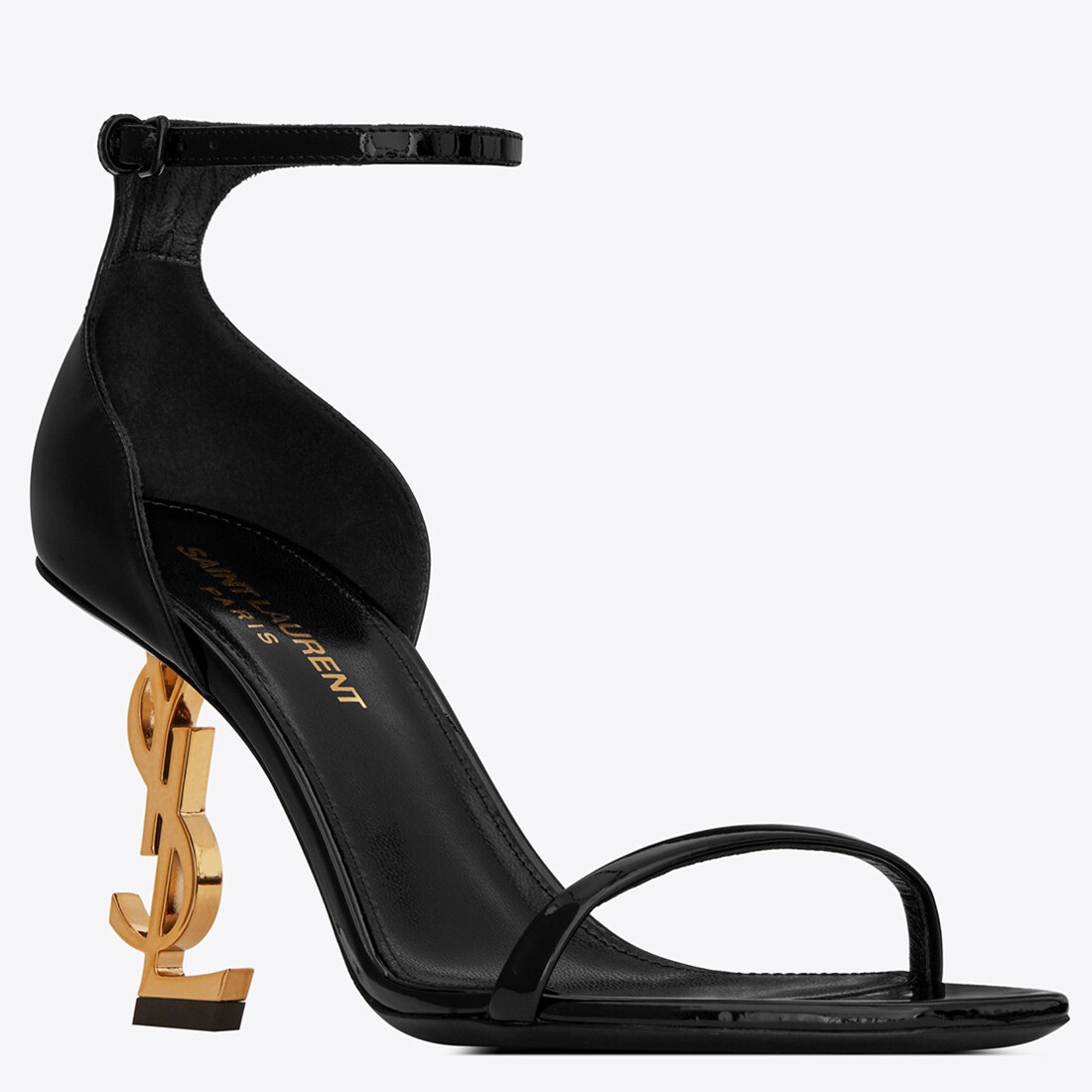 Saint Laurent Opyum 85mm Sandals in Black Patent Leather with Gold YSL Heel