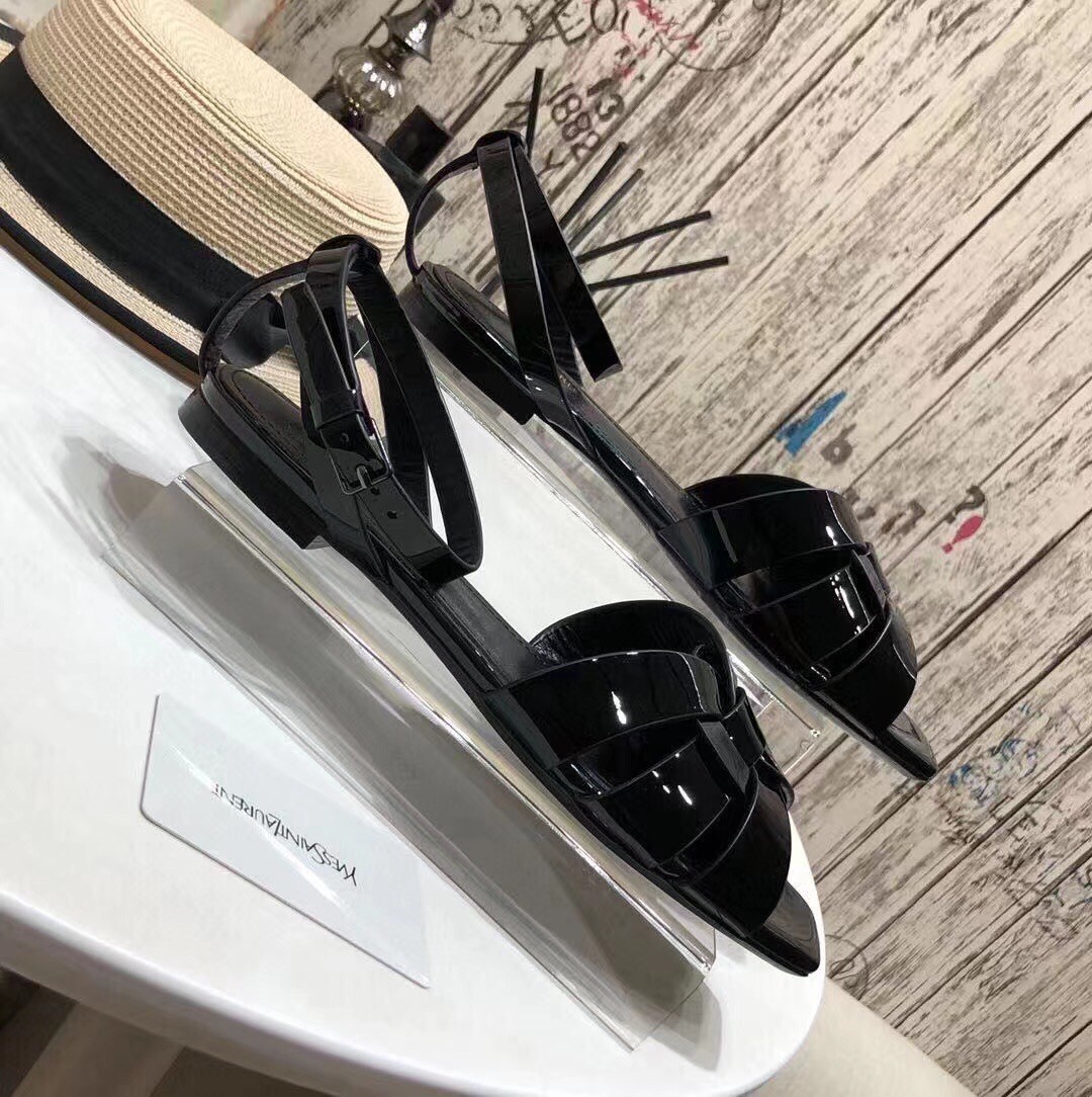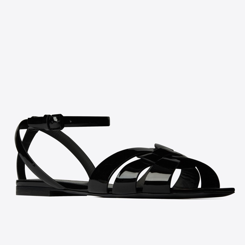 Tap Saint Laurent’s timeless approach to warm-weather dressing with the Tribute sandals, rendered here in a flat silhouette. Made from glossy patent leather, they have the style’s signature interlocking straps at the square toe, then secure with wraparound straps at the ankle. Style with fluid separates during strolls along the seafront.