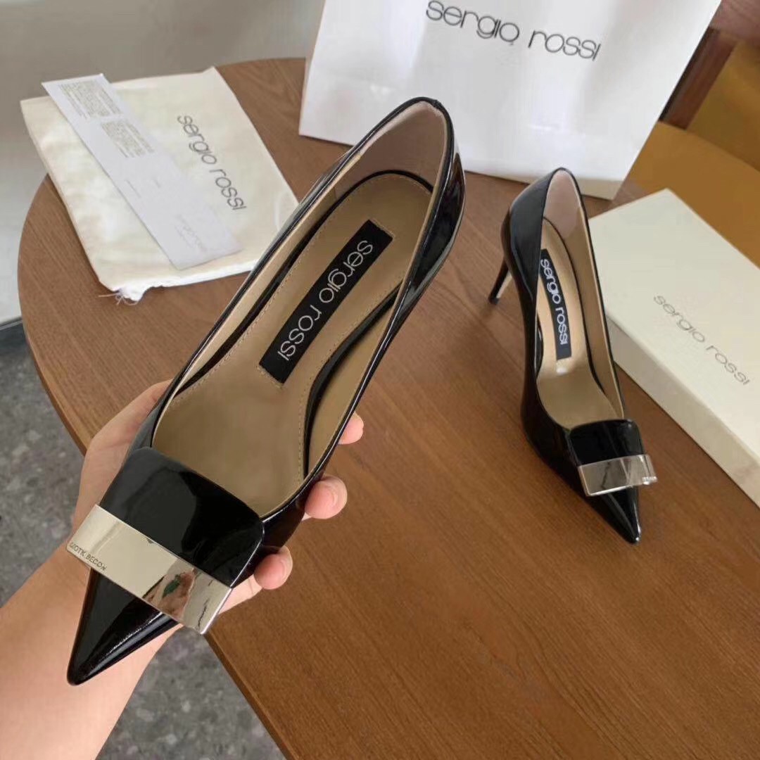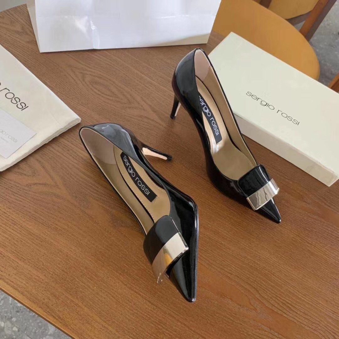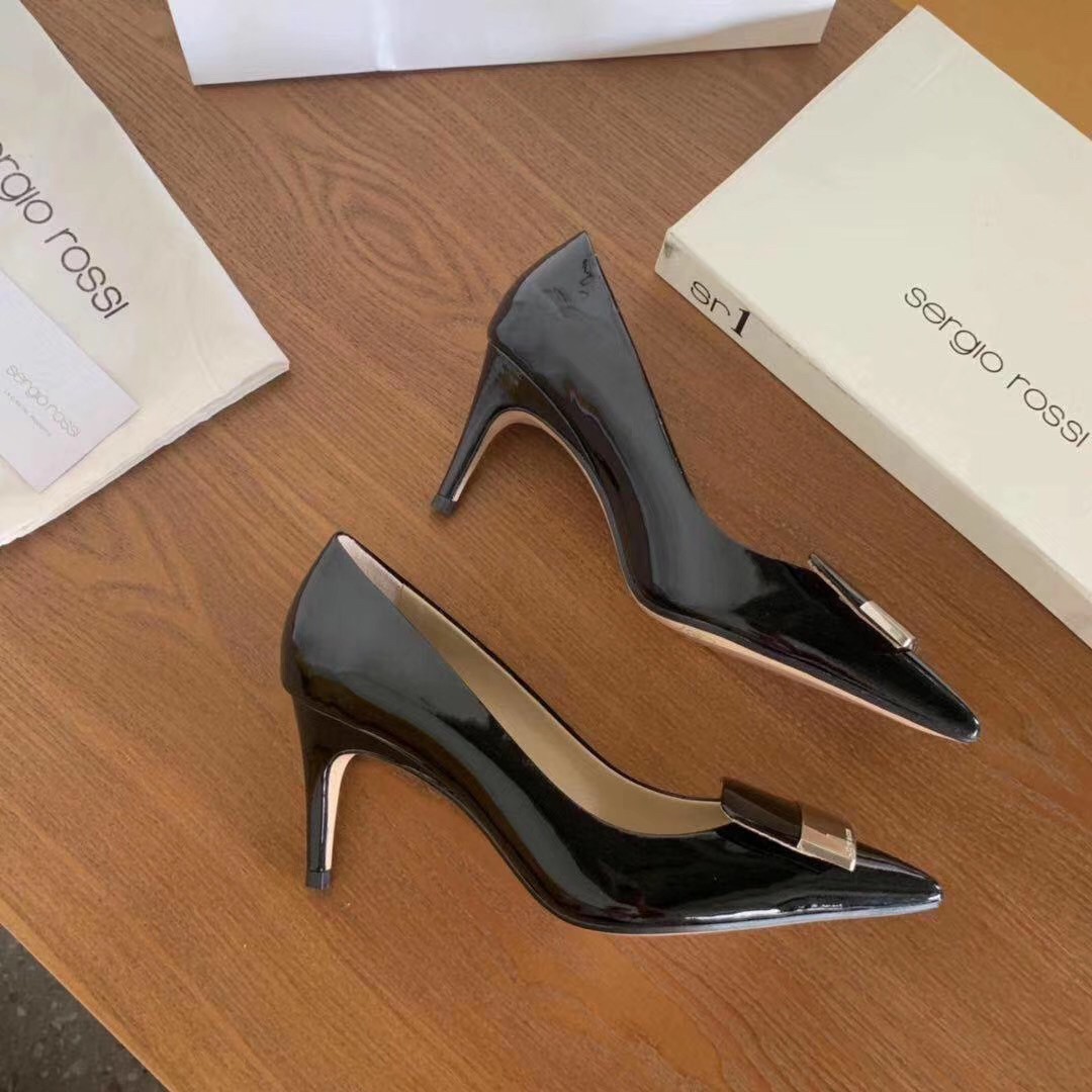 These pointed sr1 pumps with a midi-heel in glossy patent leather flaunt minimalist style. The iconic and distinctive silver-tone metal plate will add some extra shine to contemporary outfits.