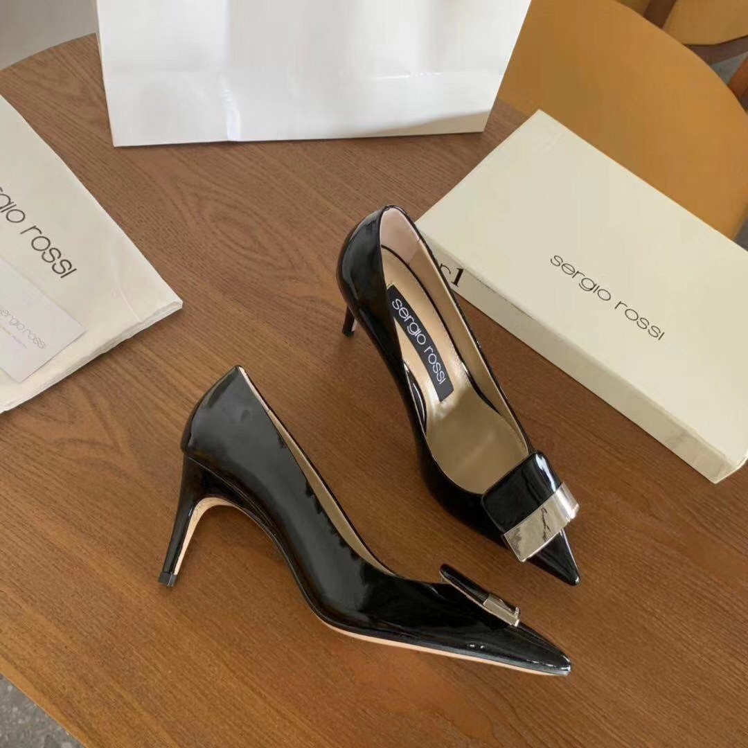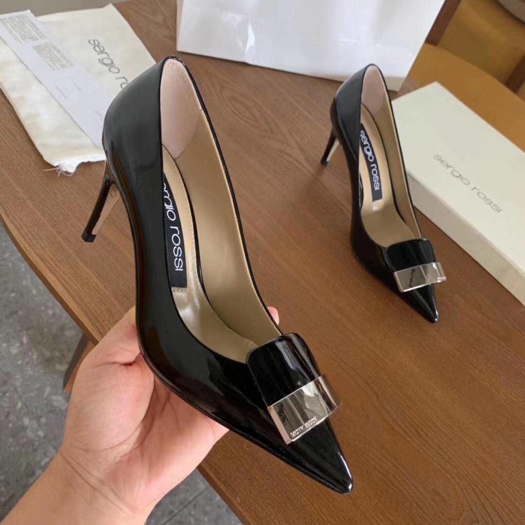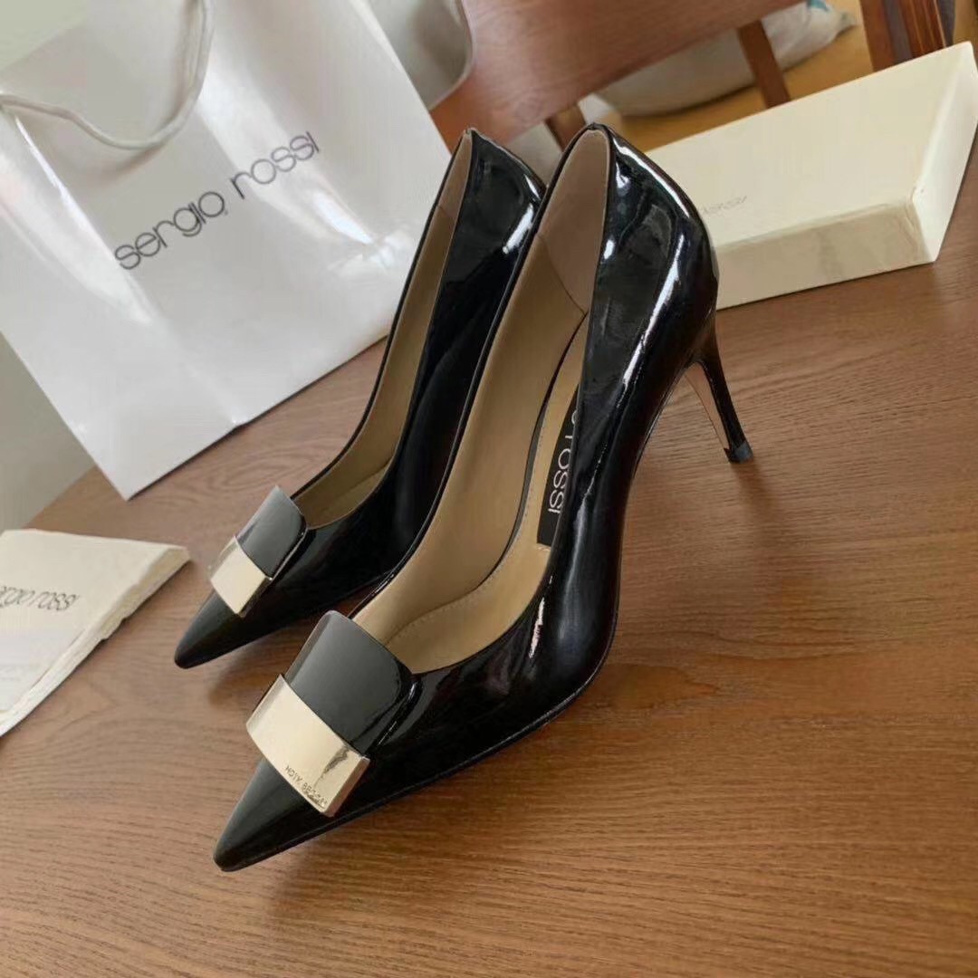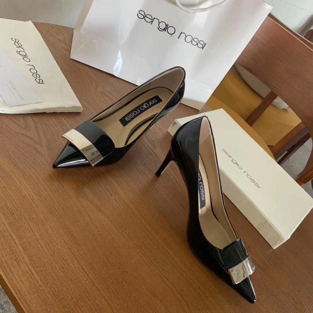 These pointed sr1 pumps with a midi-heel in glossy patent leather flaunt minimalist style. The iconic and distinctive silver-tone metal plate will add some extra shine to contemporary outfits.