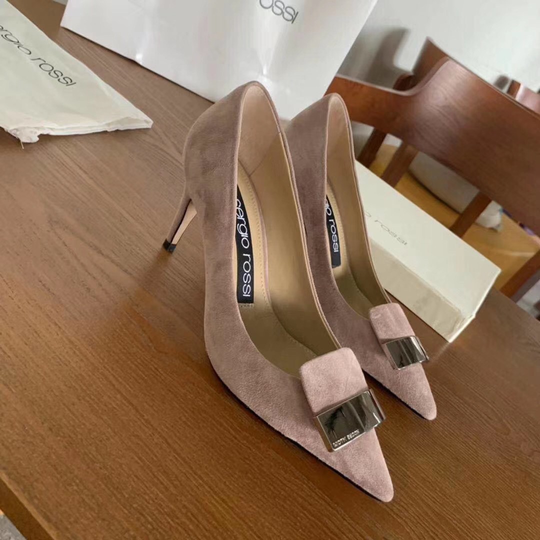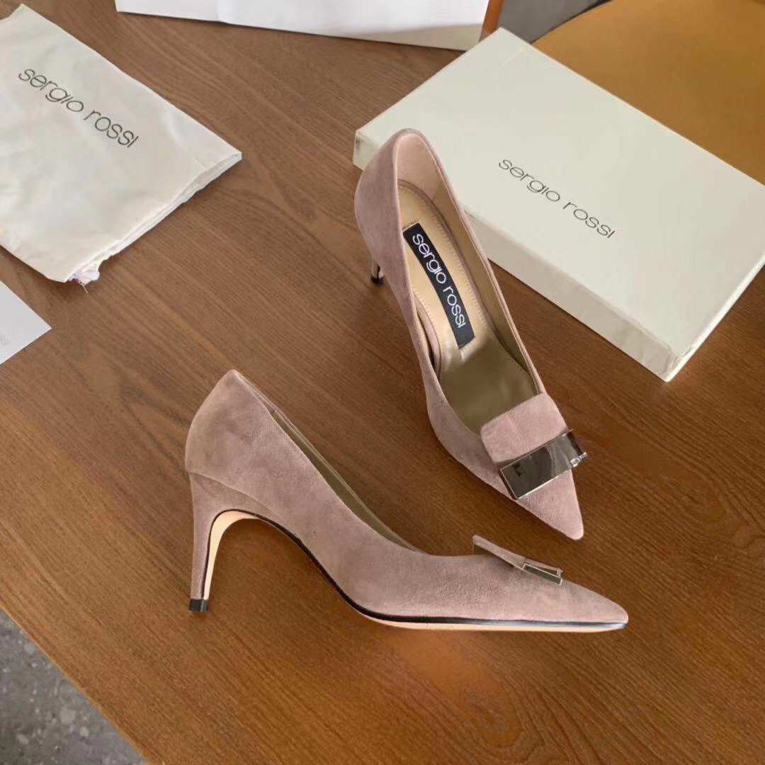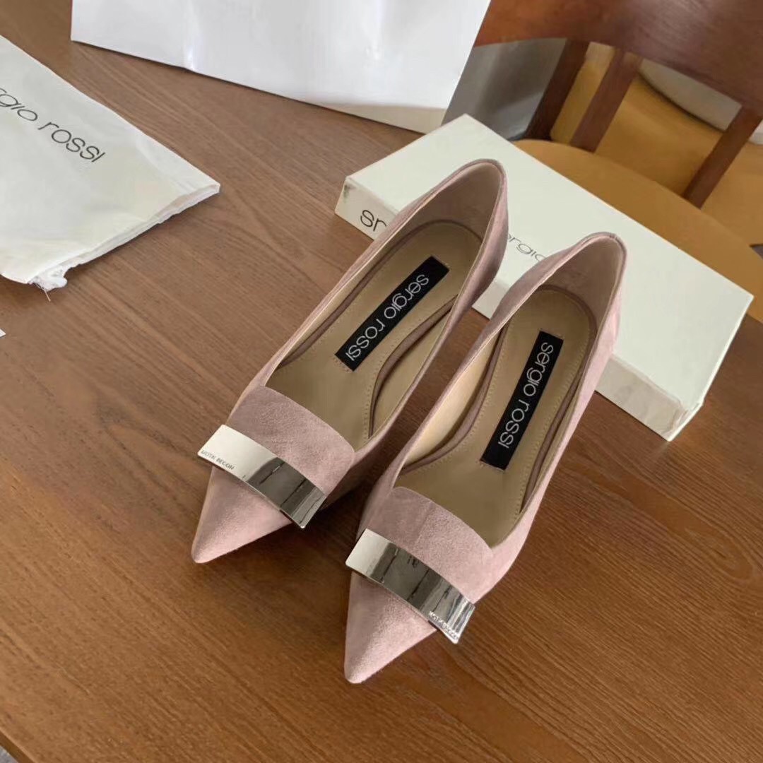 The sr1 pointed pump in suede leather with a midi heel exudes casual femininity. The precious silver-plated metal plaque completes the design with an unexpected touch of light for an authentic style statement.